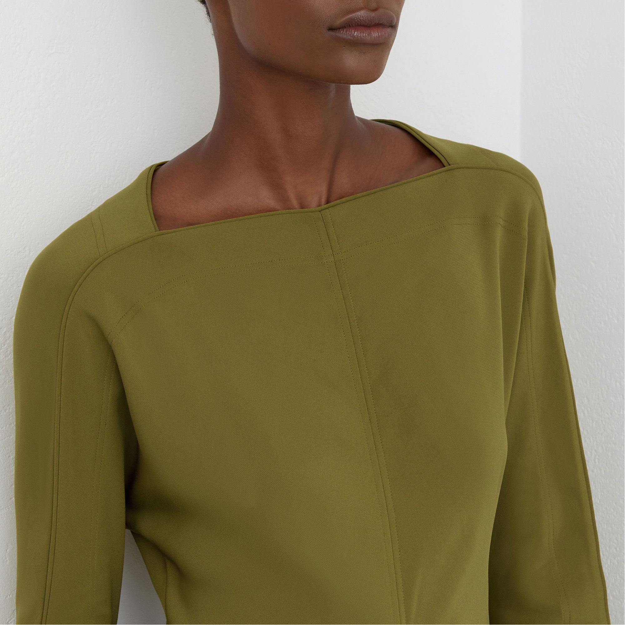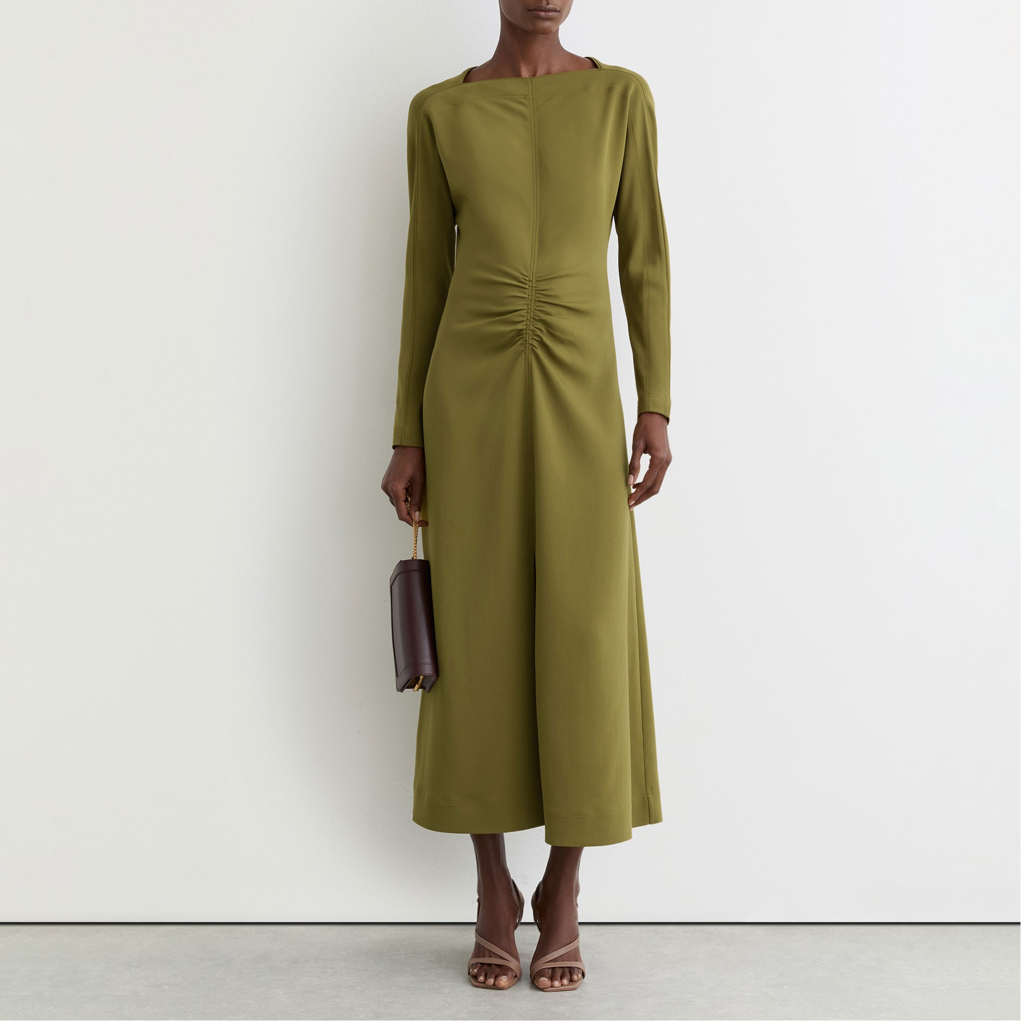 - Ruching at front-waist and back, high square neckline, long sleeves, central front slit, button keyhole with concealed back zip