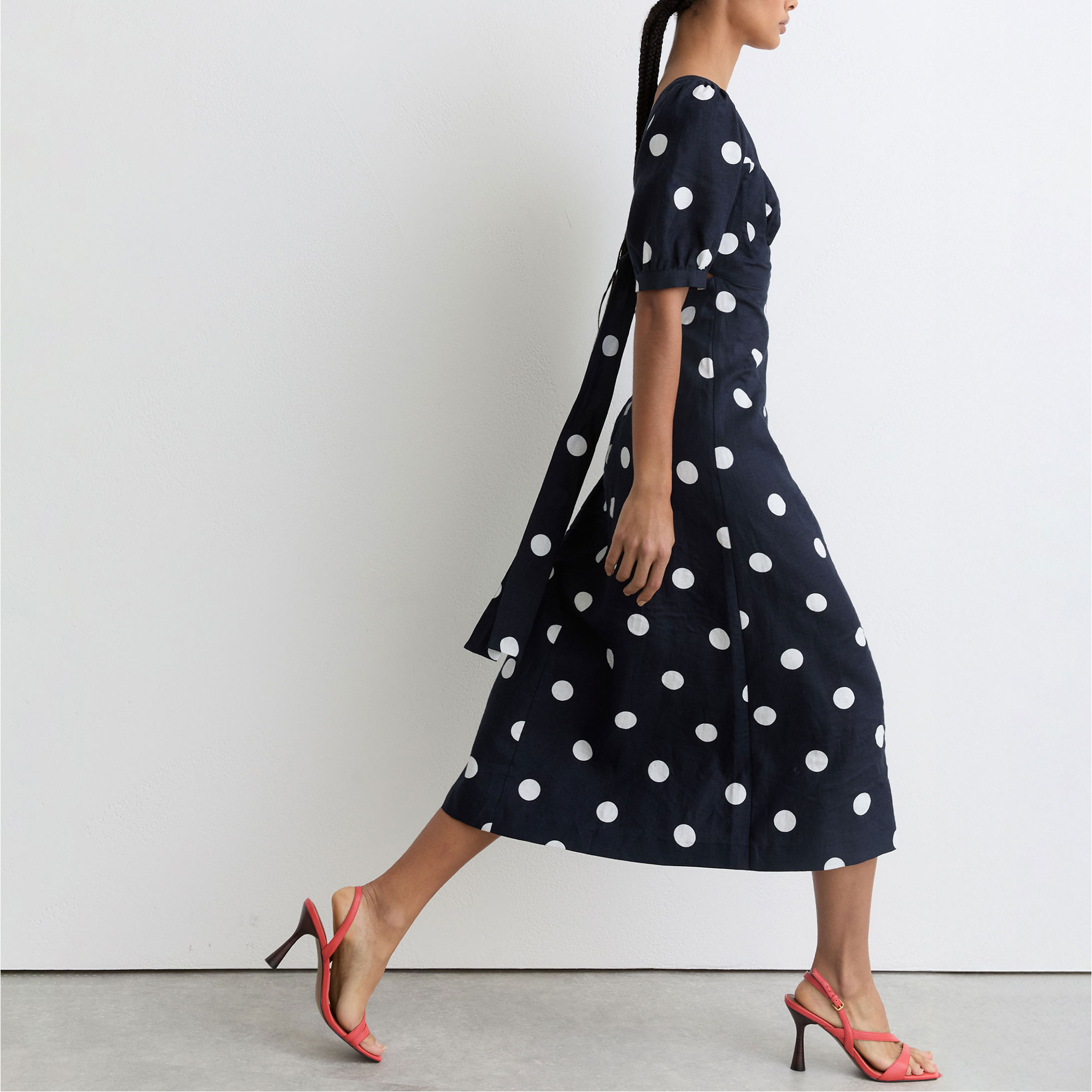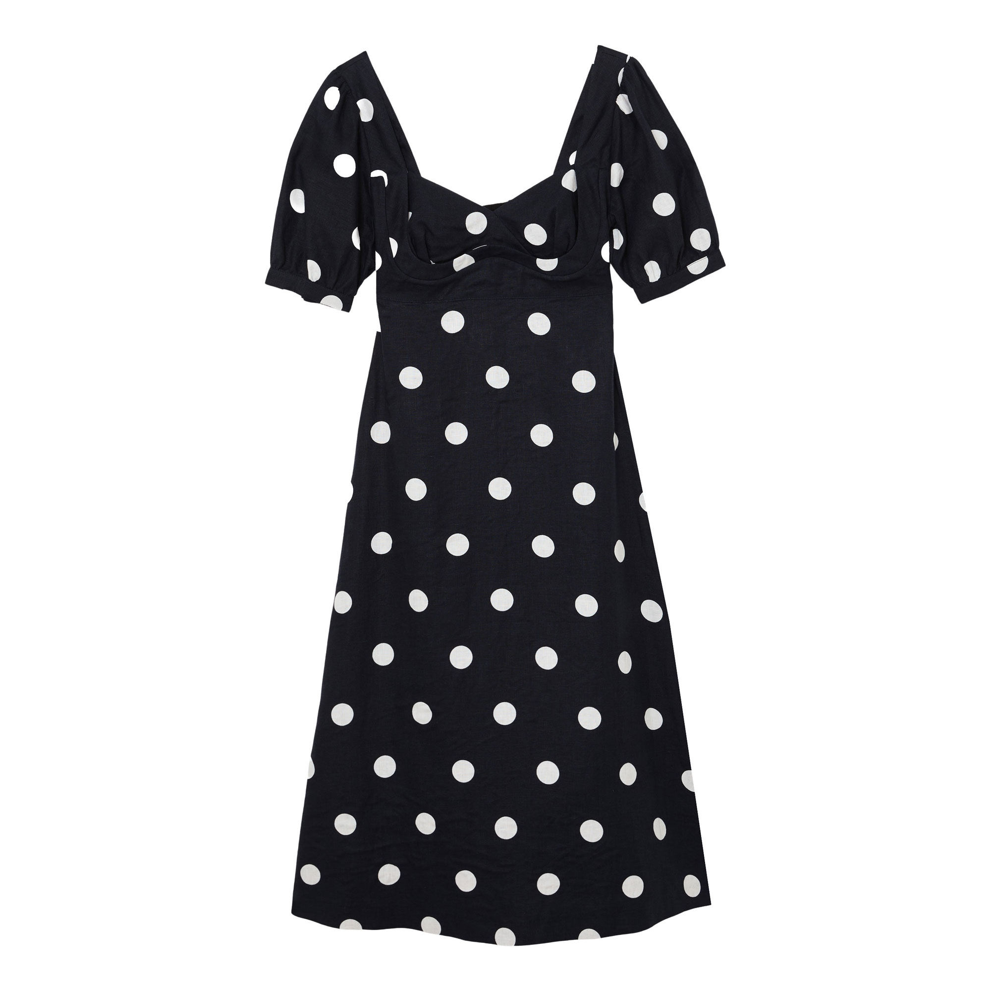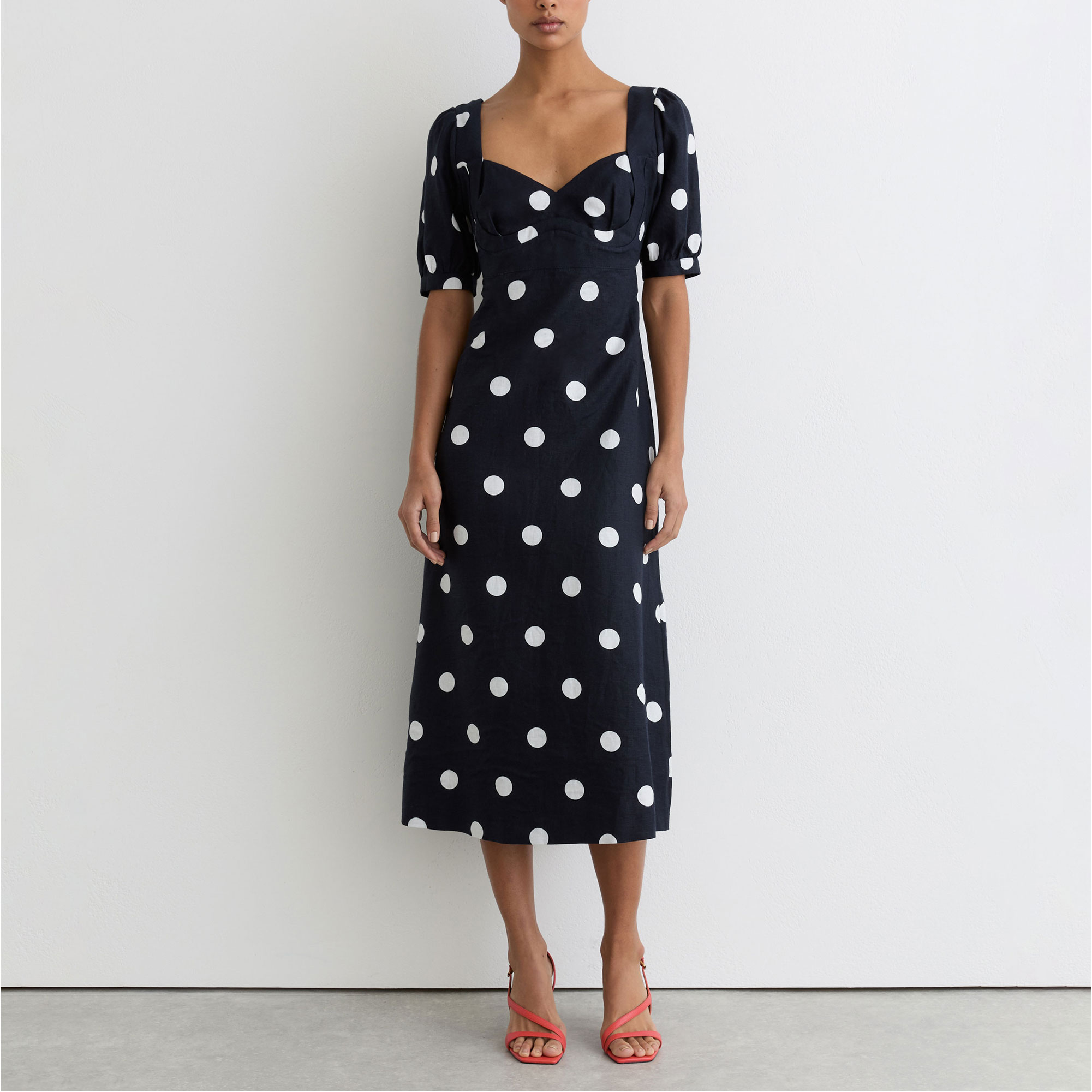 - Fit and flare silhouette, linen, polka-dot print, sweetheart neckline, bust shaping, short puff sleeves, cut-out back, tie detail, button cuffs, concealed back zip fastening, midi length