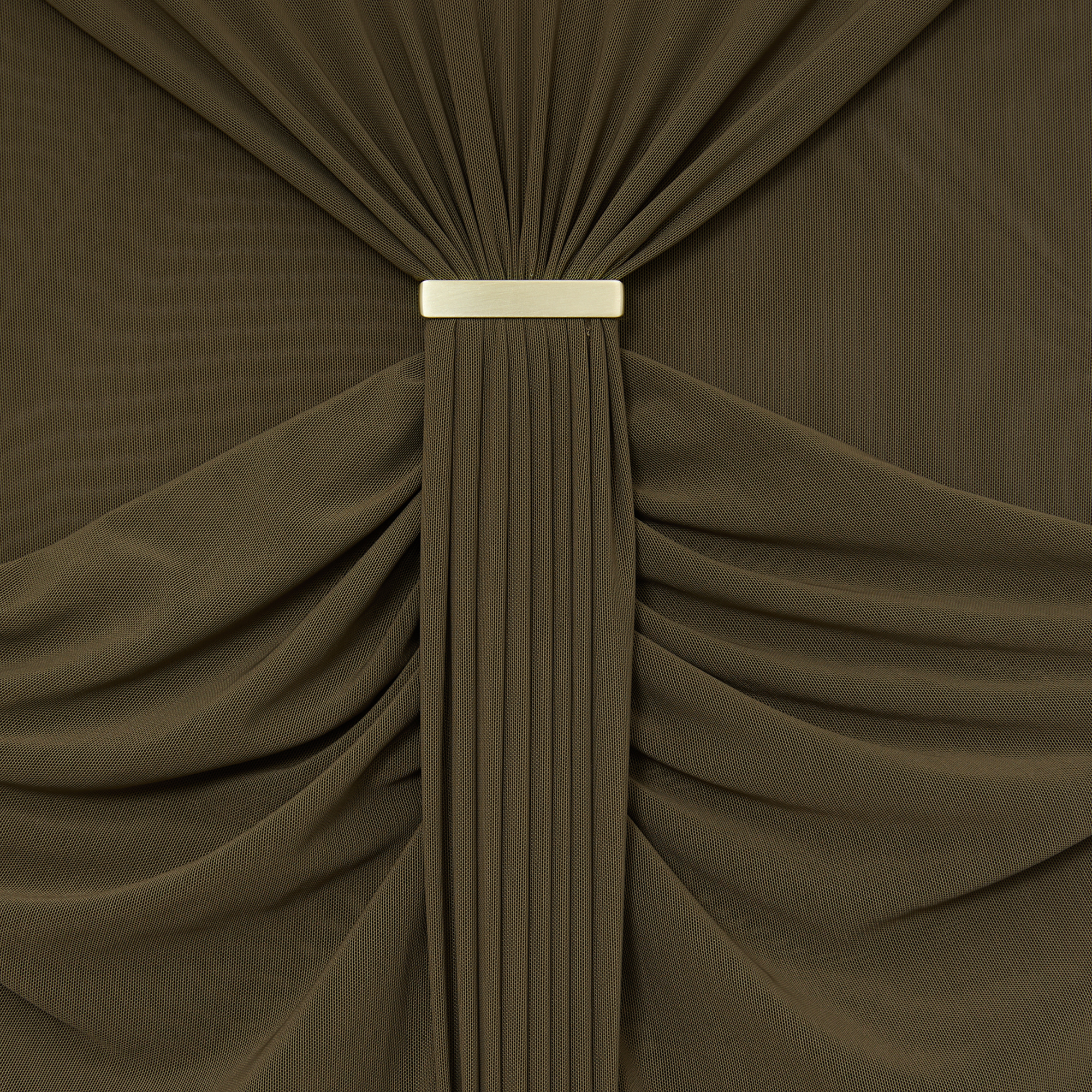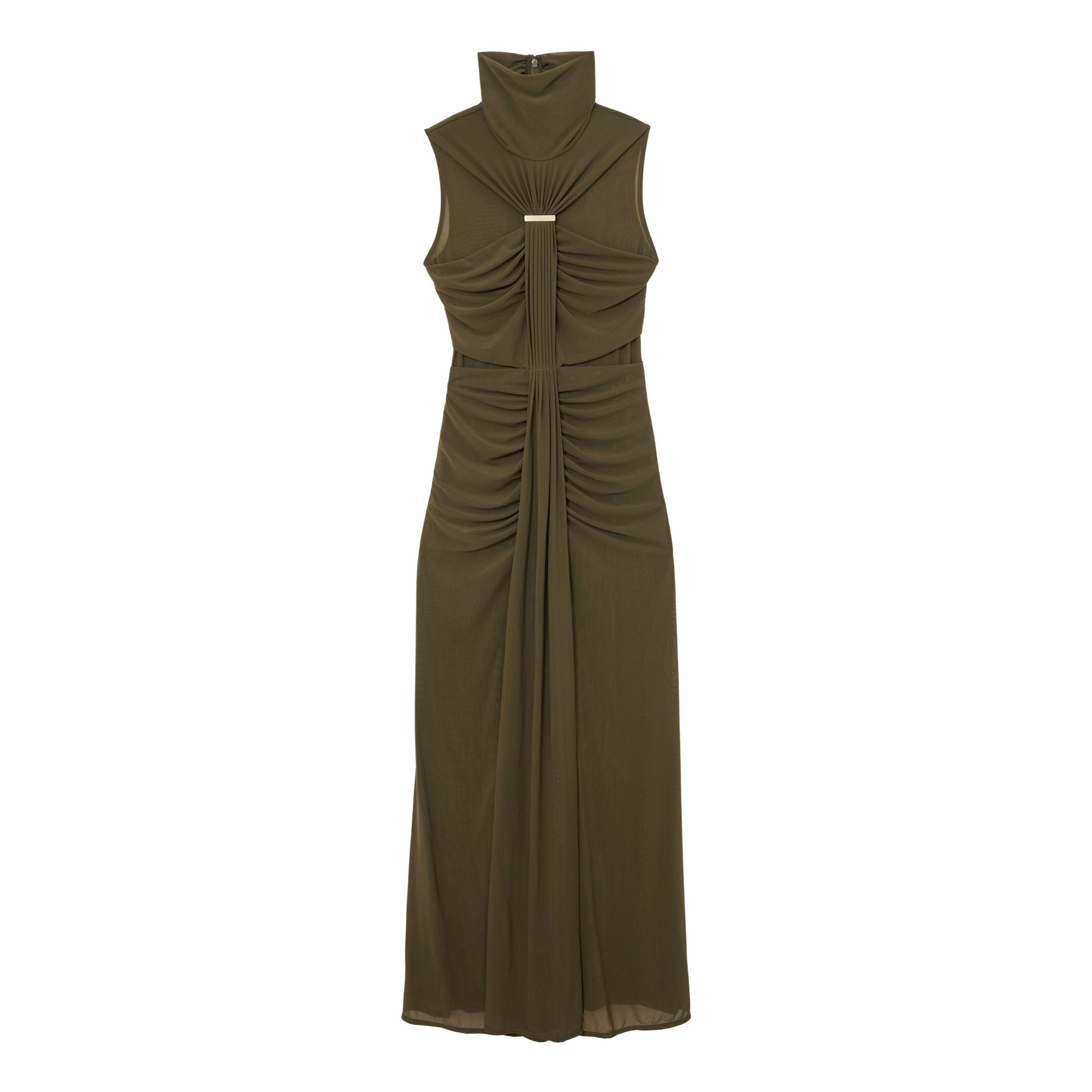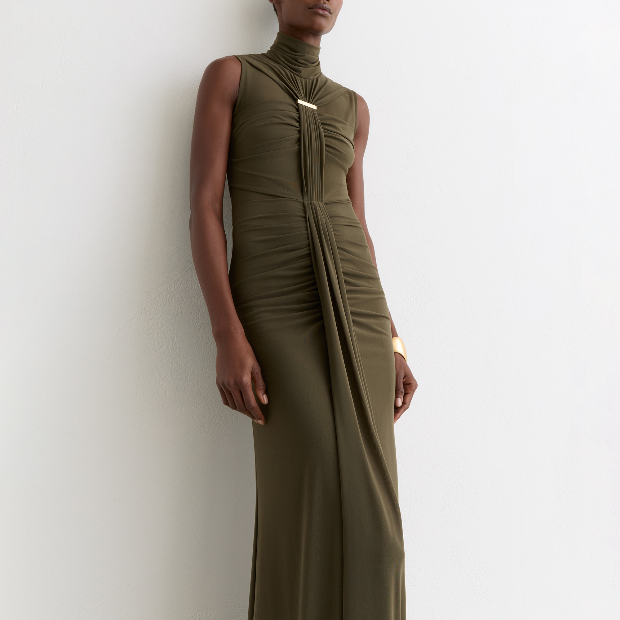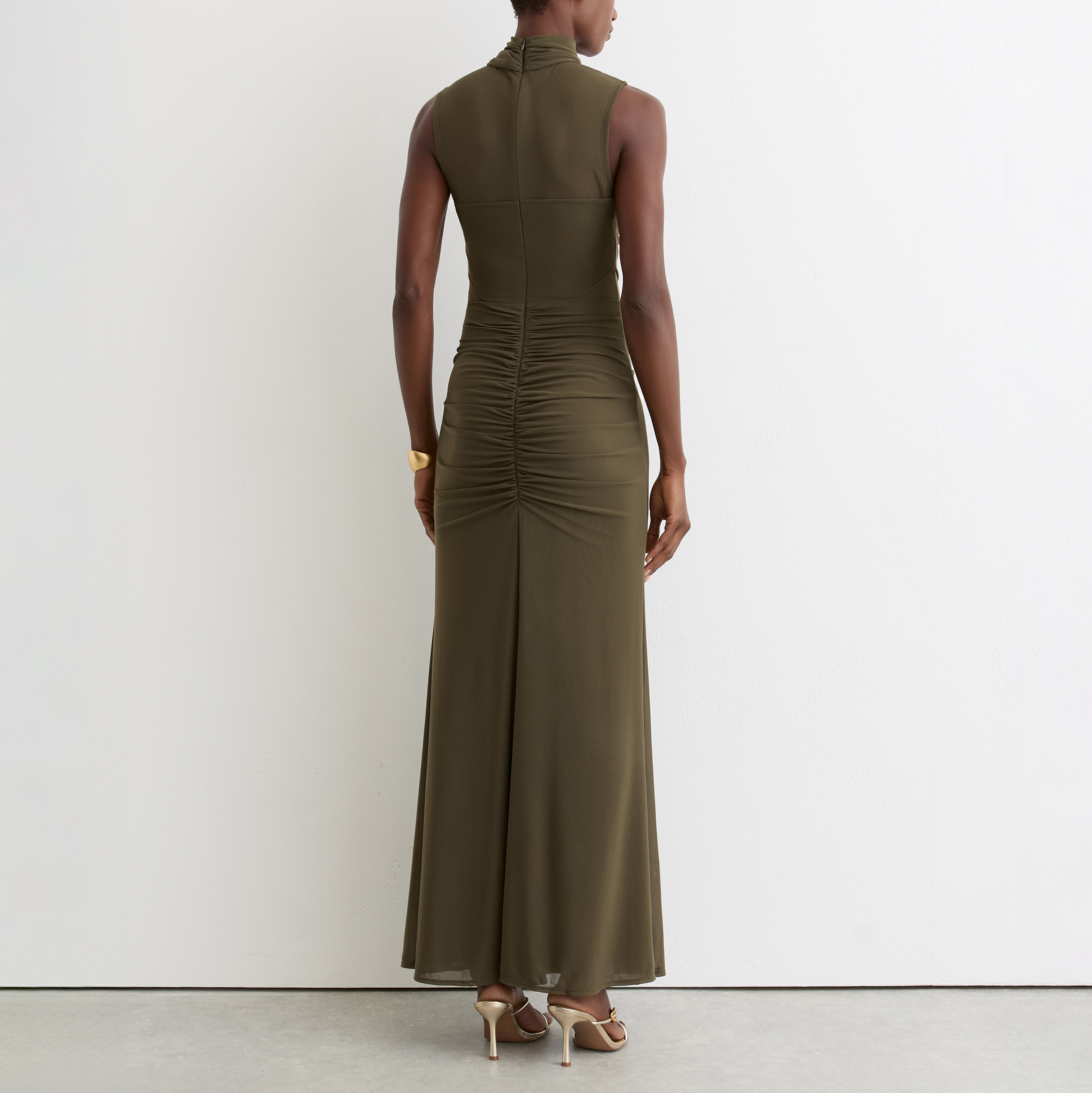 - Sleeveless, maxi length, ruched detailing, semi-sheer panels, gold-tone hardware, high neckline, concealed back zip fastening