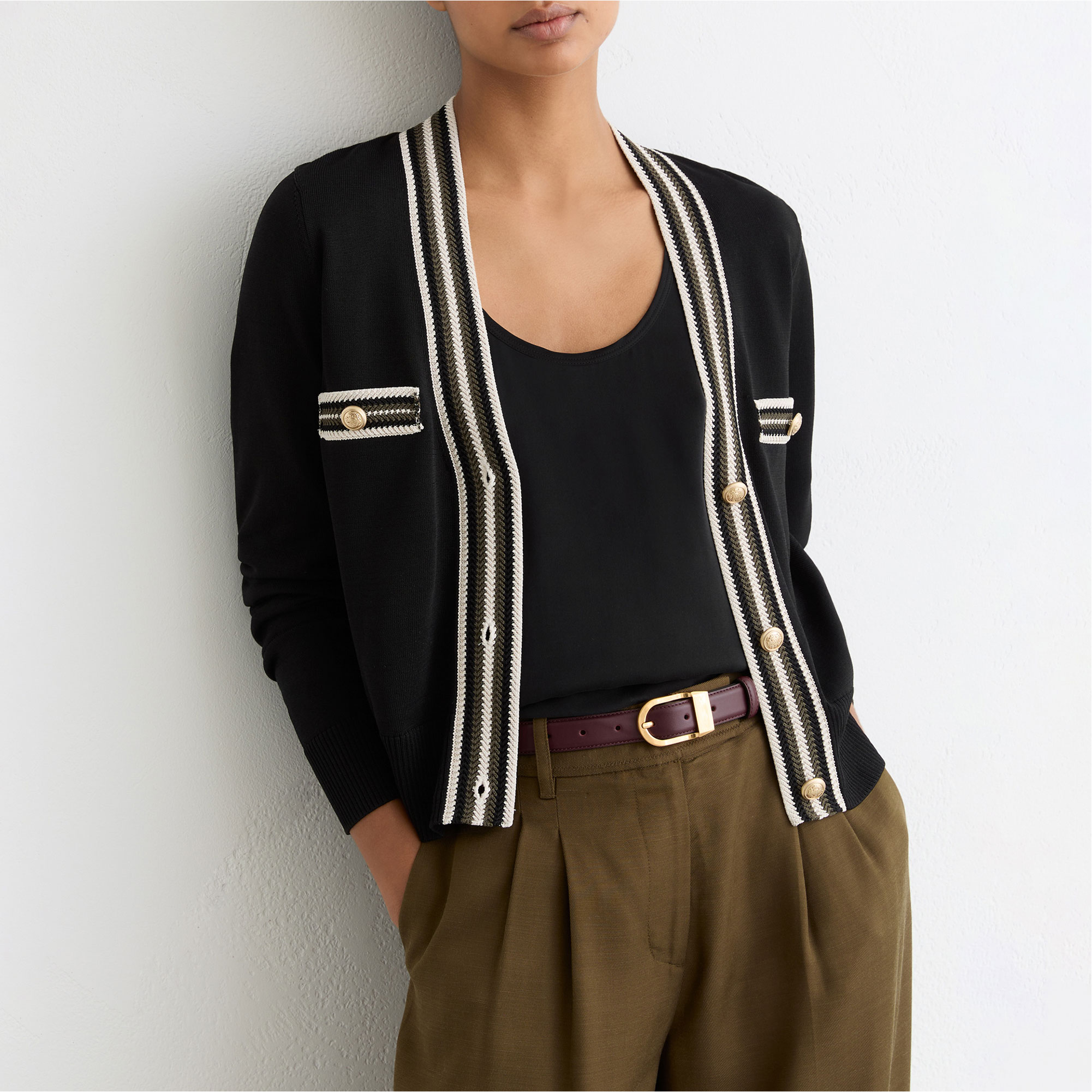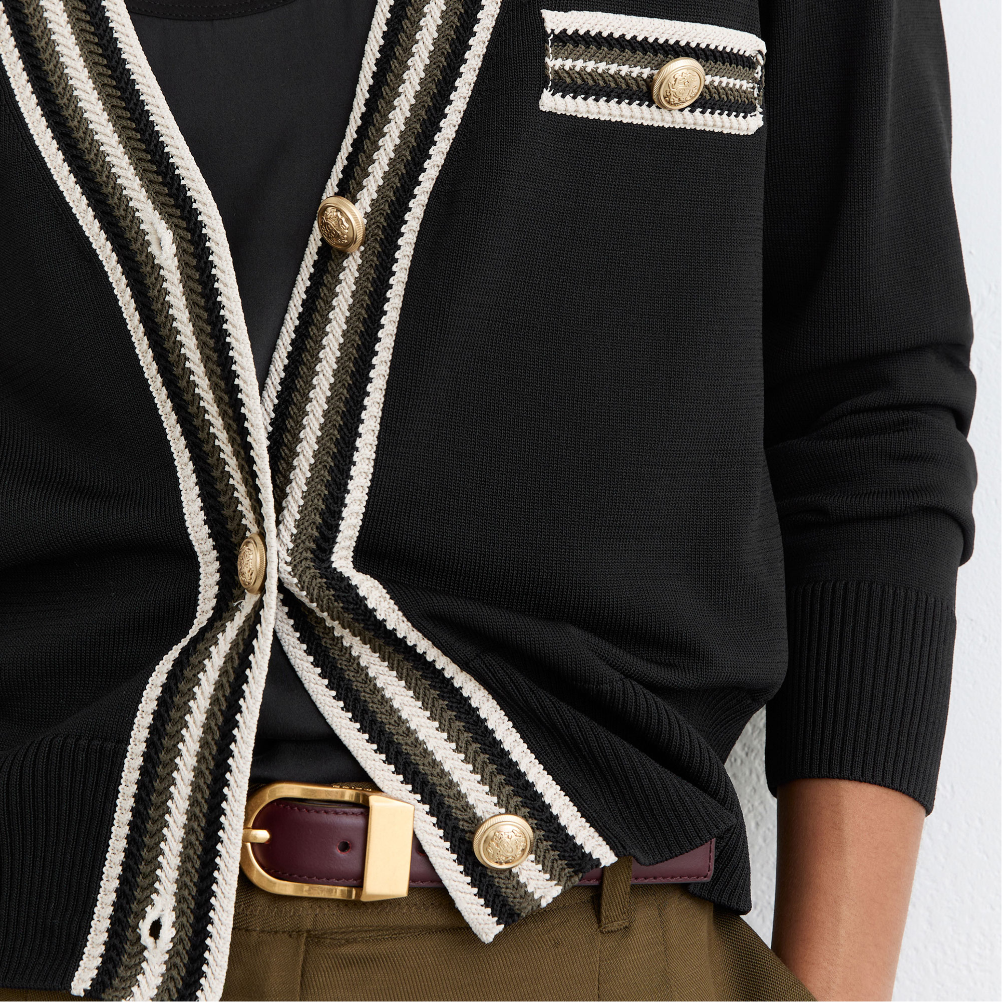 - Compact knit structure, textured stripe trims, gold-tone embossed buttons accent the chest pocket welts and front placket, ribbed hem and cuffs, V-neckline, long sleeves