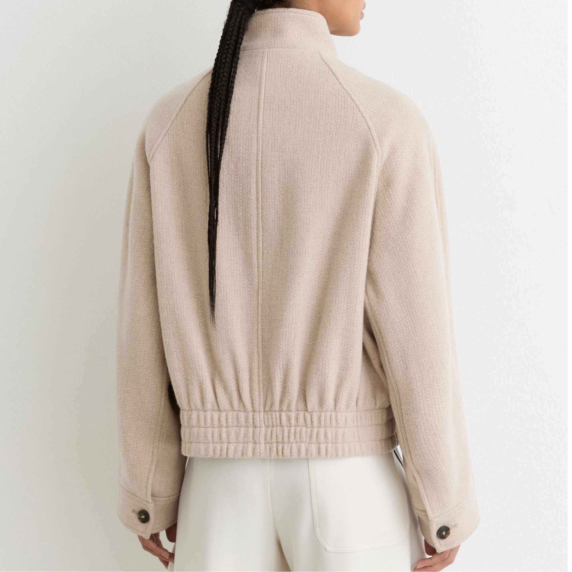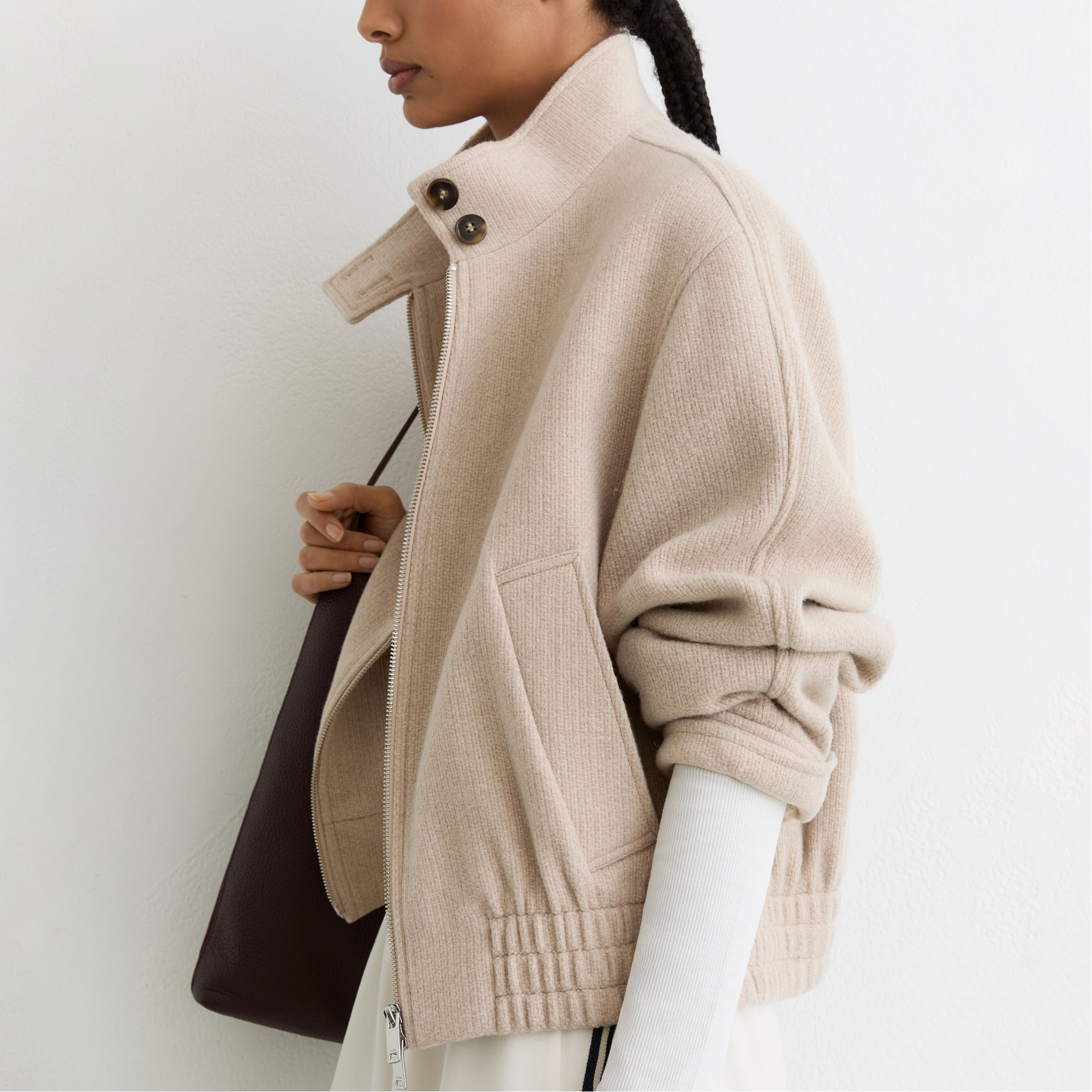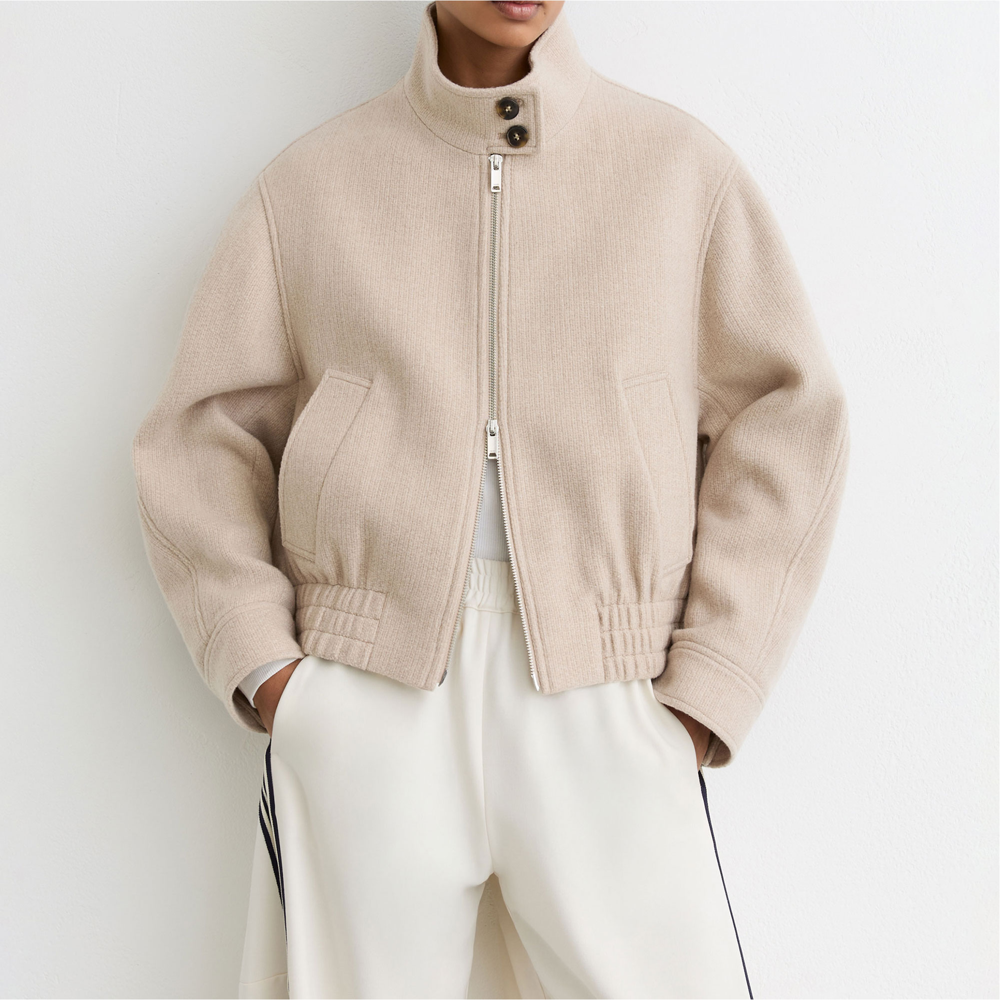 • Bomber style, lightly textured weave, buttoned funnel neckline, buttoned cuffs, elasticated hem, cocooning silhouette, broad welt side pockets, dual front zip fastening
