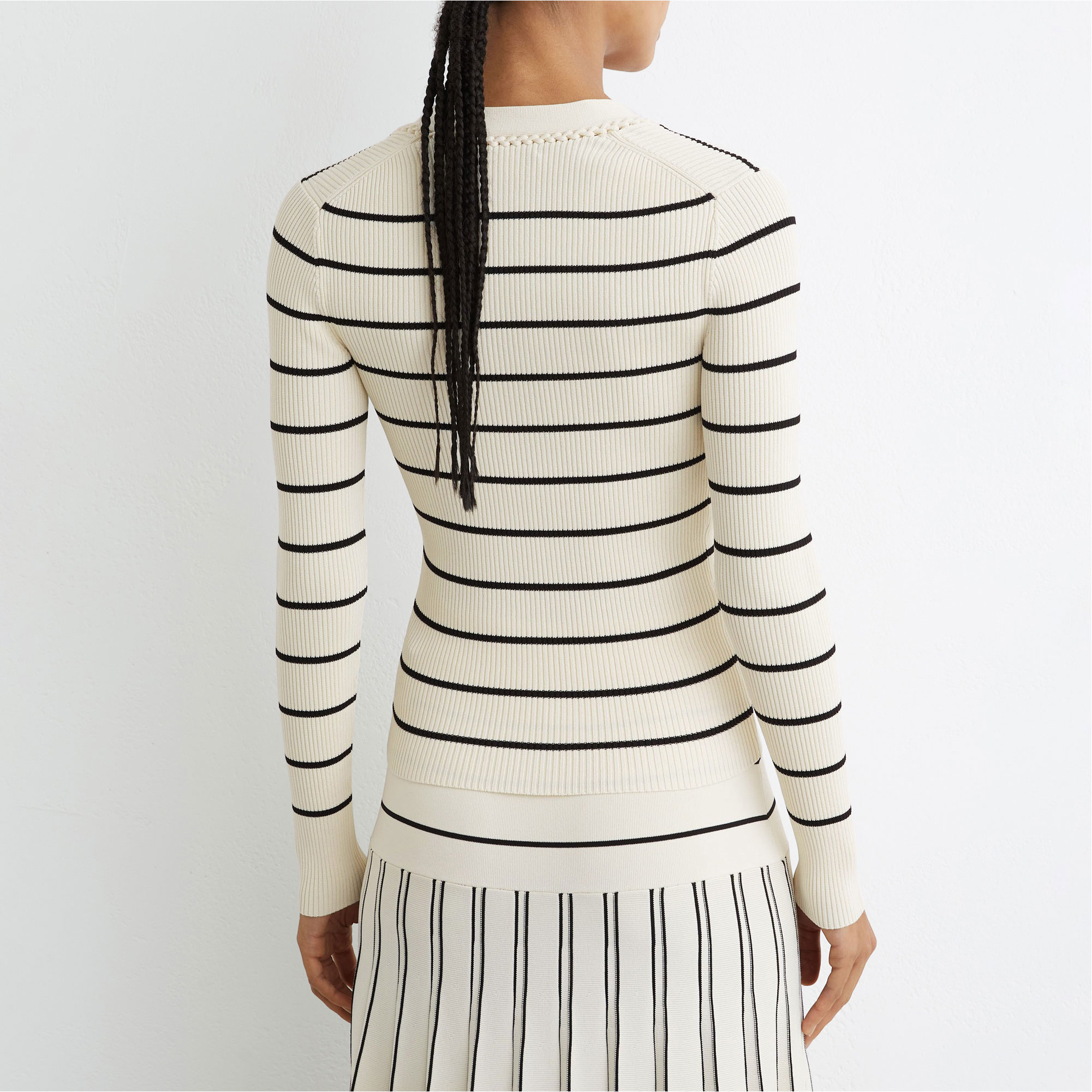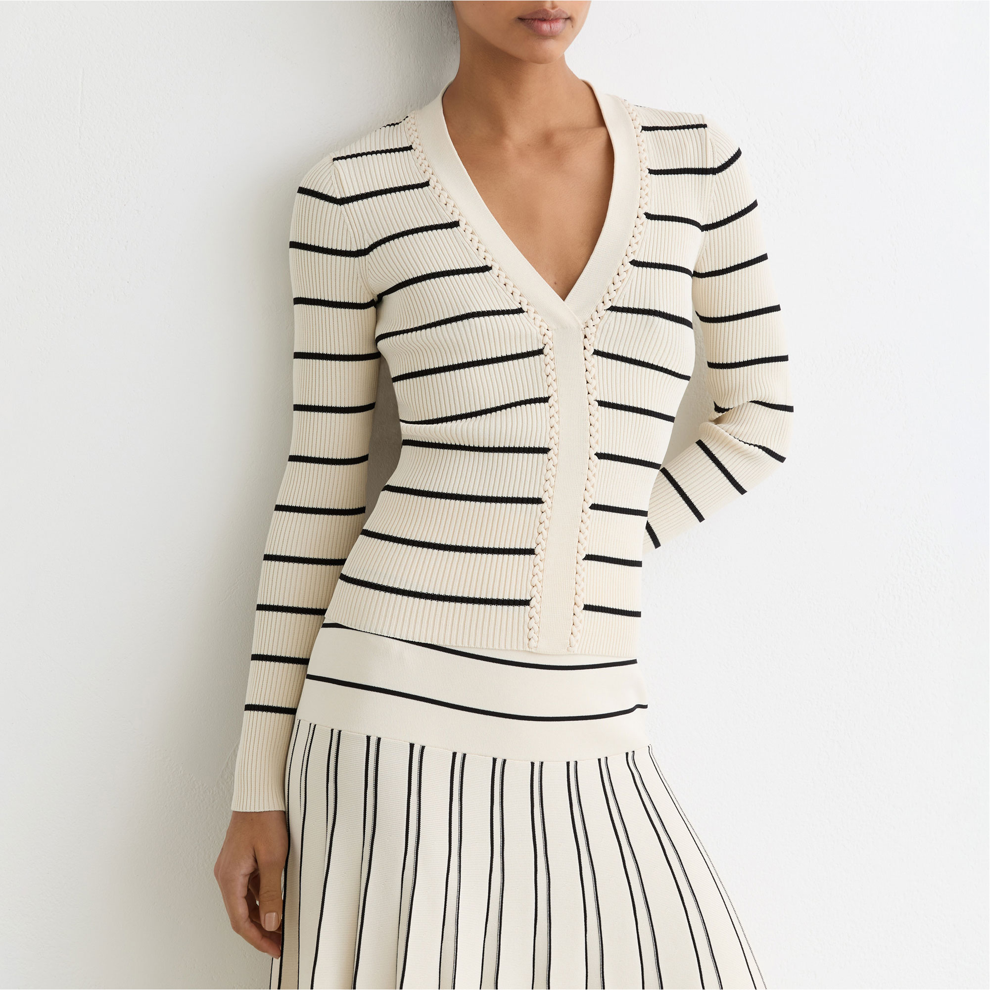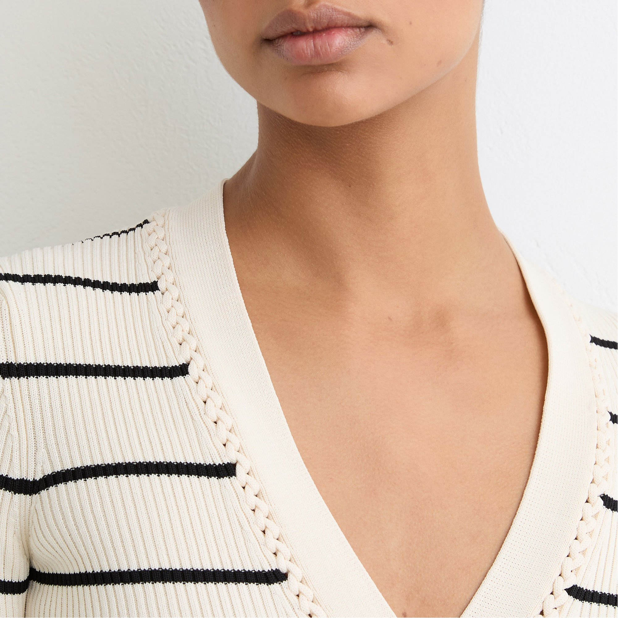 • Rib knit, stripes, craft stitching, deep V-neckline, long sleeves