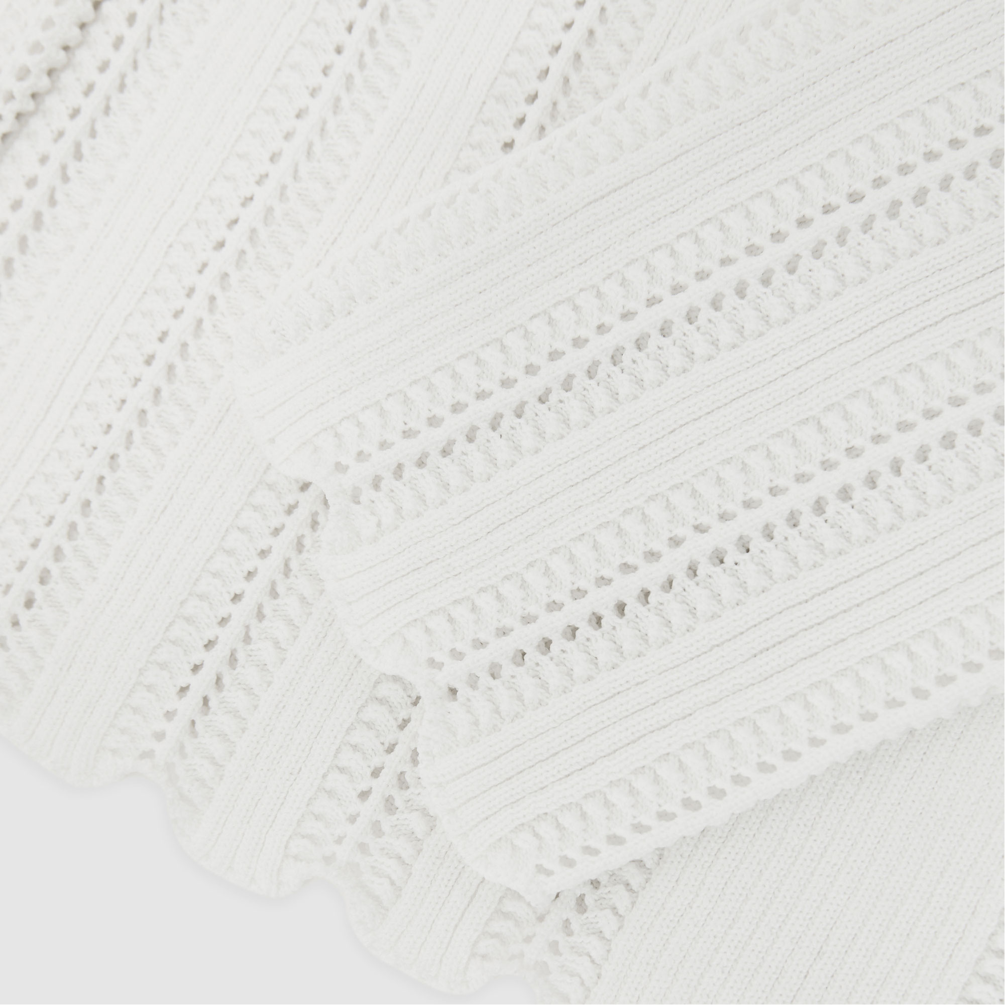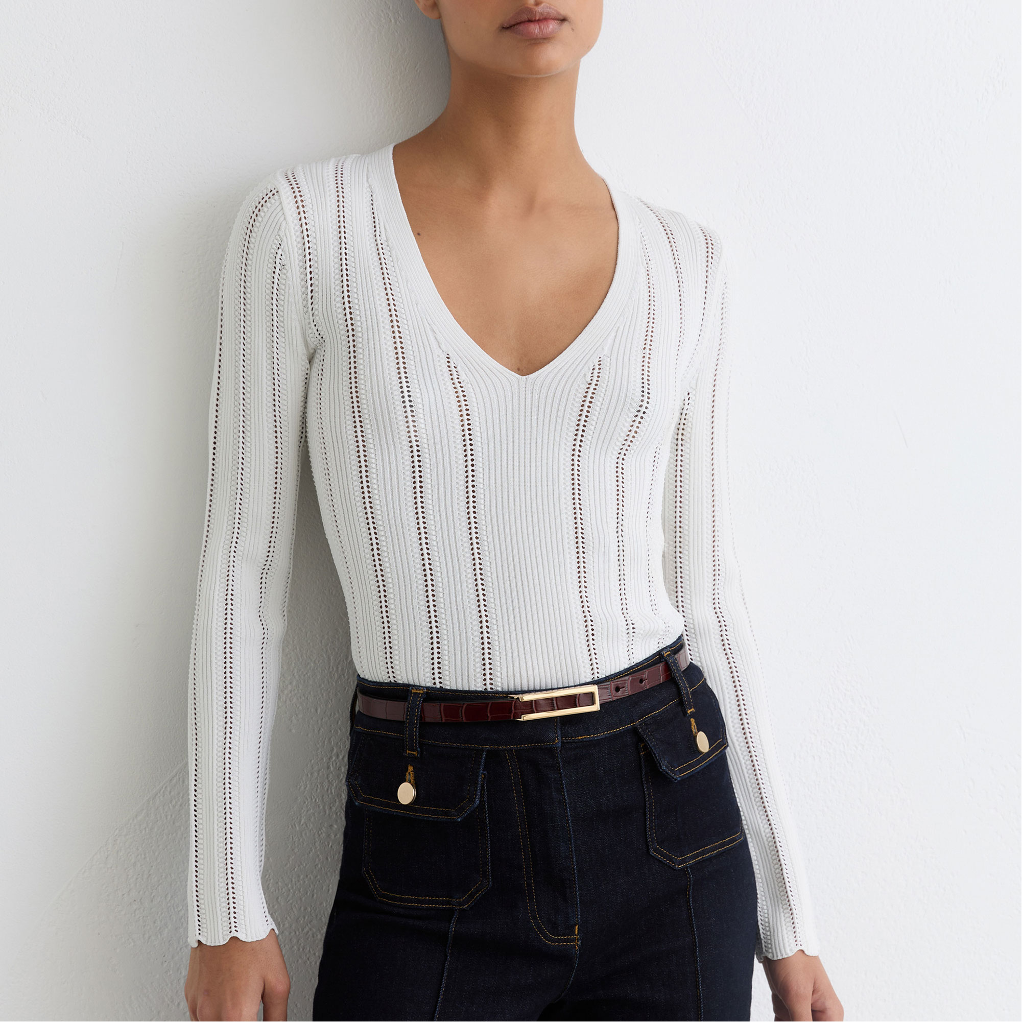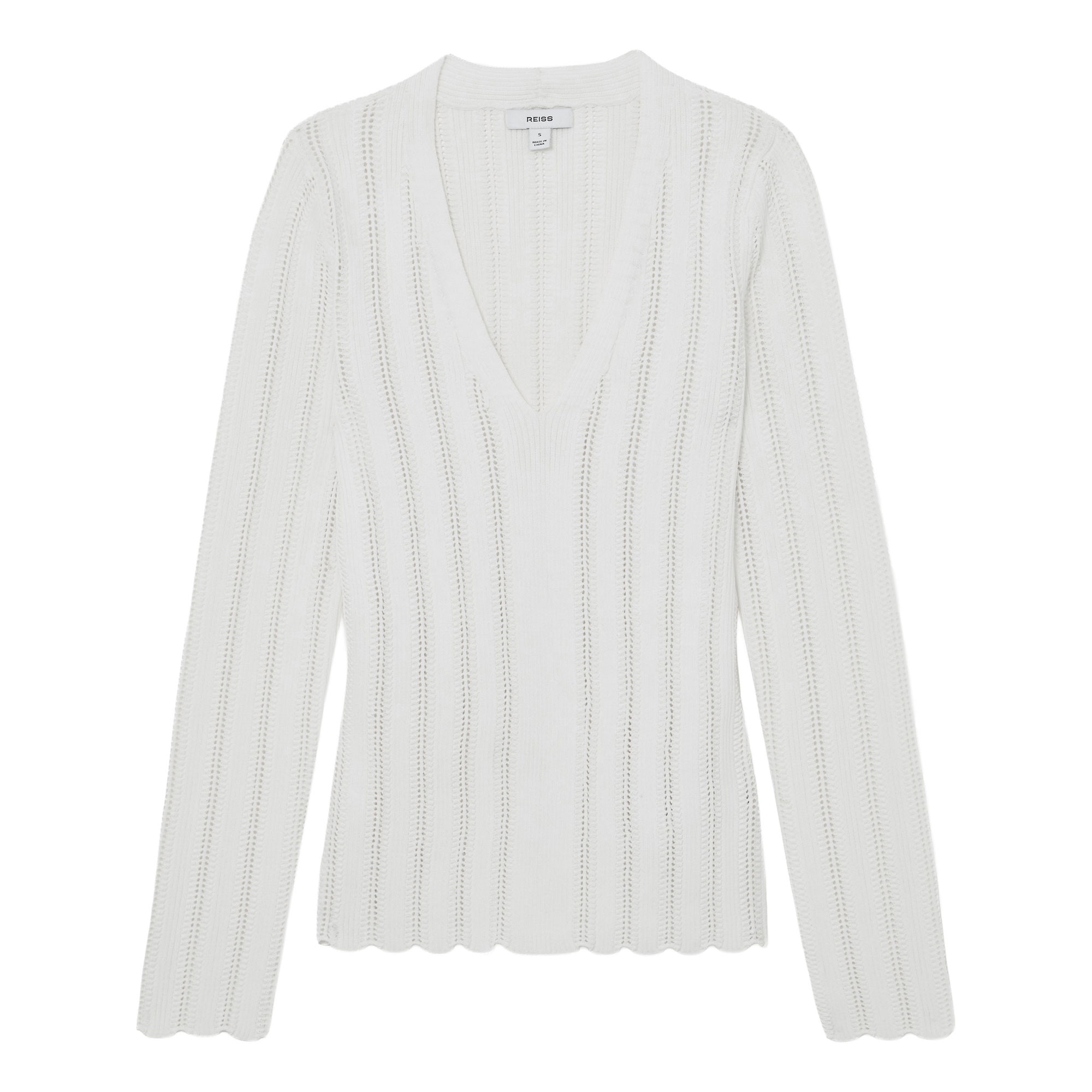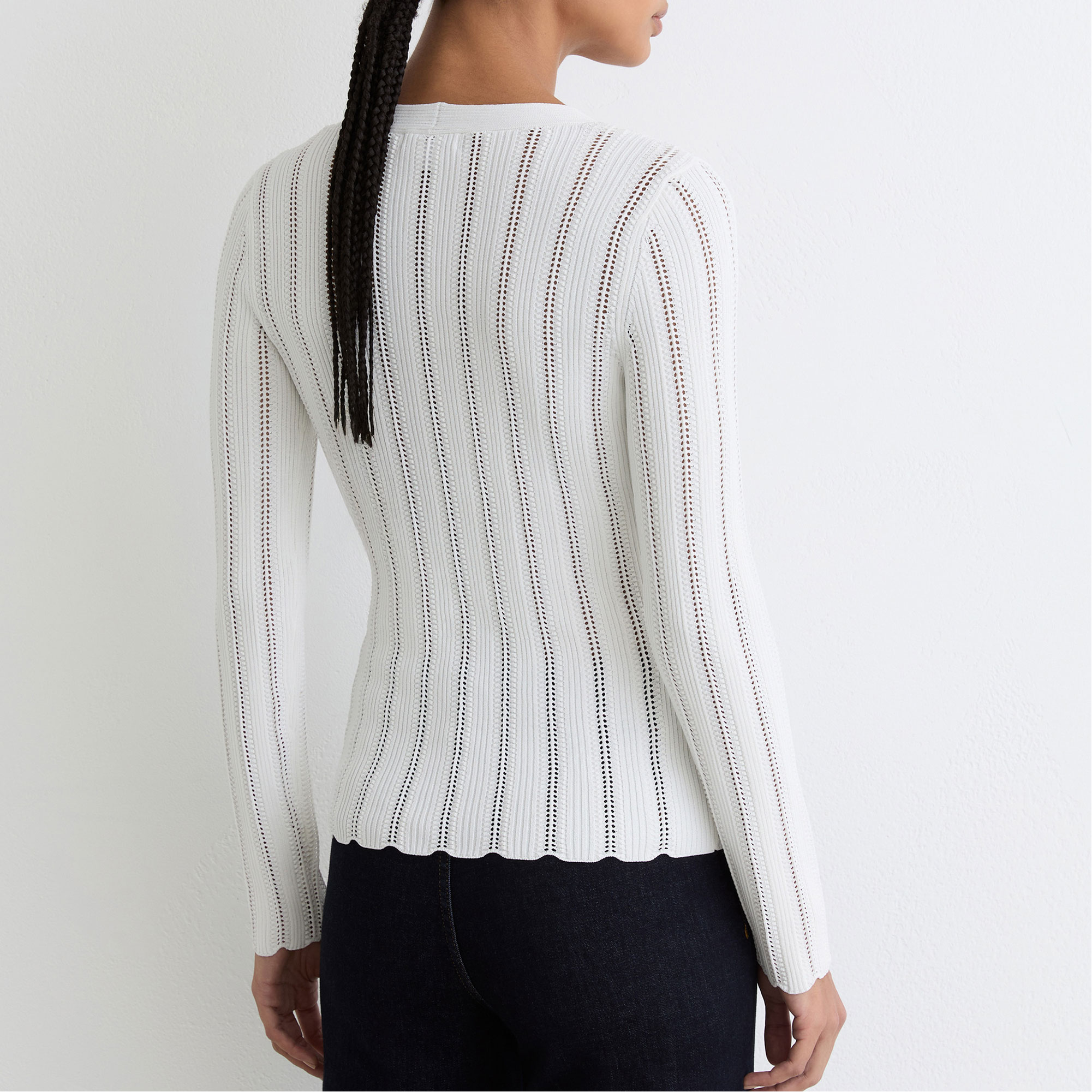 • Rib-knit with eyelet stitching, V-neckline, long sleeves, scallop-edge hem and cuffs
