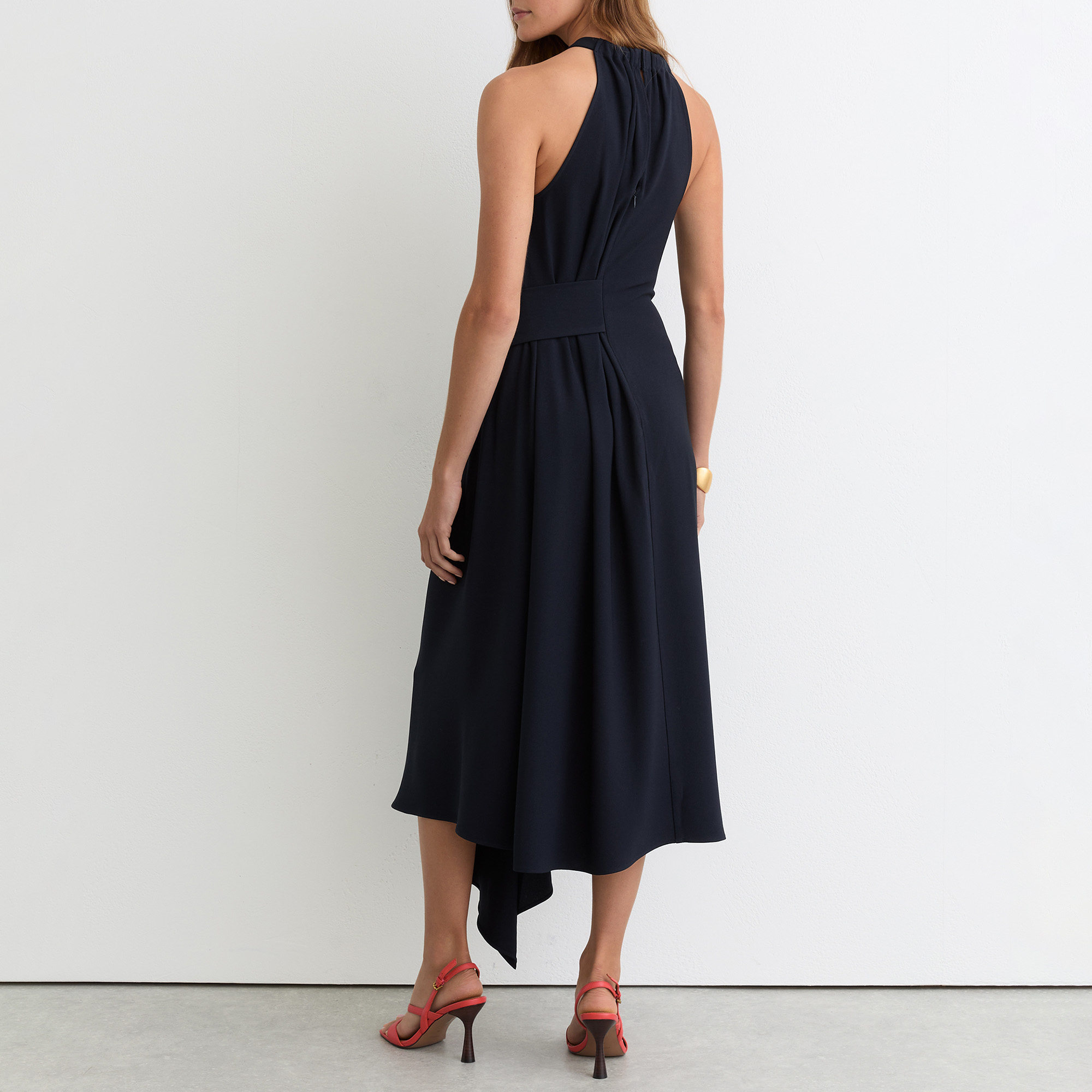 - Draped detail at the waist, gathered neckline, sleeveless, asymmetric hem, buttoned keyhole with concealed back zip