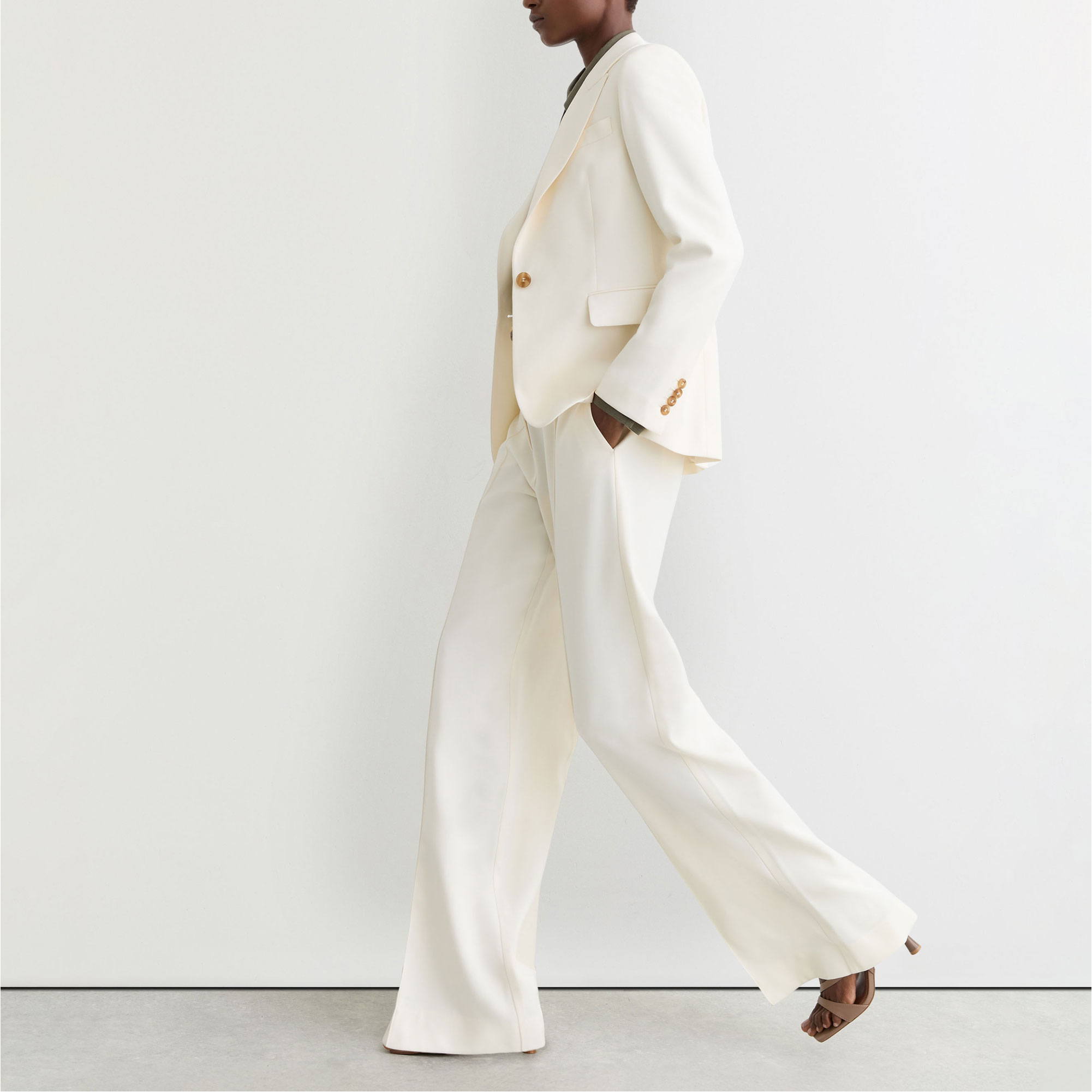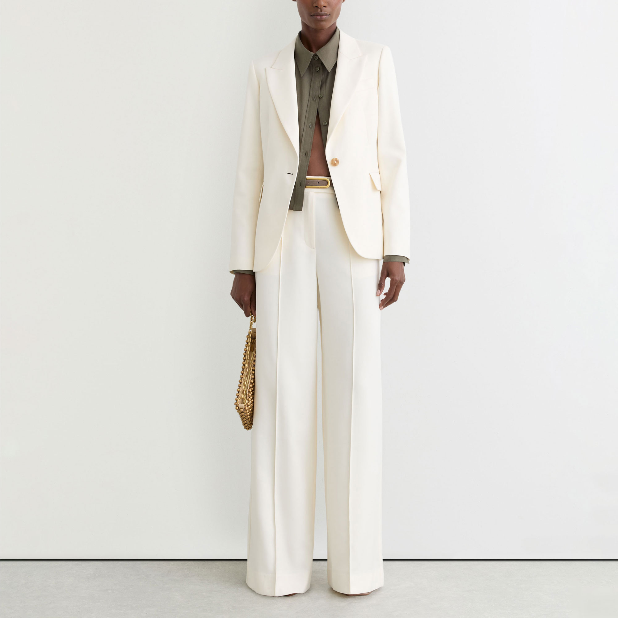 • Wide-leg silhouette, front pintucks, button-tab waist closure, zip fastening, side slip pockets, welt back pockets