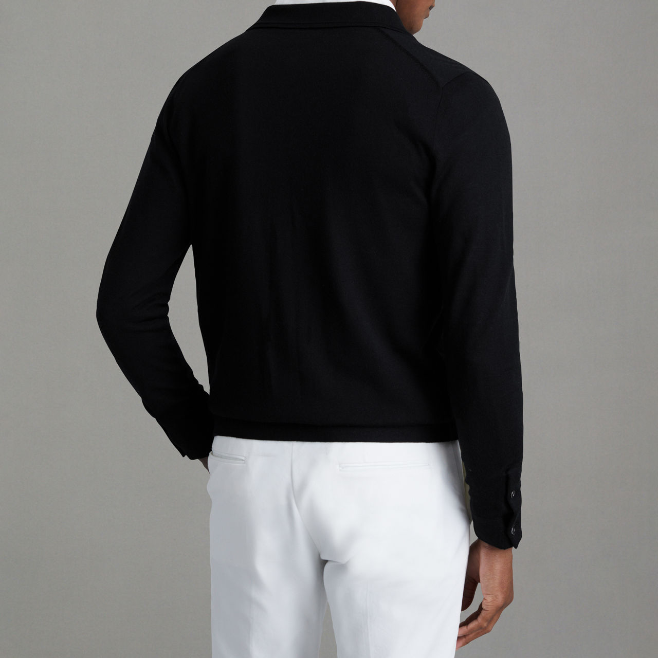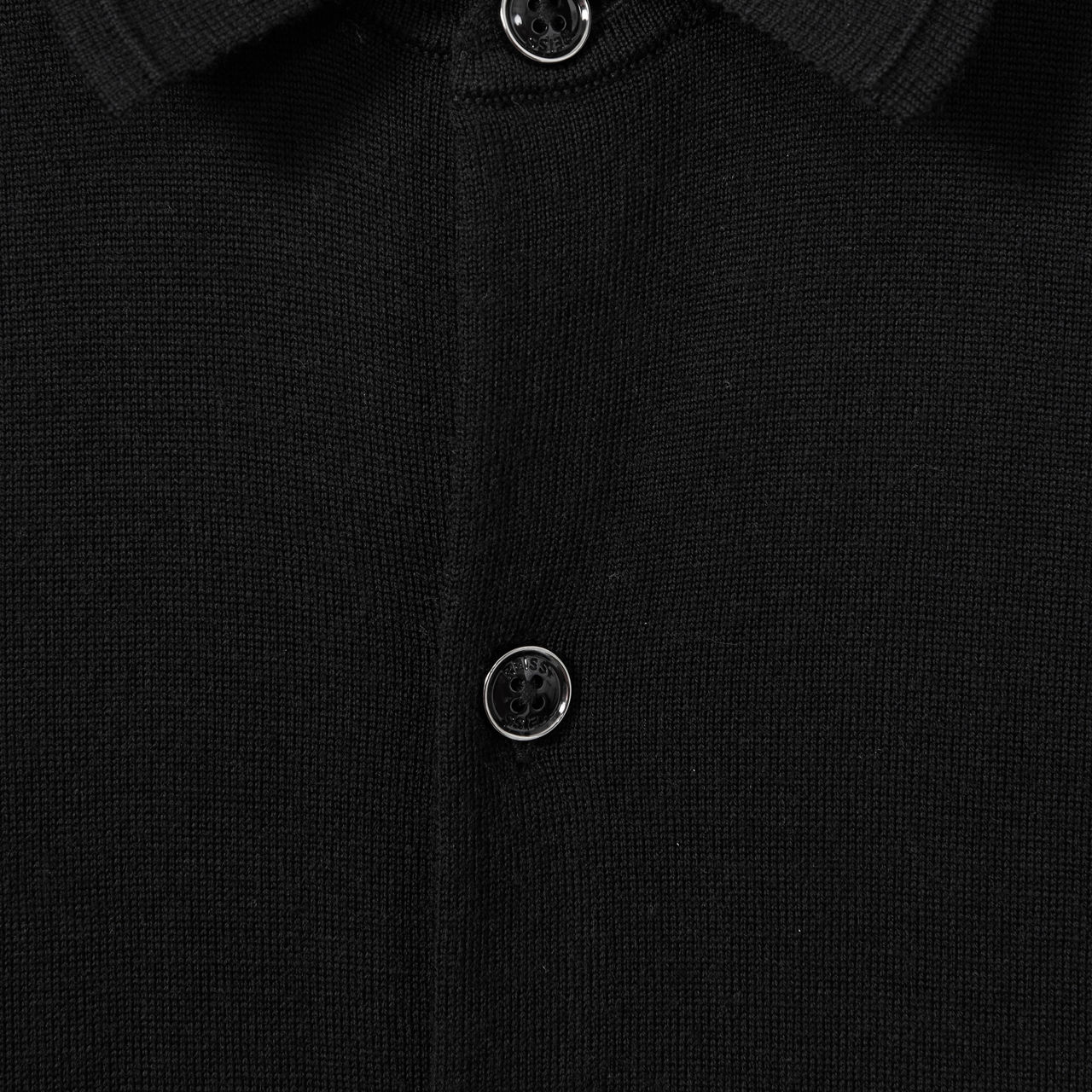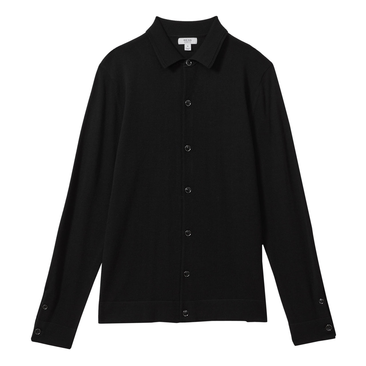- Pointed collar, long sleeves, button fastening, double-button cuffs, straight hemline, flat-knitted finish
