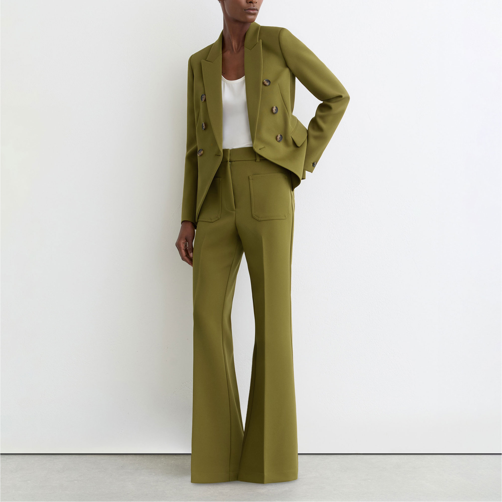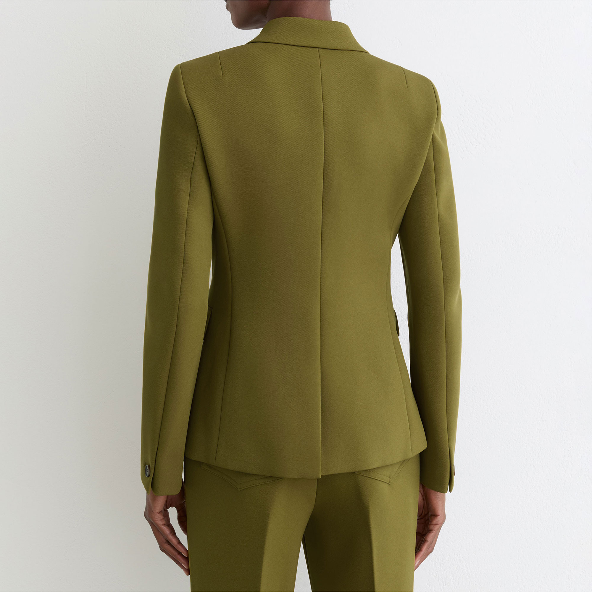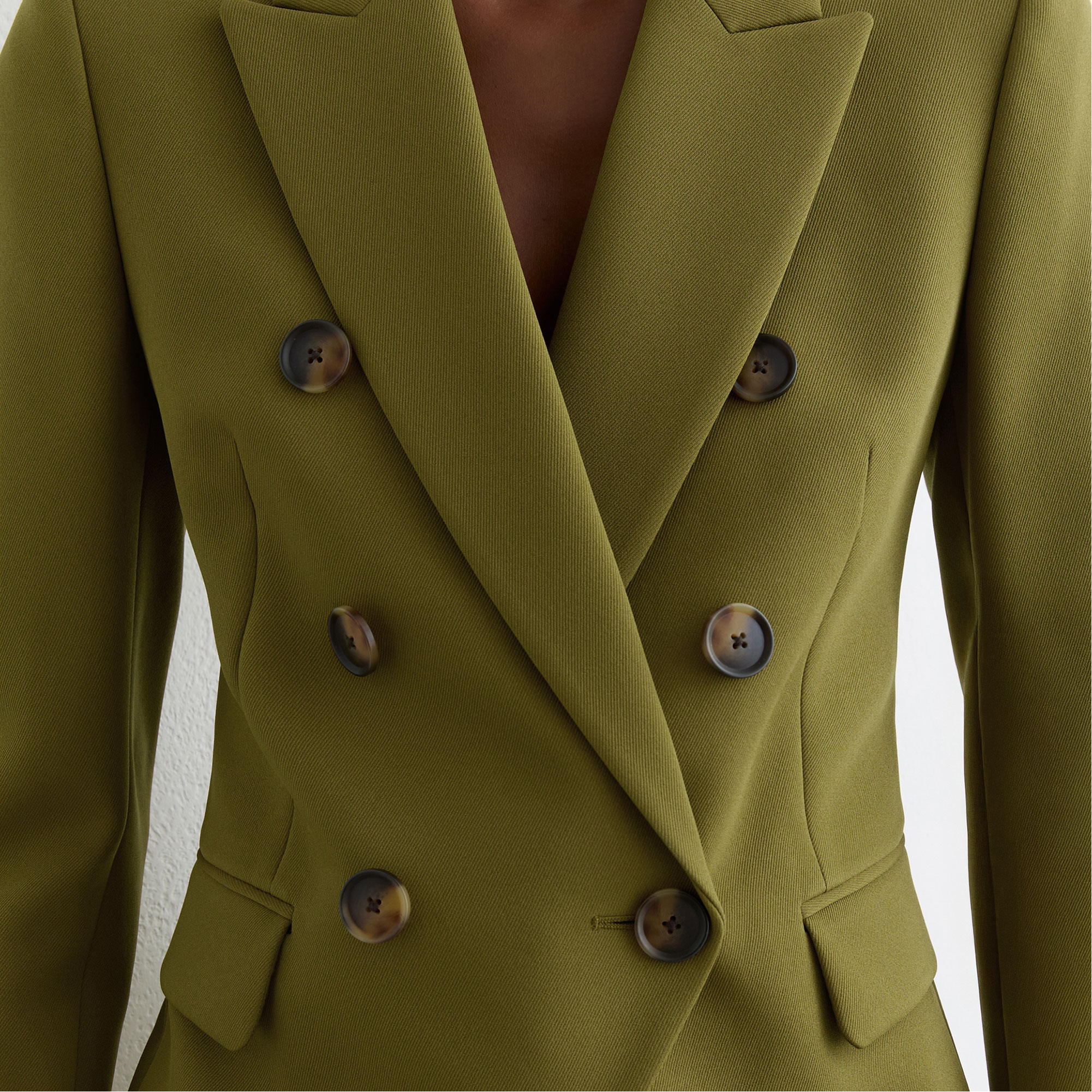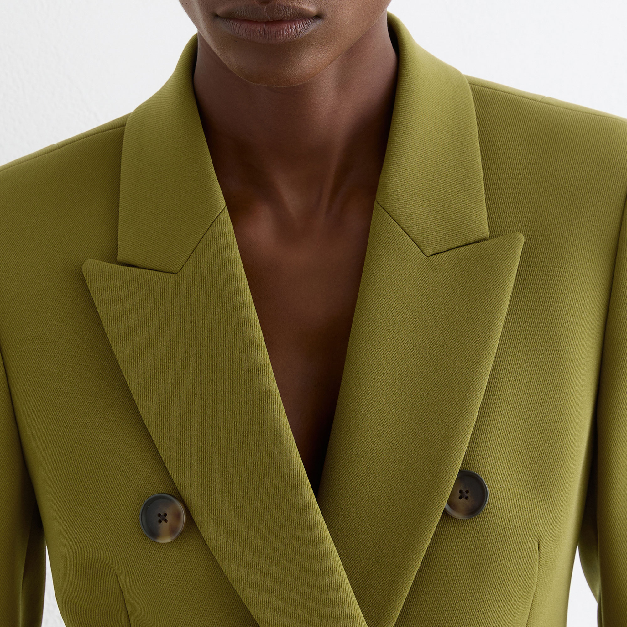 - Twill fabric, double-breasted silhouette, sharp peak lapels, lightly padded shoulders, buttoned cuffs, flap pockets, lined