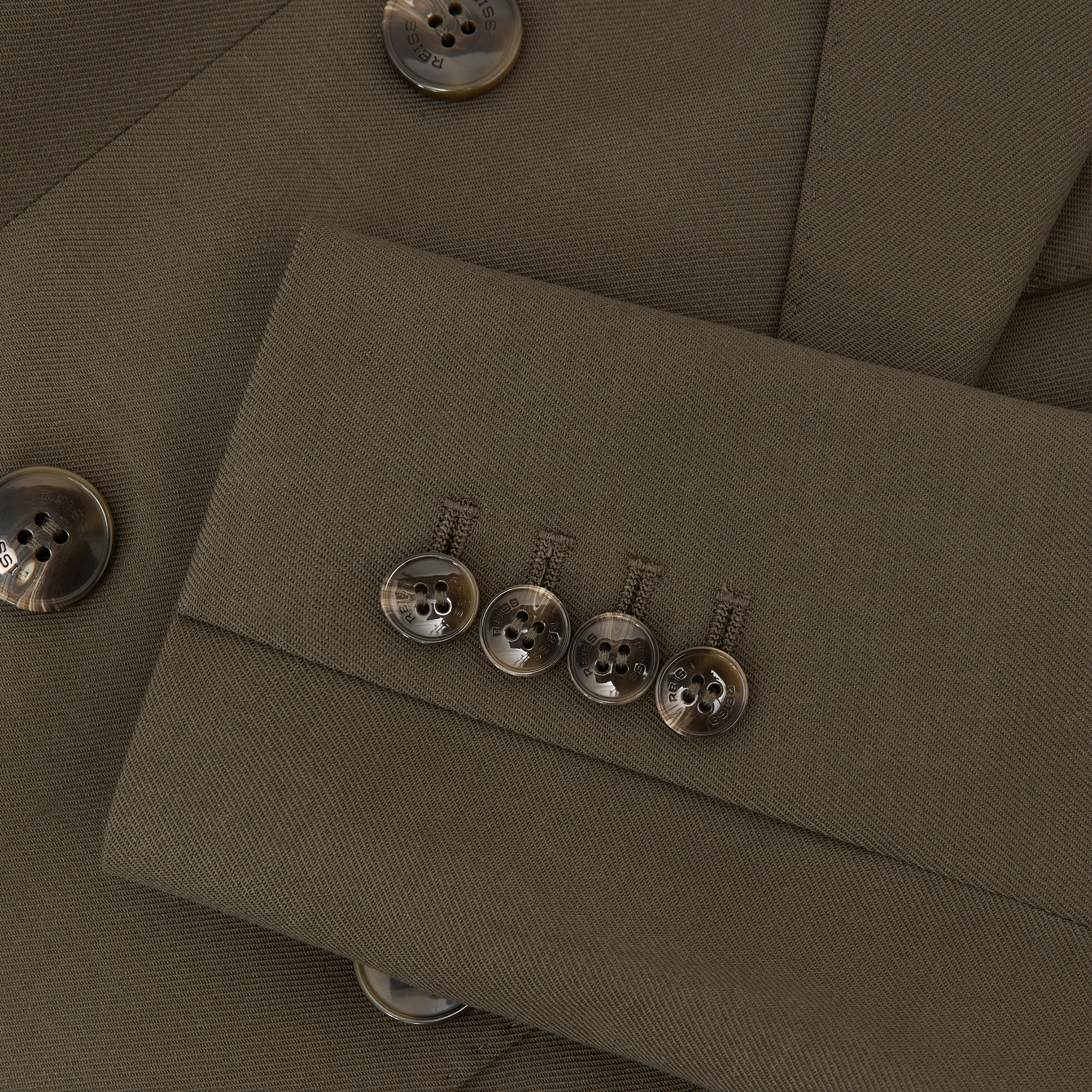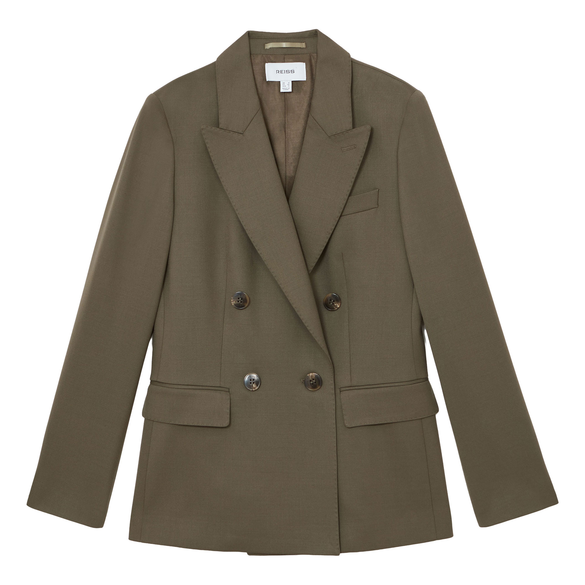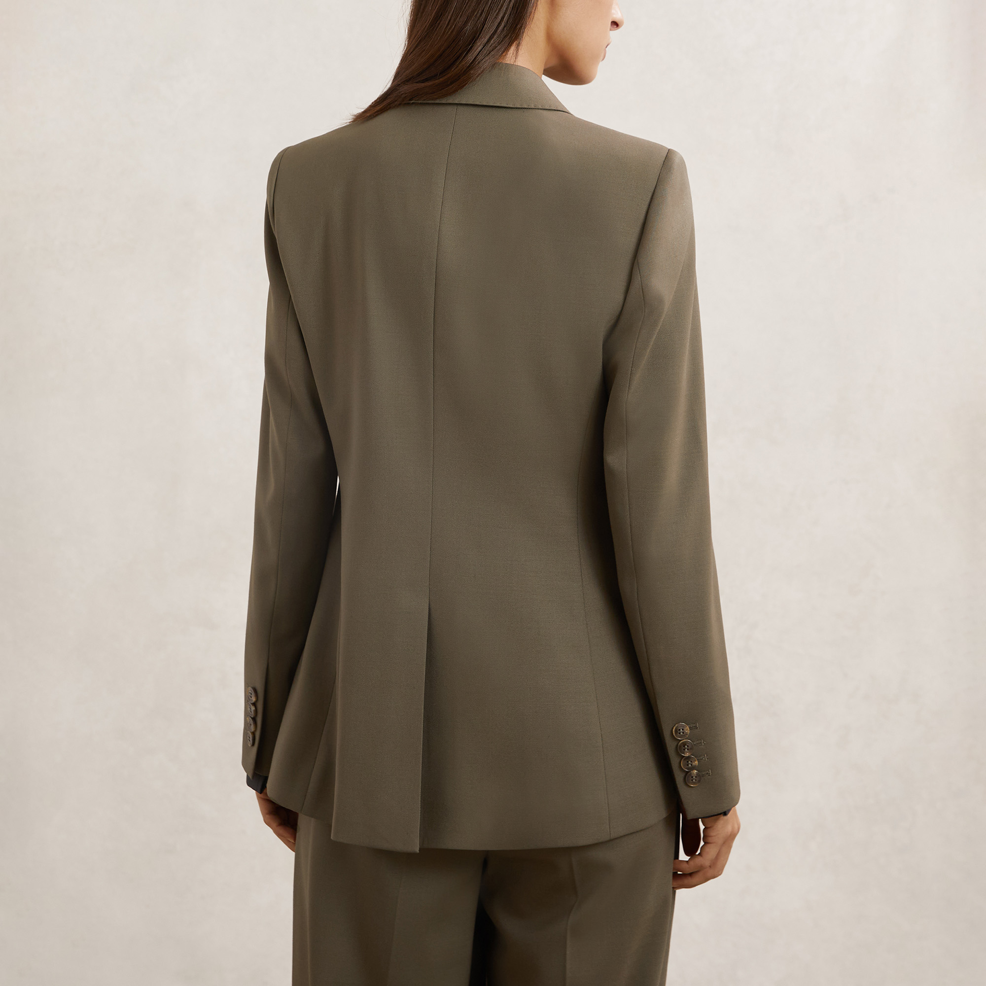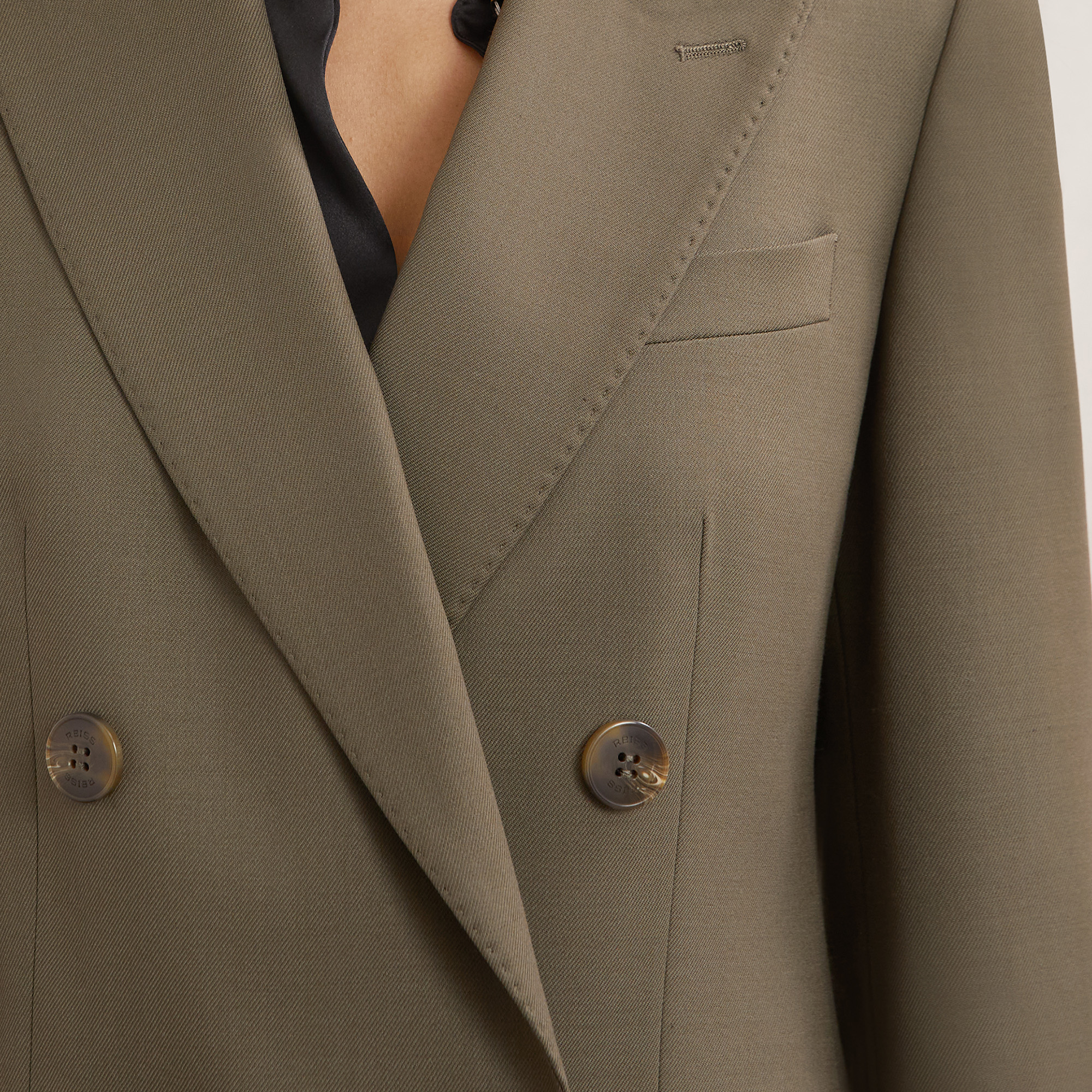 - Double-breasted silhouette, pick-stitched peak lapels, shaped shoulders, branded buttons, single vent to reverse