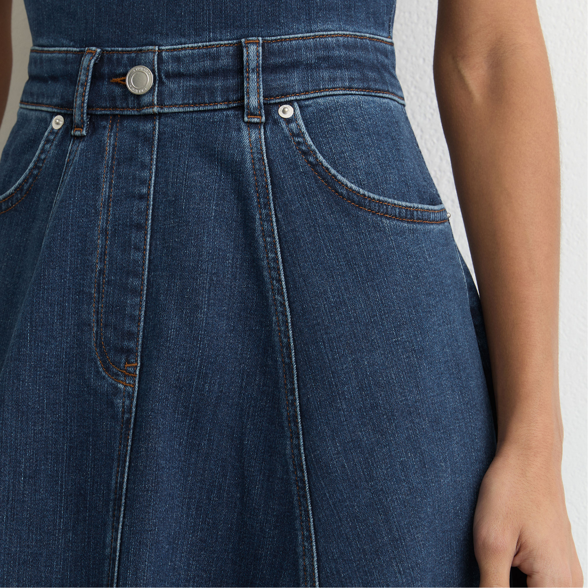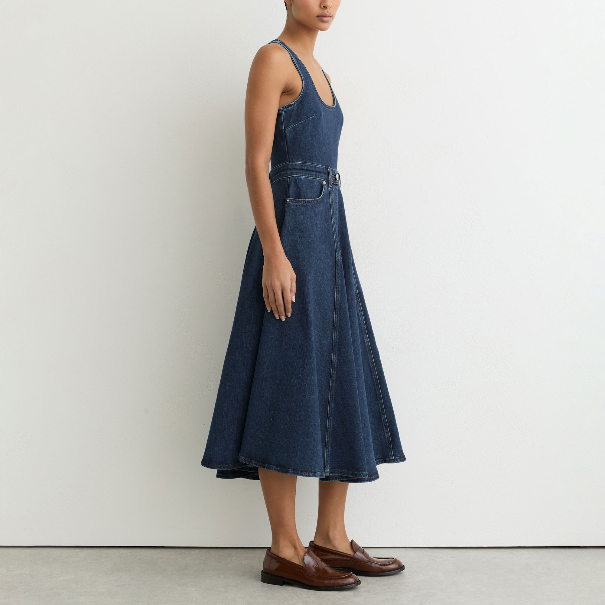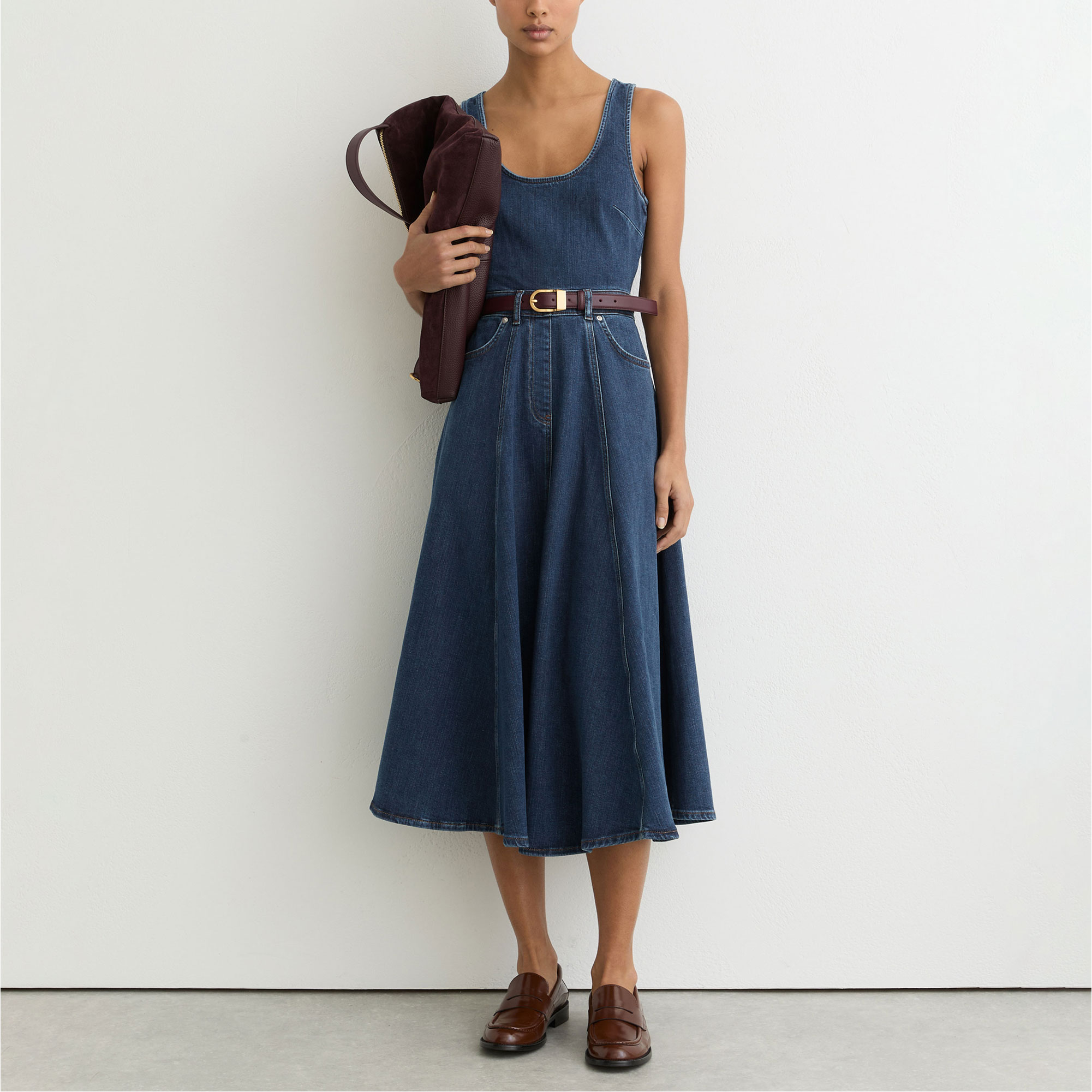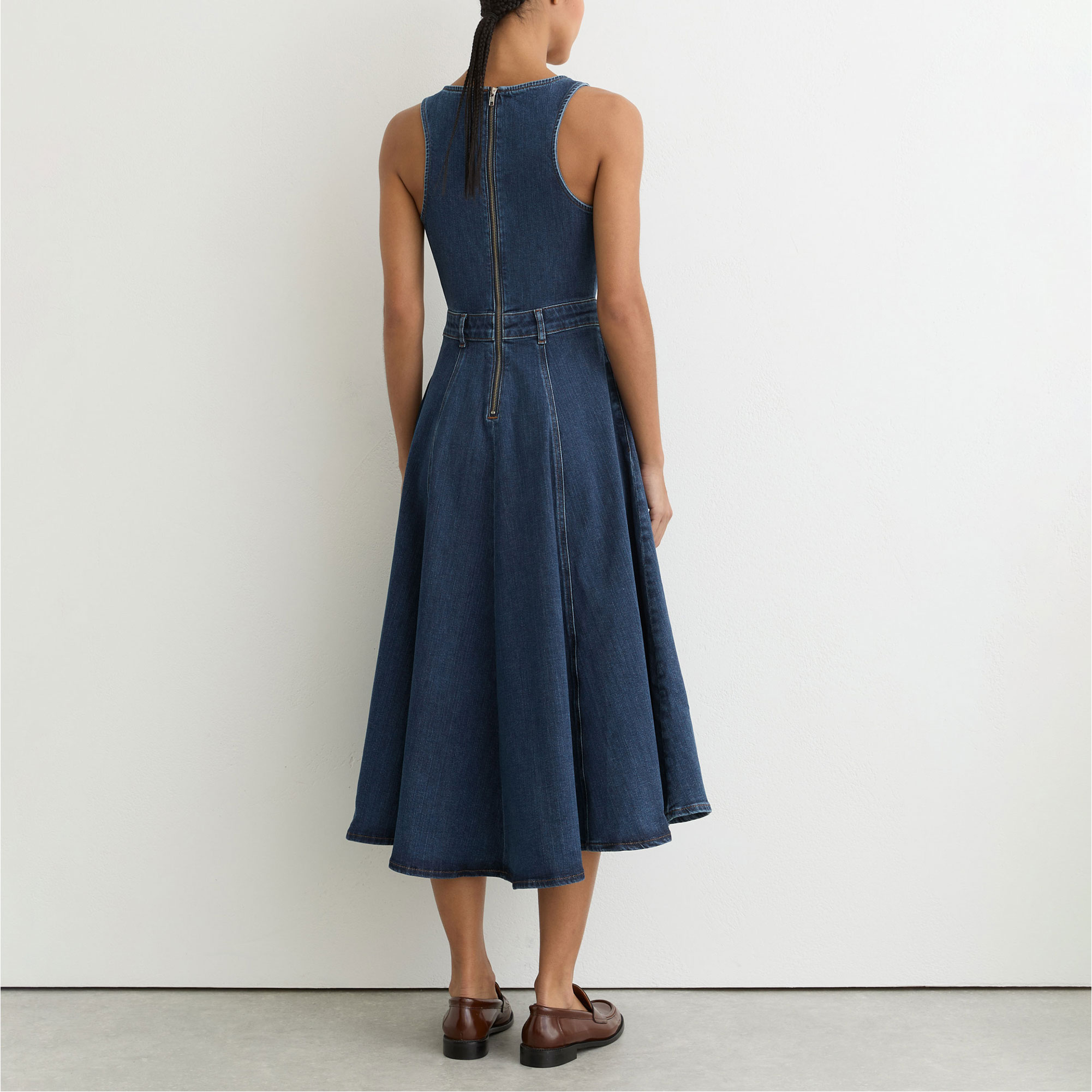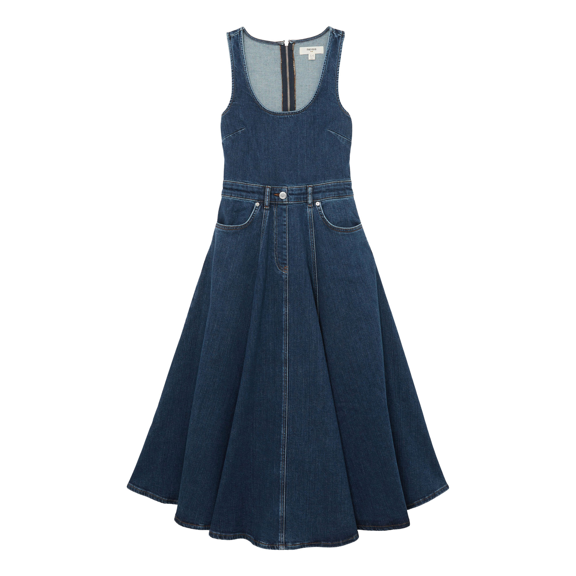 - Soft feel, stretch-infused, fit and flare silhouette, scoop neckline, sleeveless, full skirt, midi length, exposed back zip fastening, denim fabric, front pockets