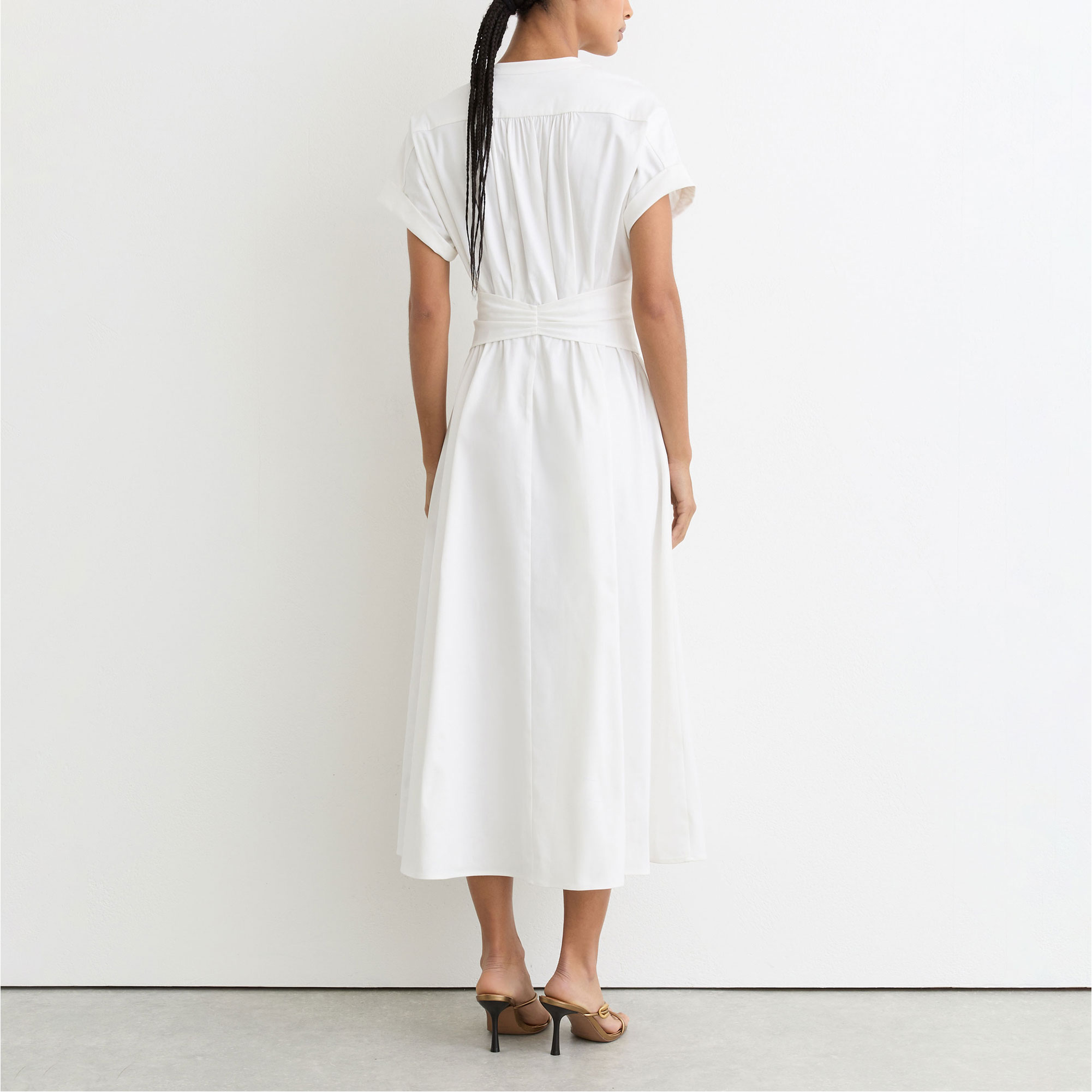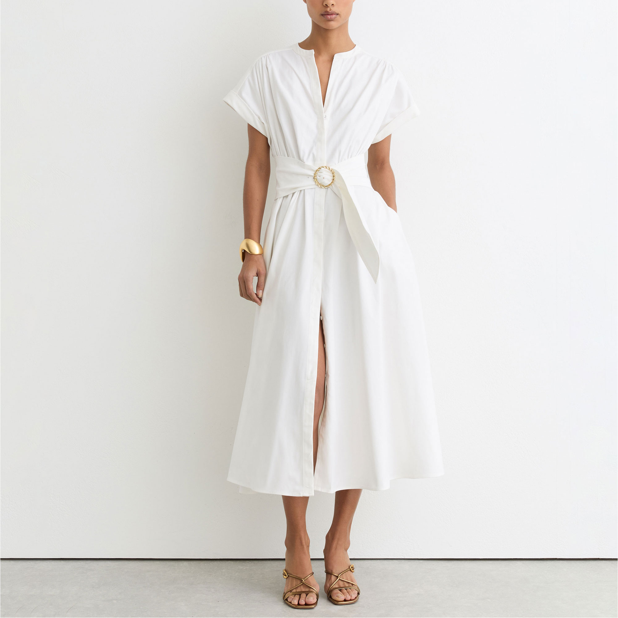 - Brushed finish, stretch-fused fabric, belted, midi silhouette, split round neckline, short cuffed sleeves, concealed front placket, twisted buckle detail, side seam pockets, fit and flare style