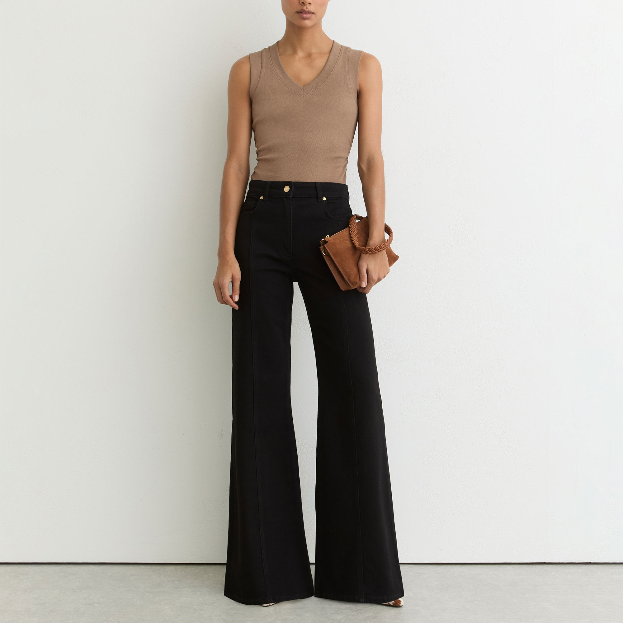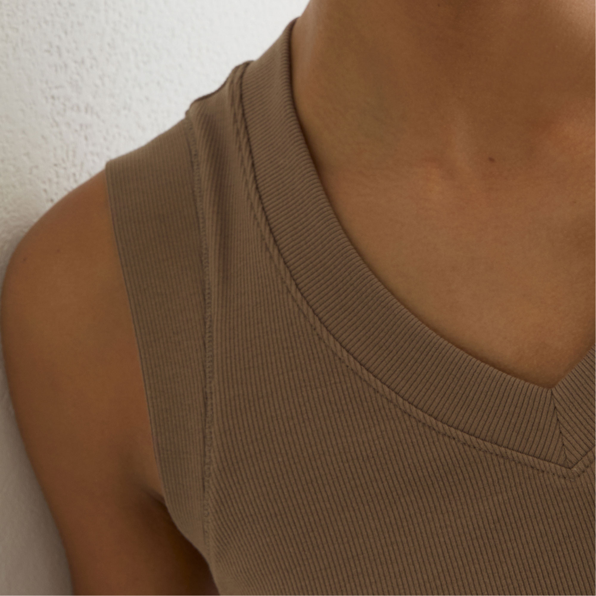 - Stretch-fused fabric, fine ribbing, V-neckline, side ruching, sleeveless