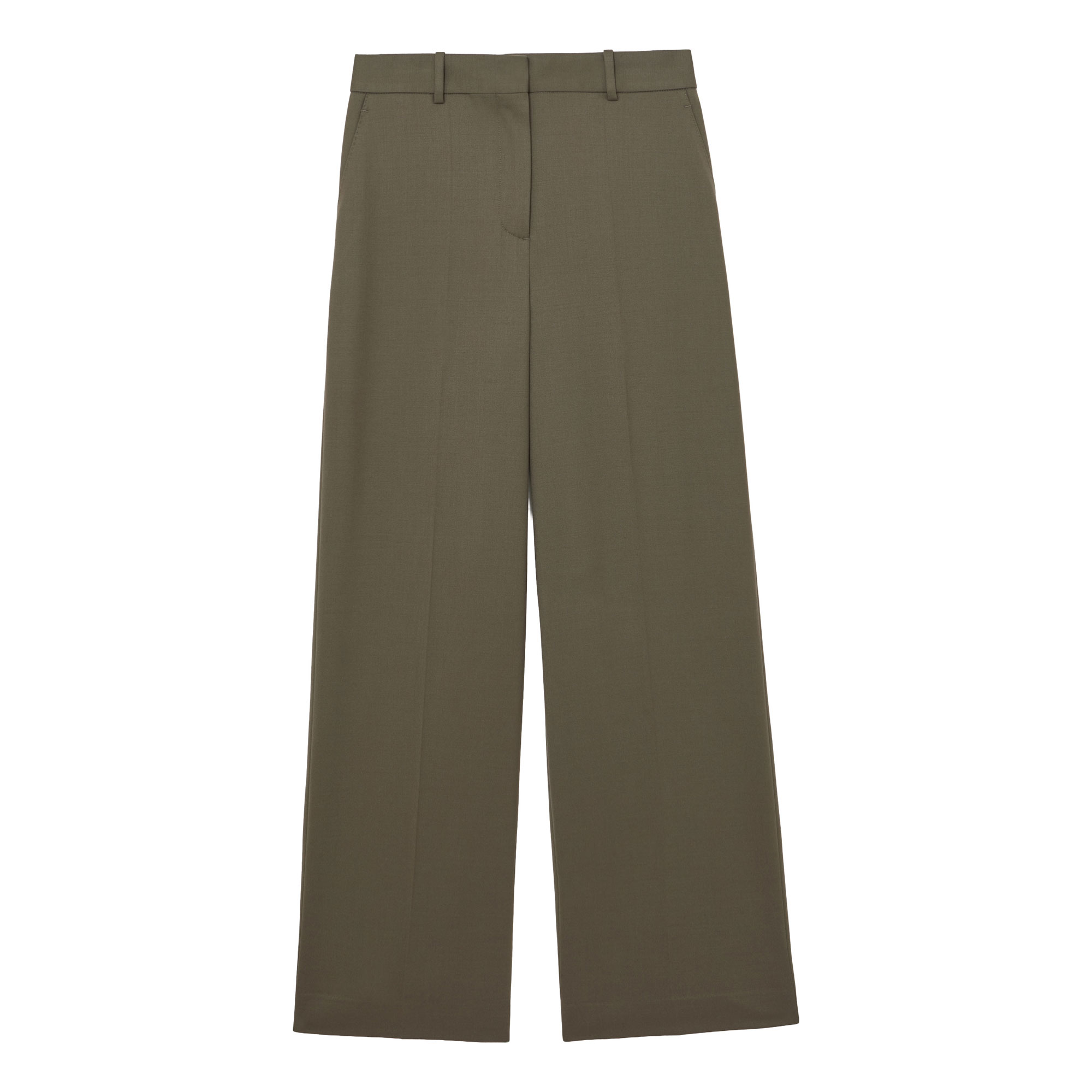 - Twill fabric, fluid style, wide-leg silhouette, pressed creases, pick-stitched side pockets, double hook-and-bar with zip fastening