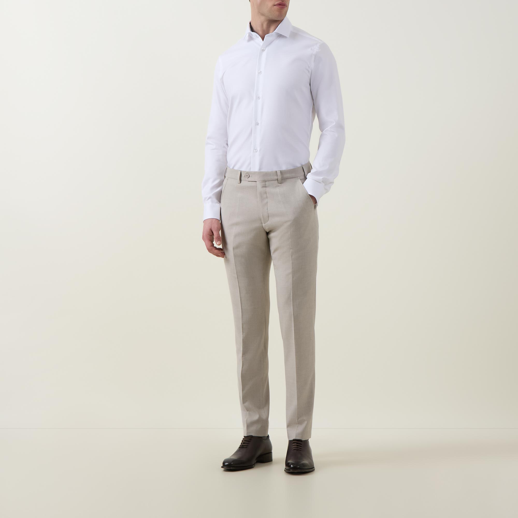 - Point collar, long sleeves, front button placket, tonal stitching, geometric trim, single-button cuffs, darting the back, curved hemline, smooth fabric