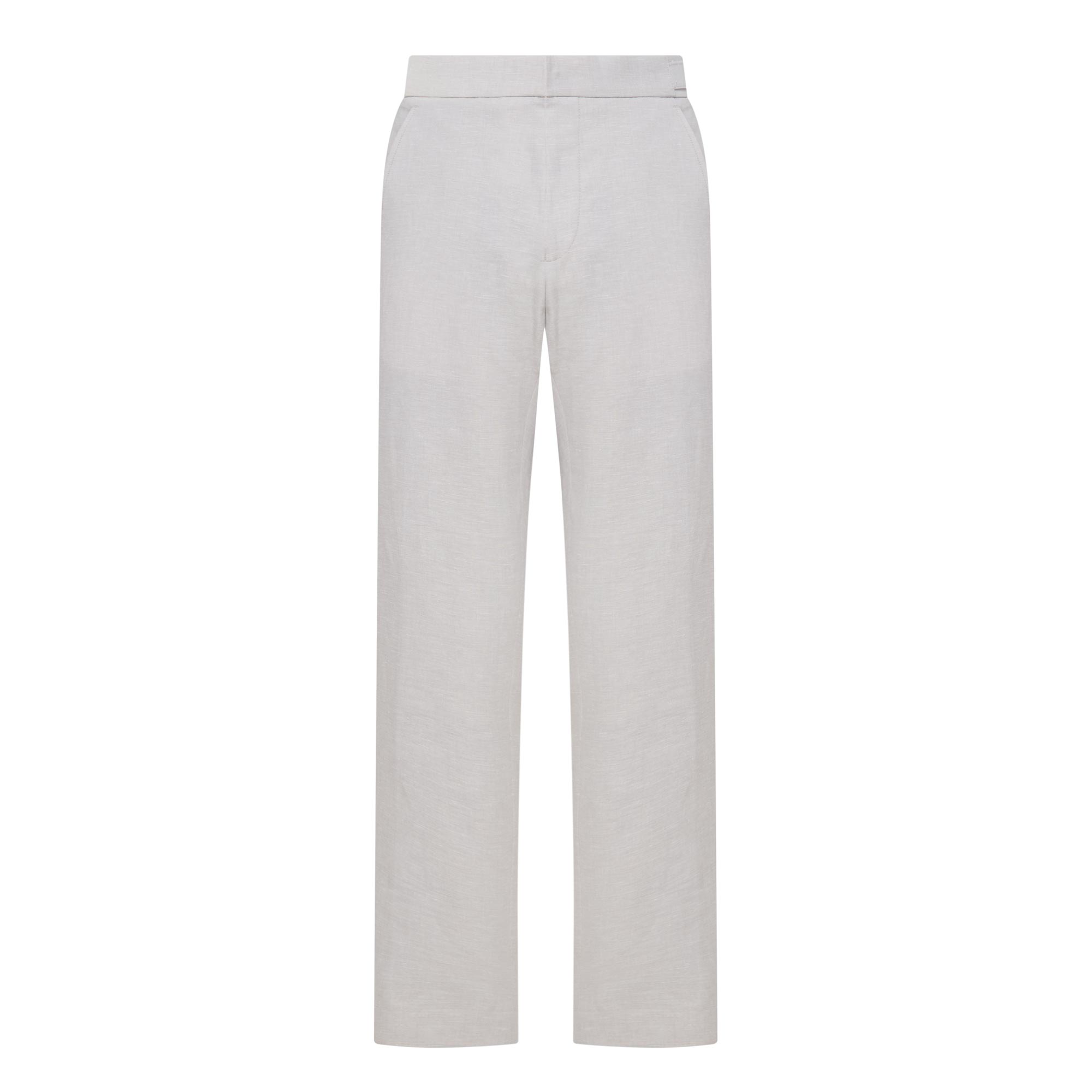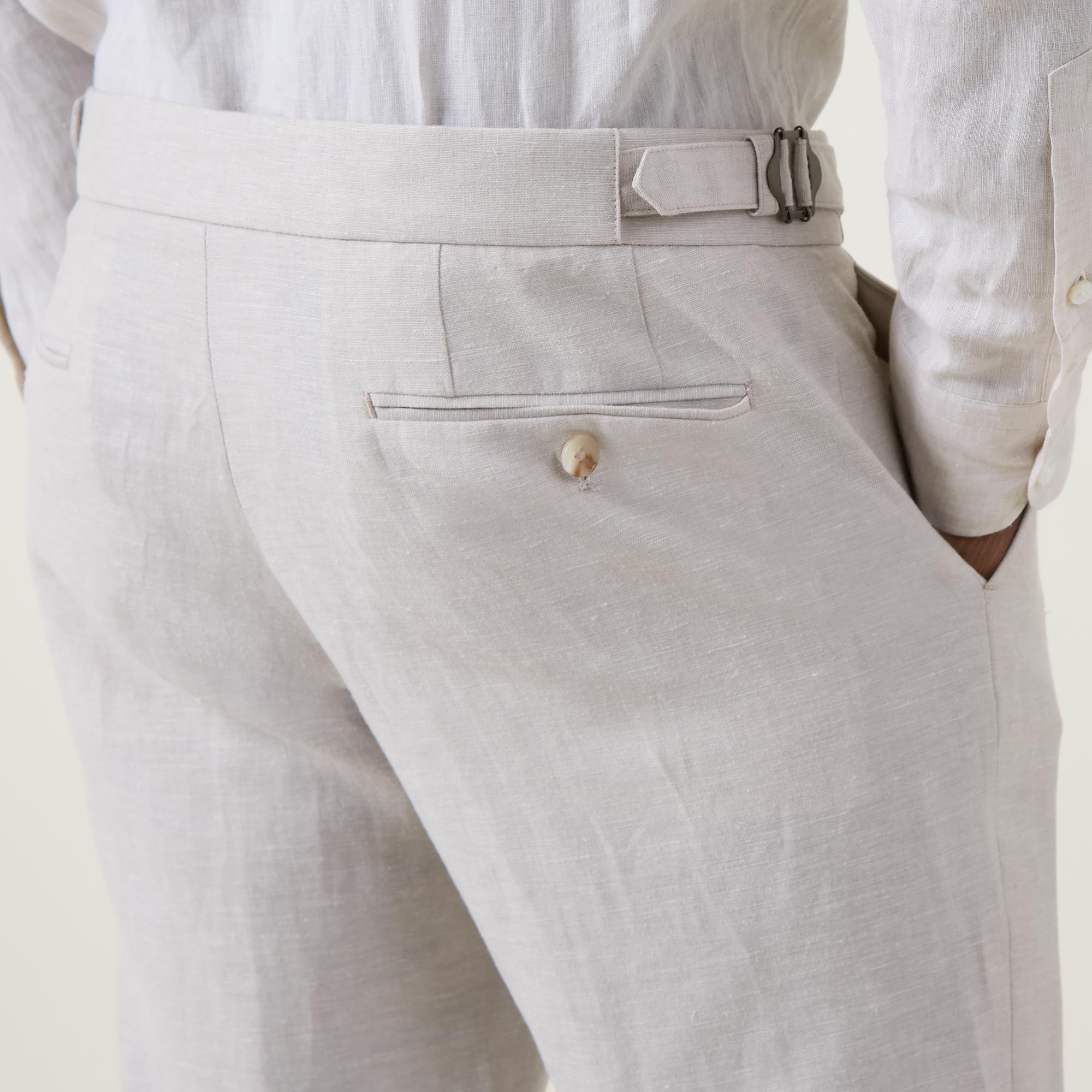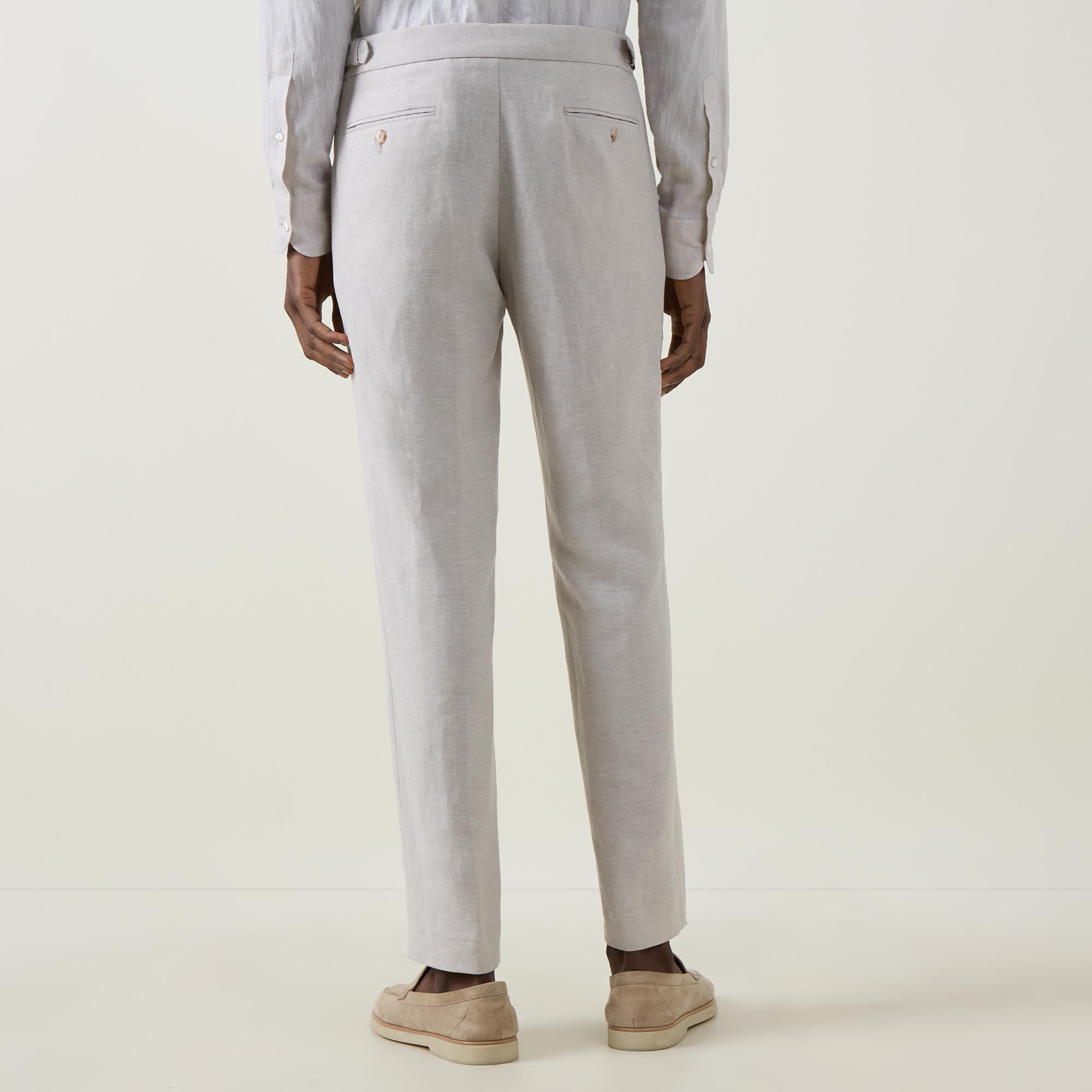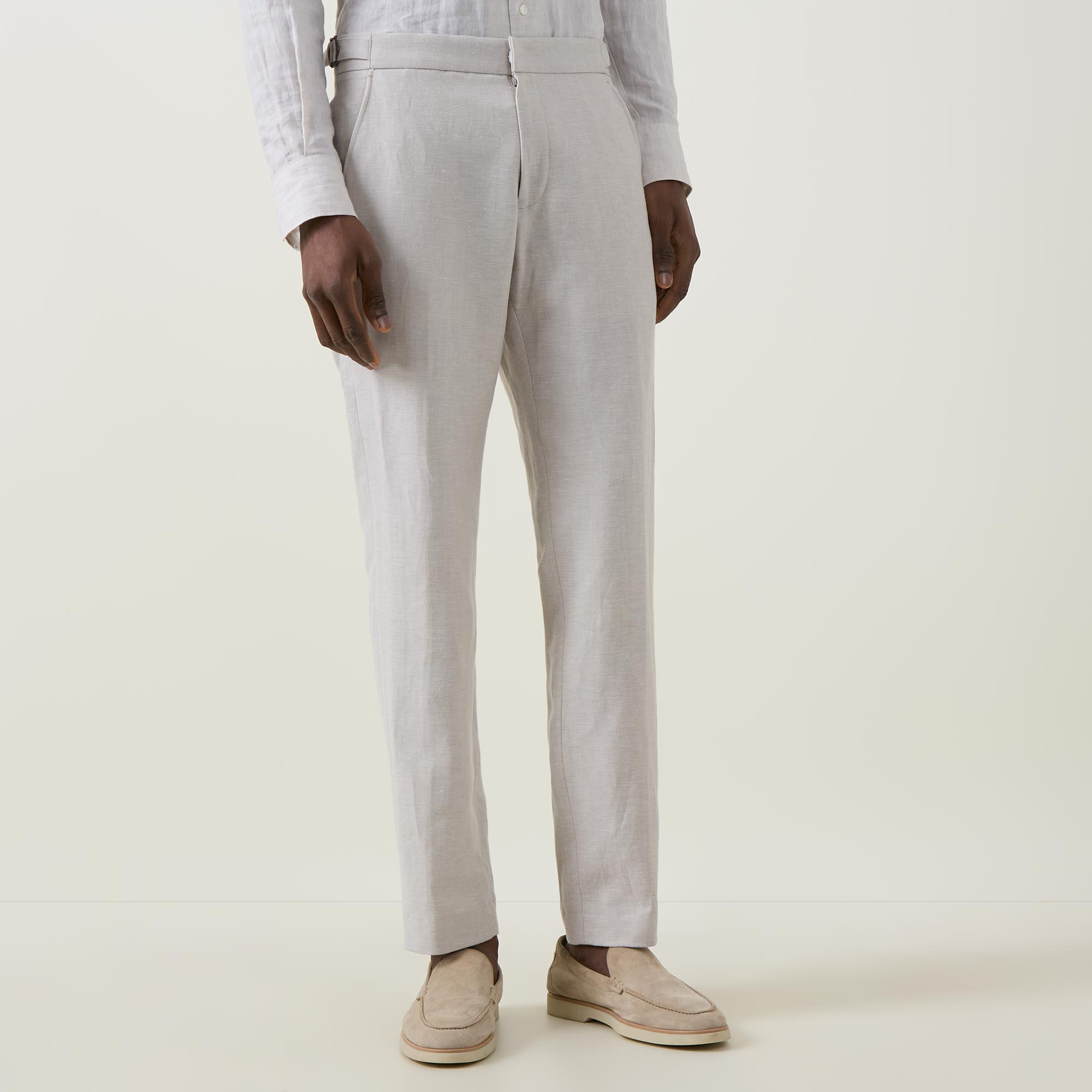 - Mid-rise, slim-leg, adjustable waistband, concealed fly with hook and bar fastening, two side slit pockets, two rear welt pockets with button fastenings, clean hems, lightweight