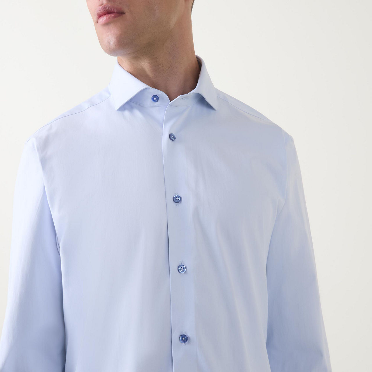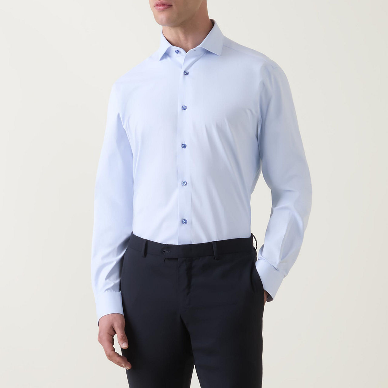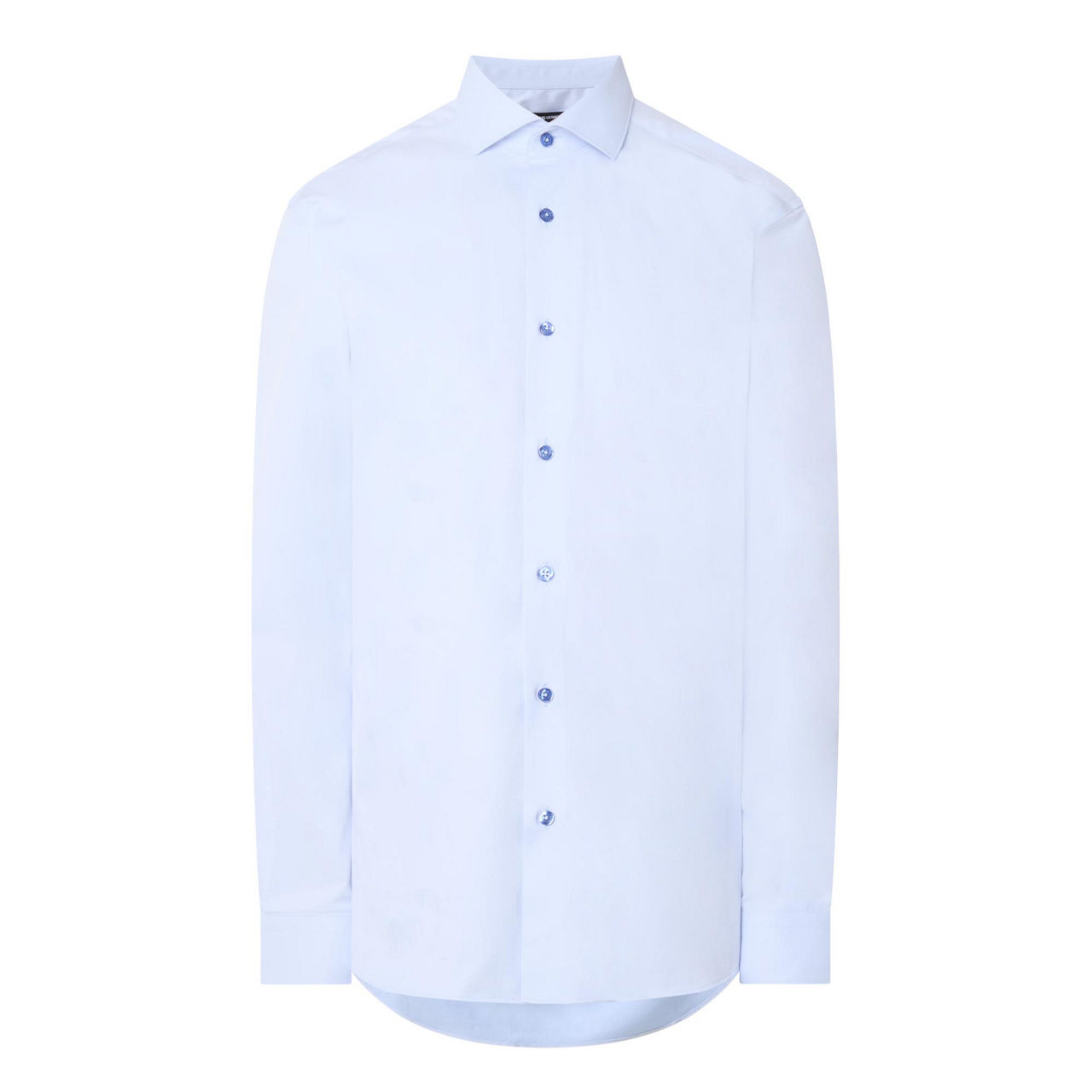 • Long sleeves, pointed collar, button fastening, darted seams to the back, tonal stitching, single-button cuffs, curved hemline, smooth fabric