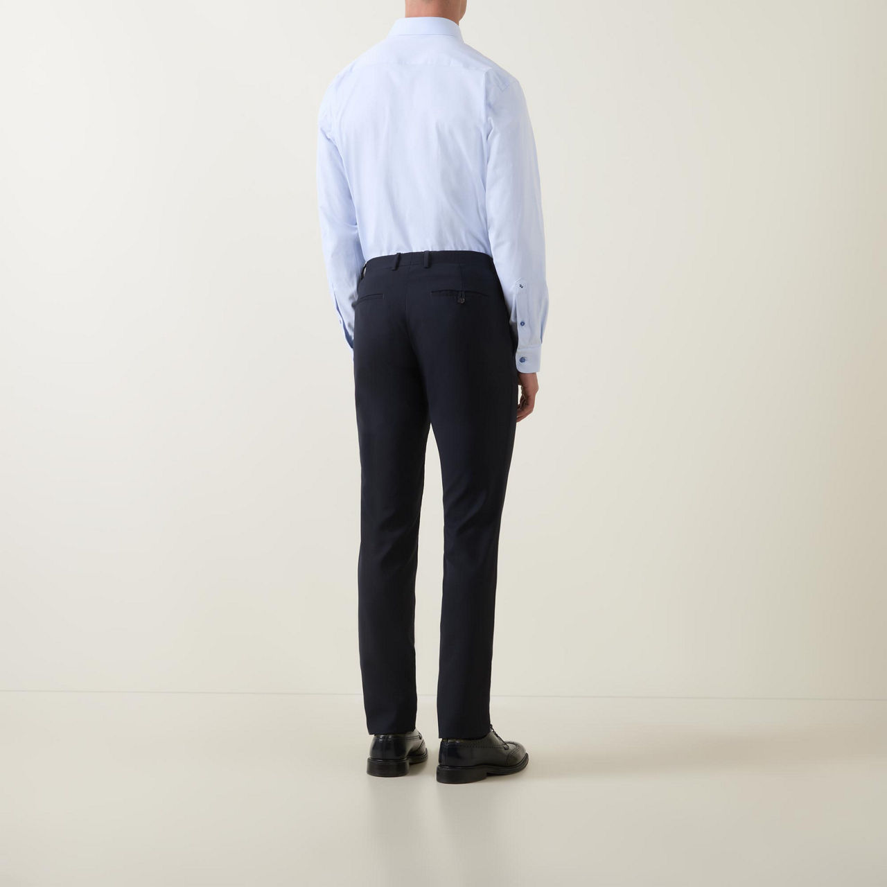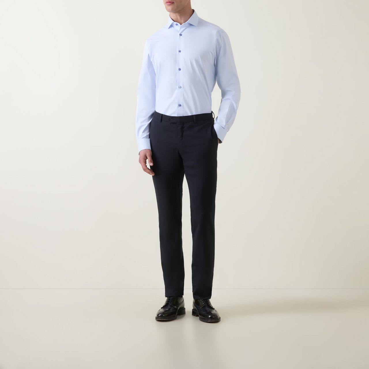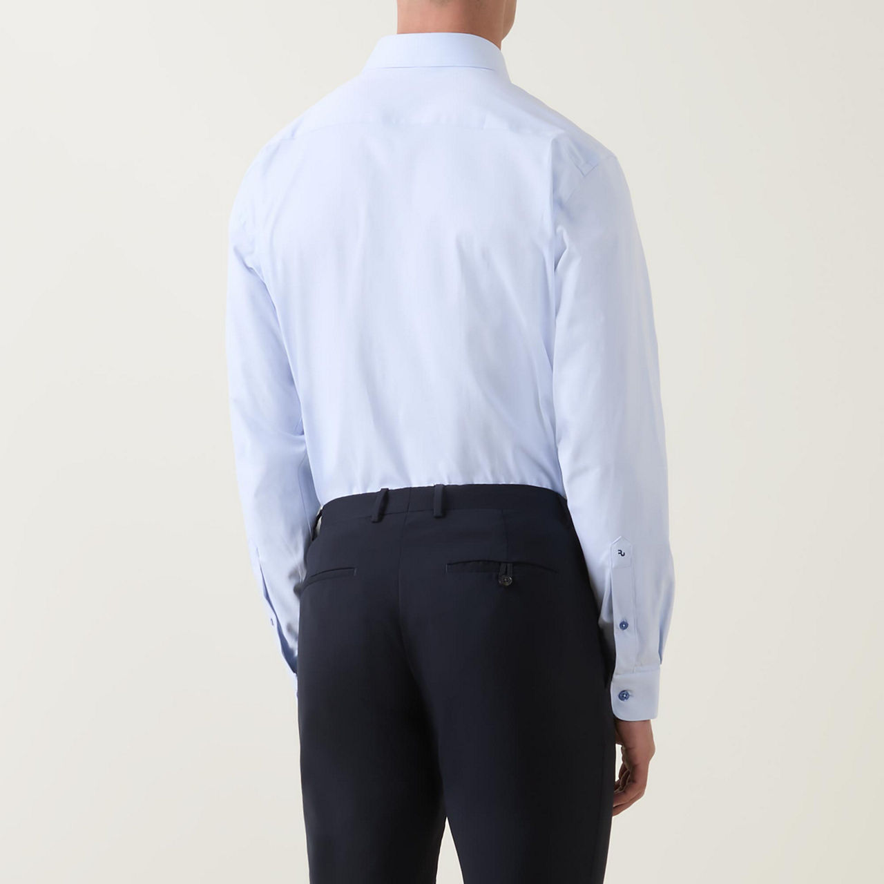 • Long sleeves, pointed collar, button fastening, darted seams to the back, tonal stitching, single-button cuffs, curved hemline, smooth fabric