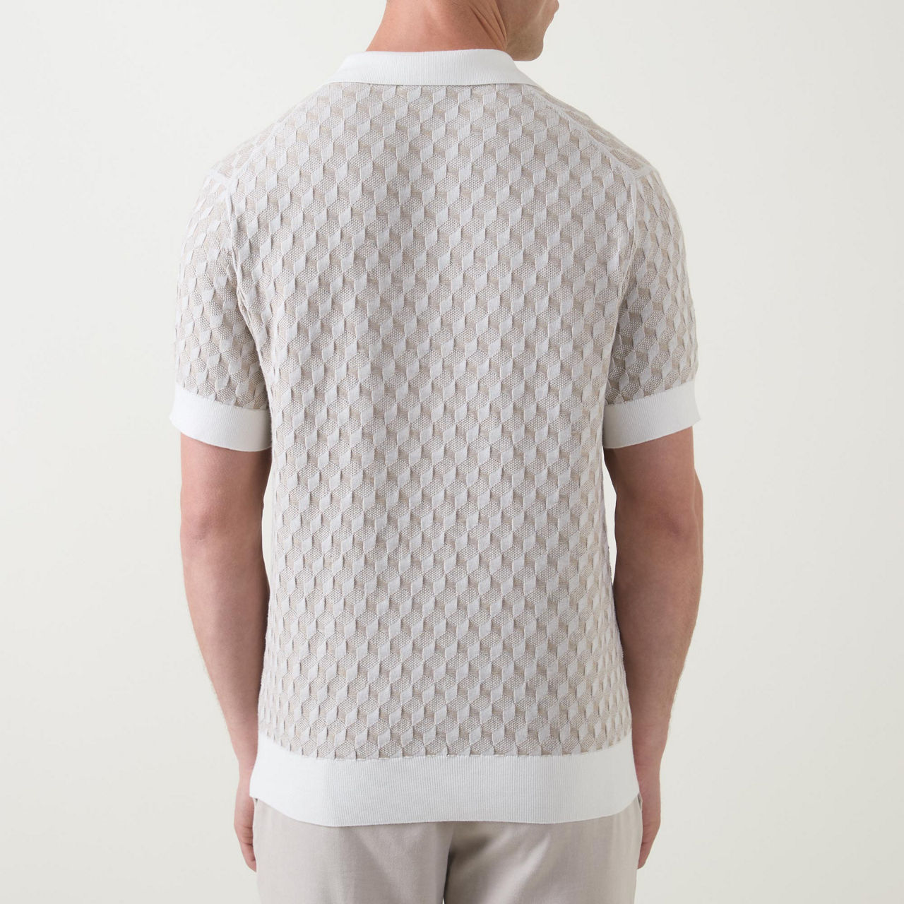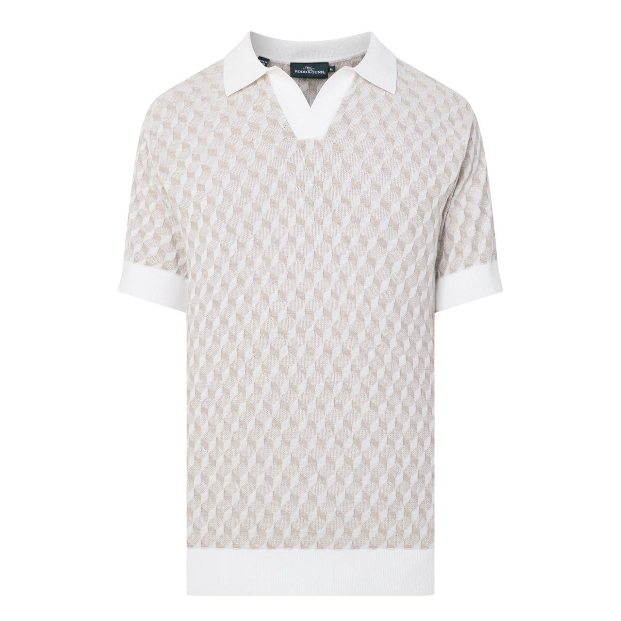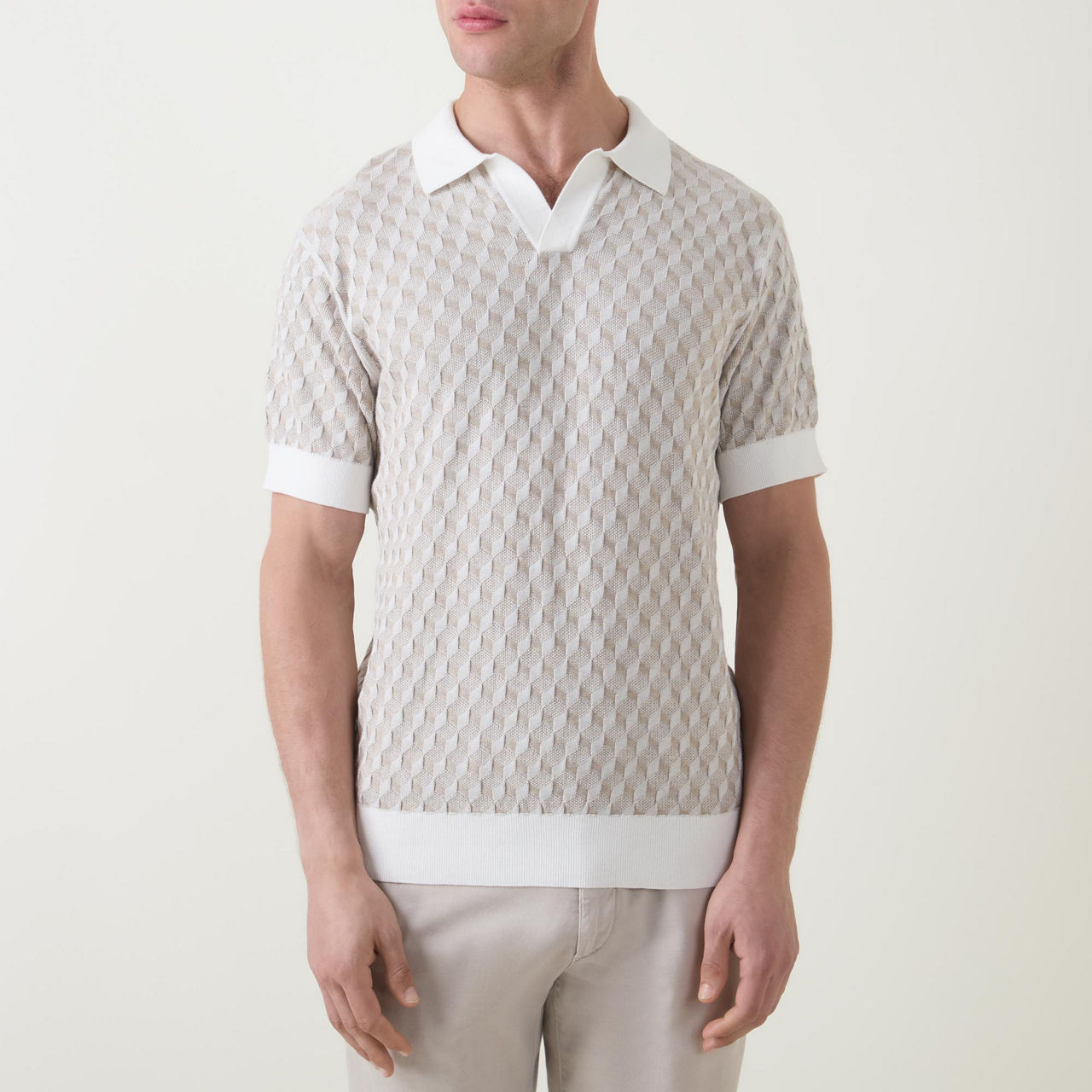 • Open placket, polo collar, short sleeves, diamond pattern, ribbed trims