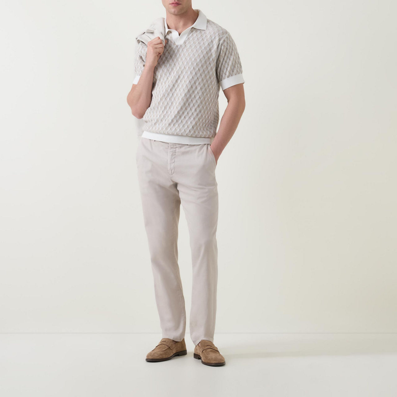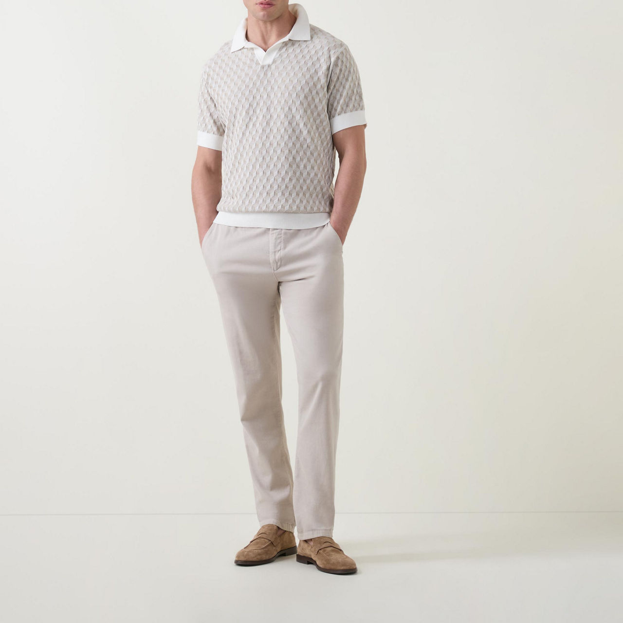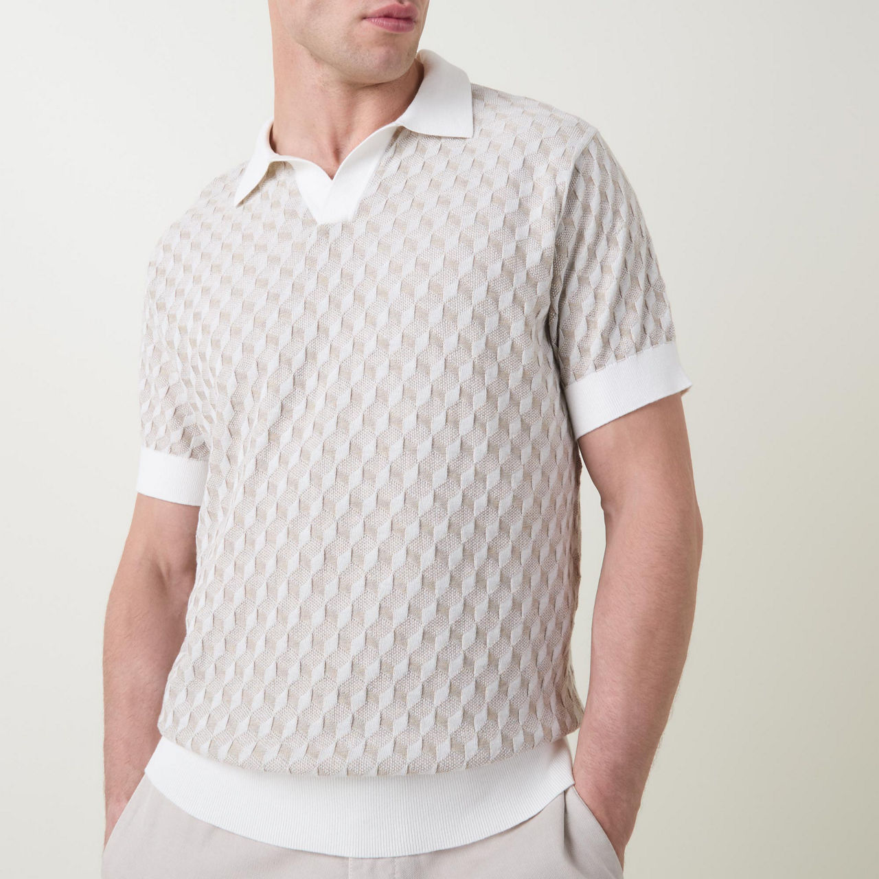• Open placket, polo collar, short sleeves, diamond pattern, ribbed trims