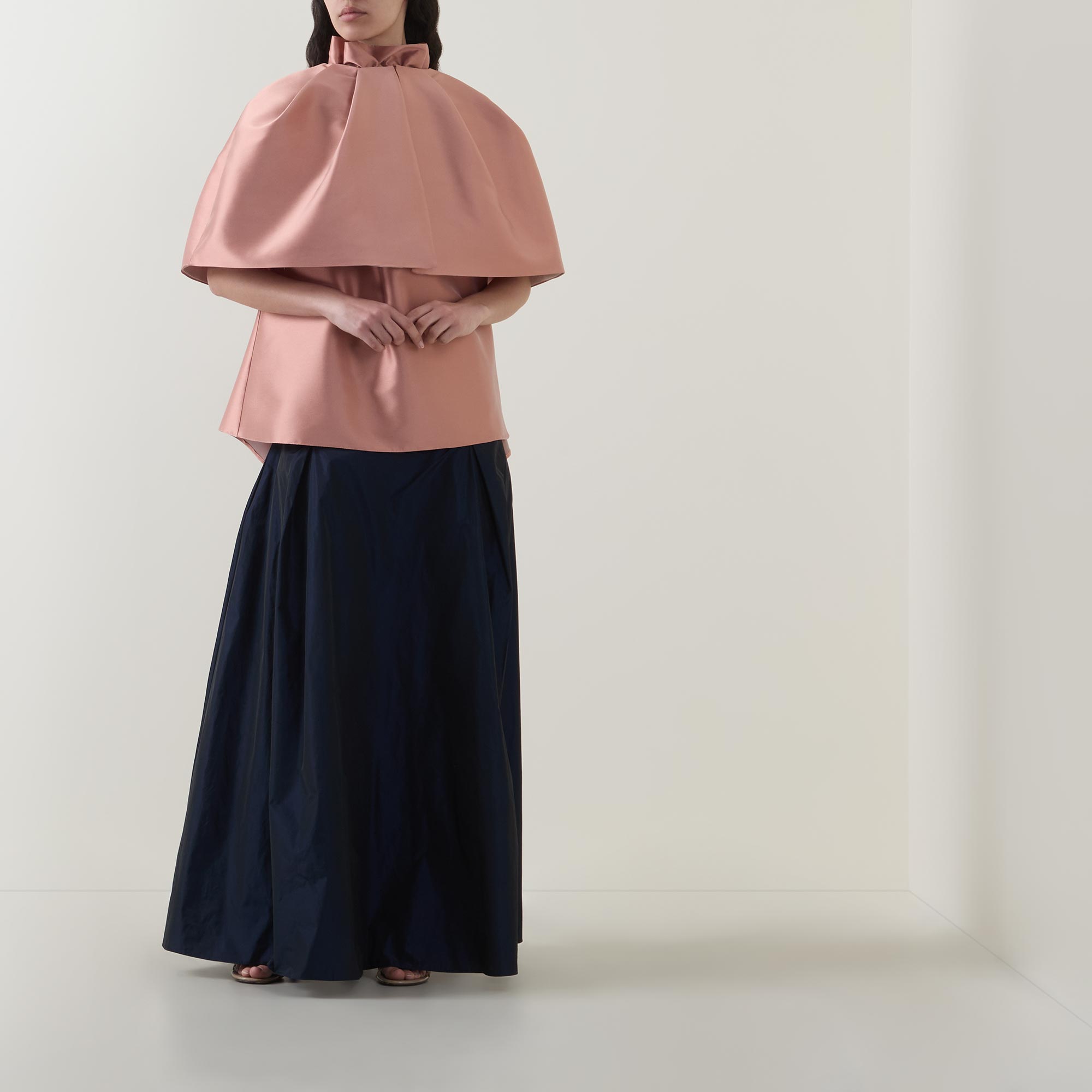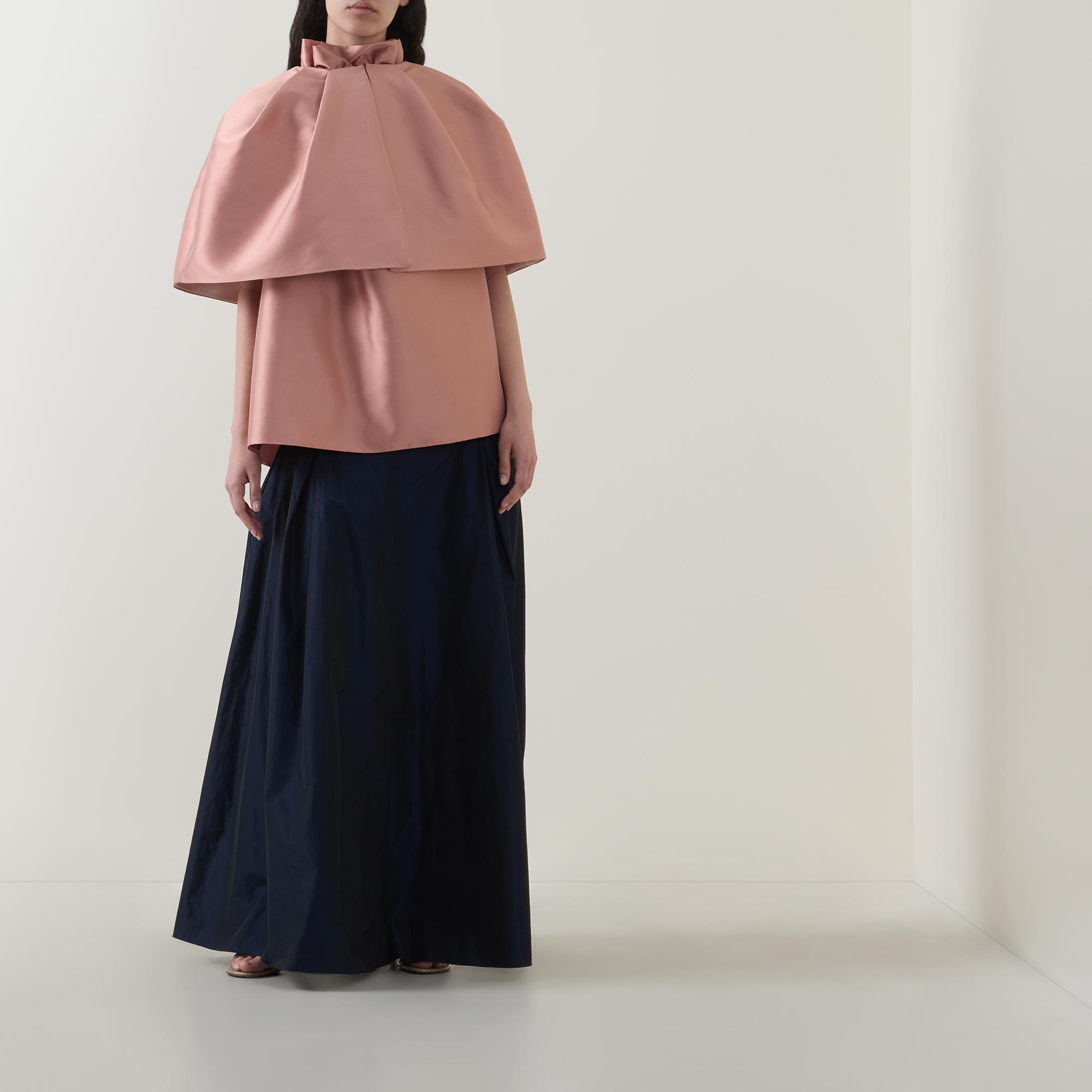 - Hook and eye fastening, cape style, cropped length, voluminous silhouette