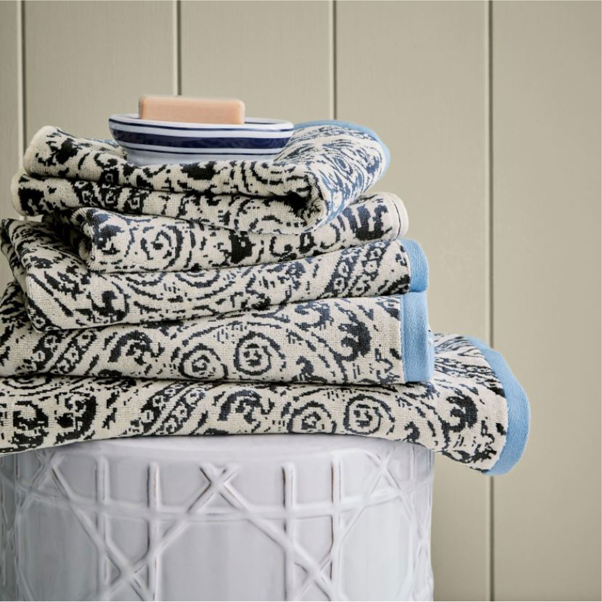 In a fresco style reminiscent of Indian block prints, a mirrored ogee trellis with decorative damask detail features on this two-coloured Terry velour towel with contrast hem. Made from 100% Cotton. Available in a selection of colourways.