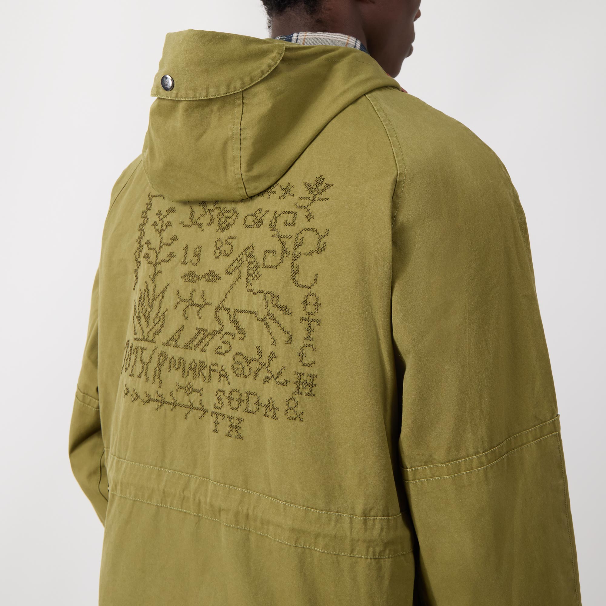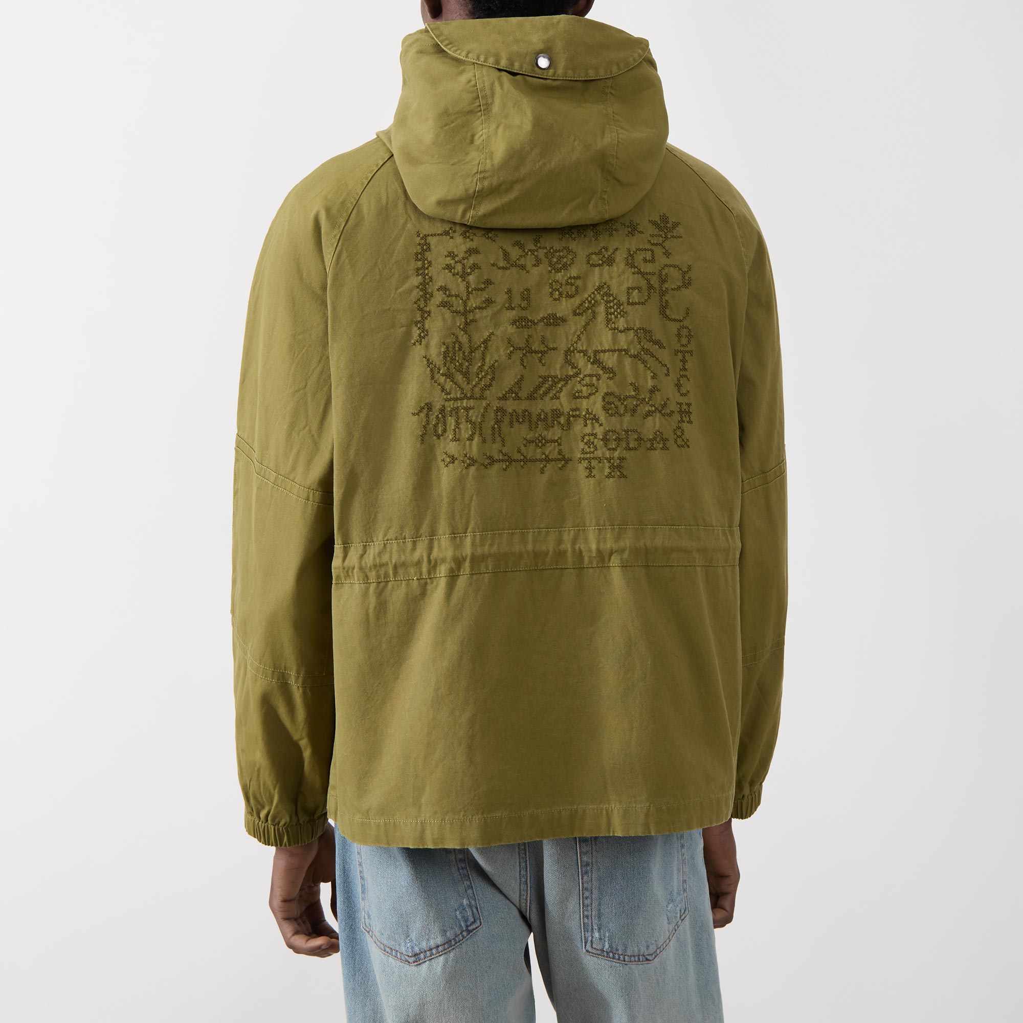 - Hood with drawstring adjustable fit, snap button storm guard, zip fastening, long sleeves, dropped shoulders, drawstring adjustable waist, multiple flap pockets, embroidered details to the back, elasticated cuffs, logo details
