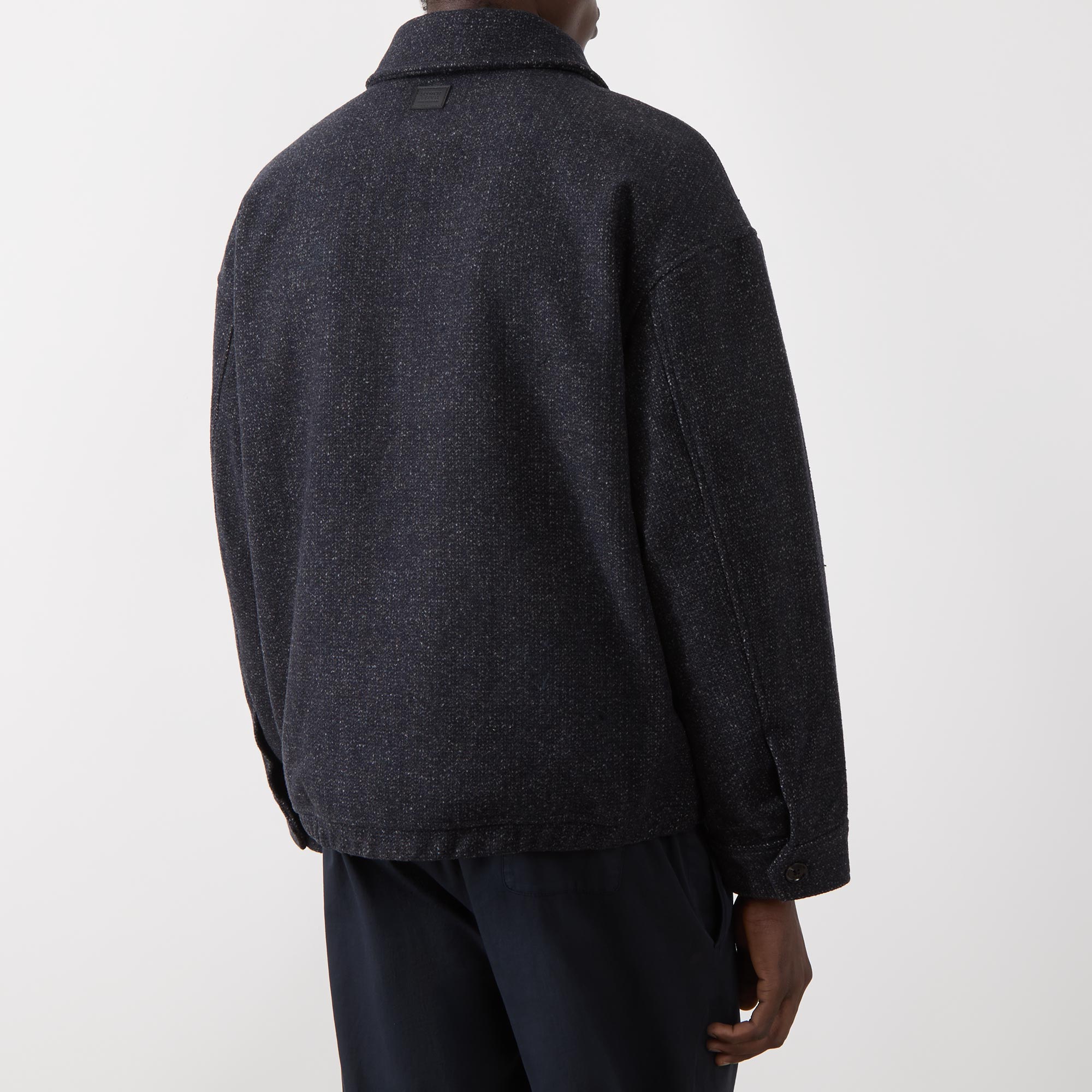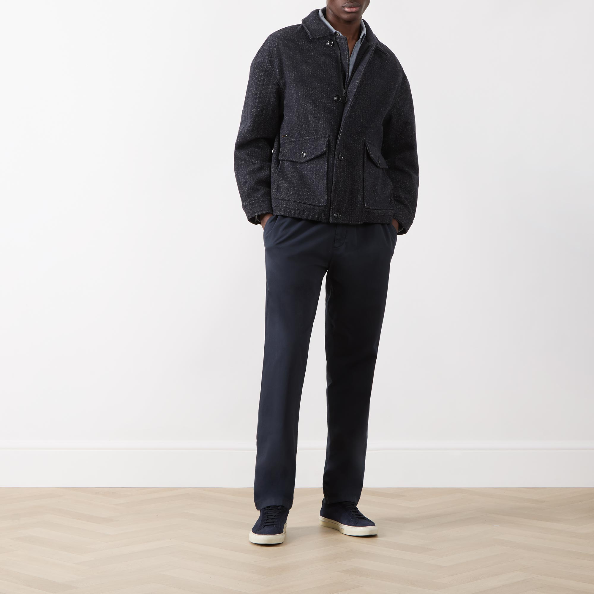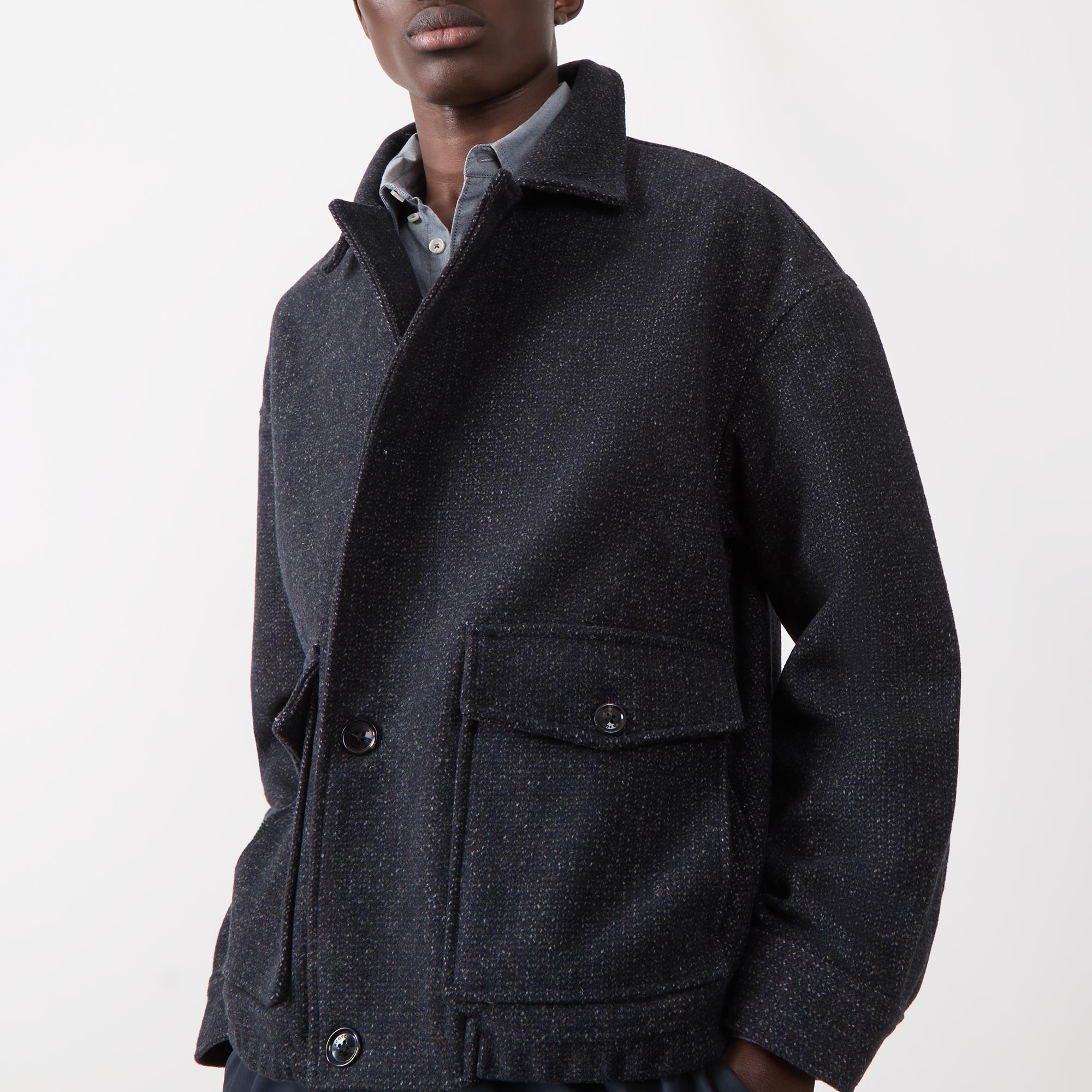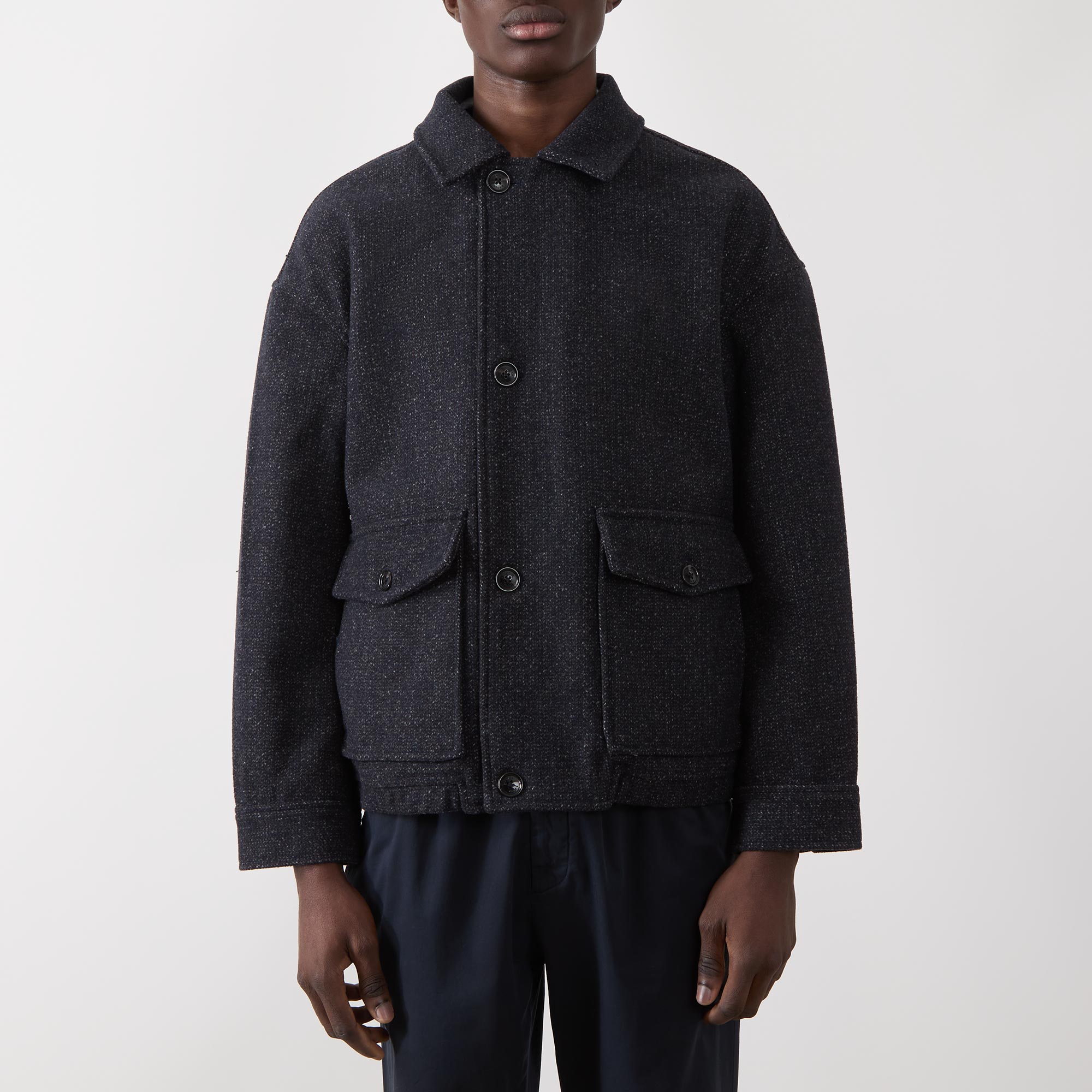 - Flat collar, off-centre button and concealed zip fastening, elasticated hem, textured knit, flap pockets, buttoned cuffs, logo badge