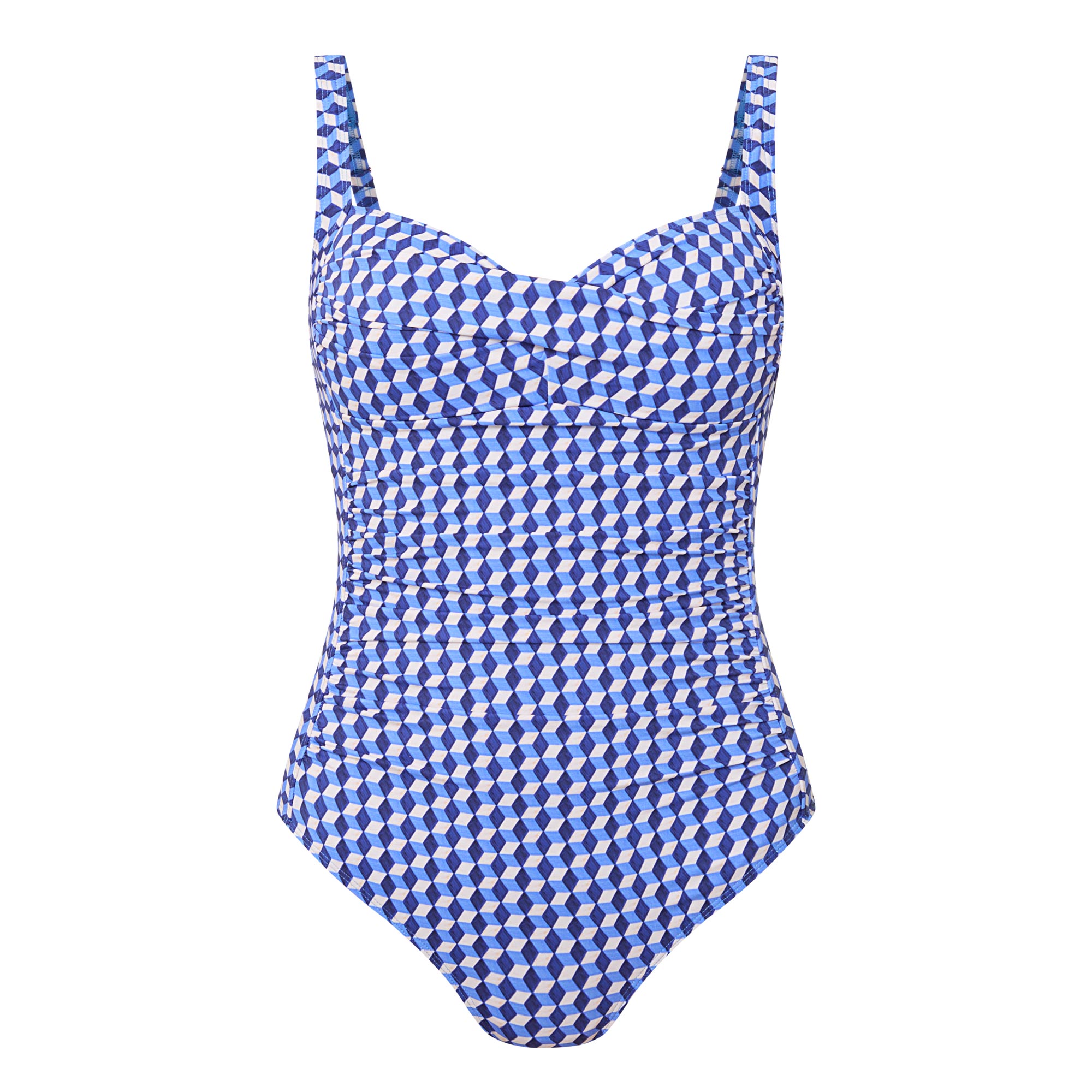 - Sweetheart neckline, twisted front, wide adjustable straps, high cut leg, gathered detailing, abstract printed design, lined