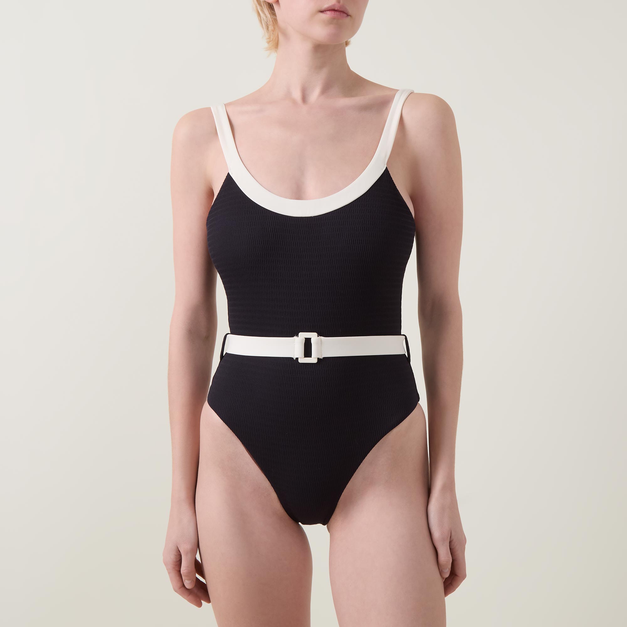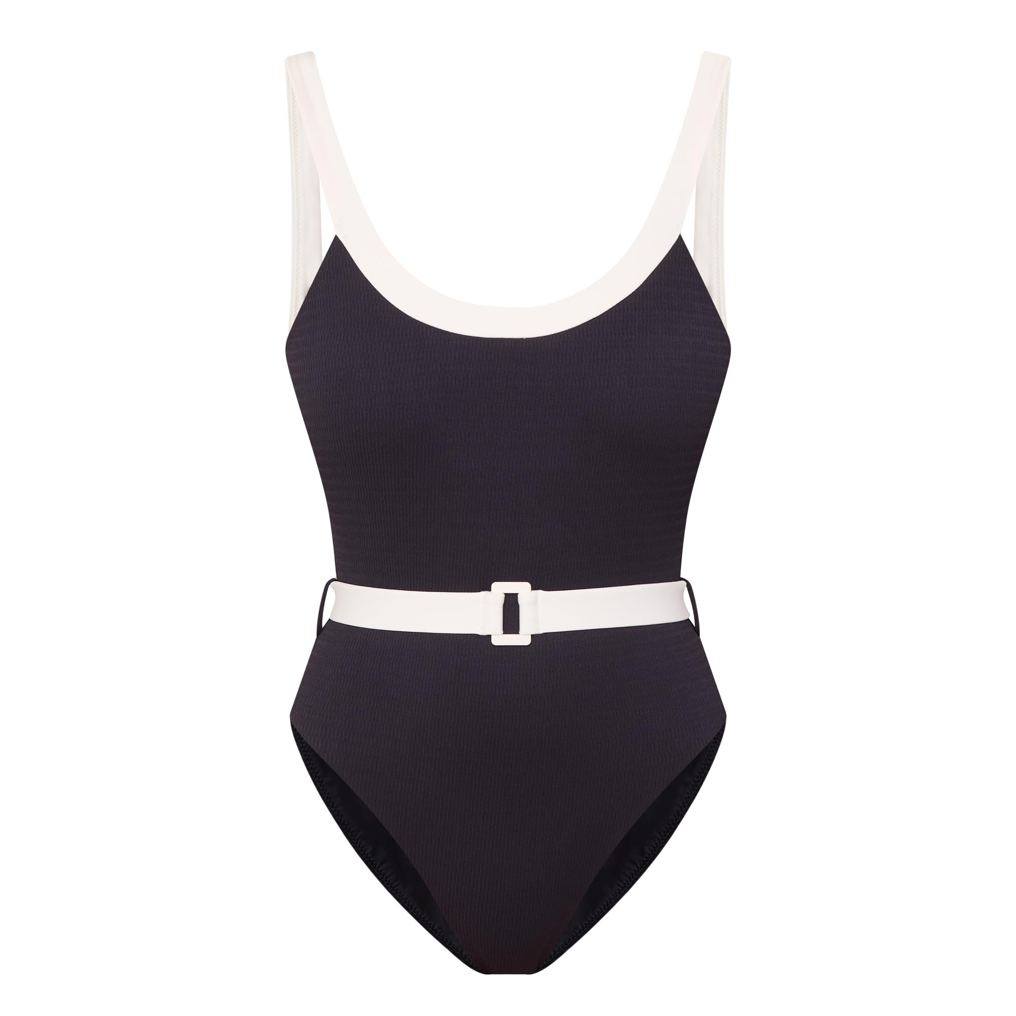 - Scoop neckline, internal shelf bra for bust support, removable cups, contrast belt with clip detail, contrast bind, high legline, skimpy coverage, smooth finish