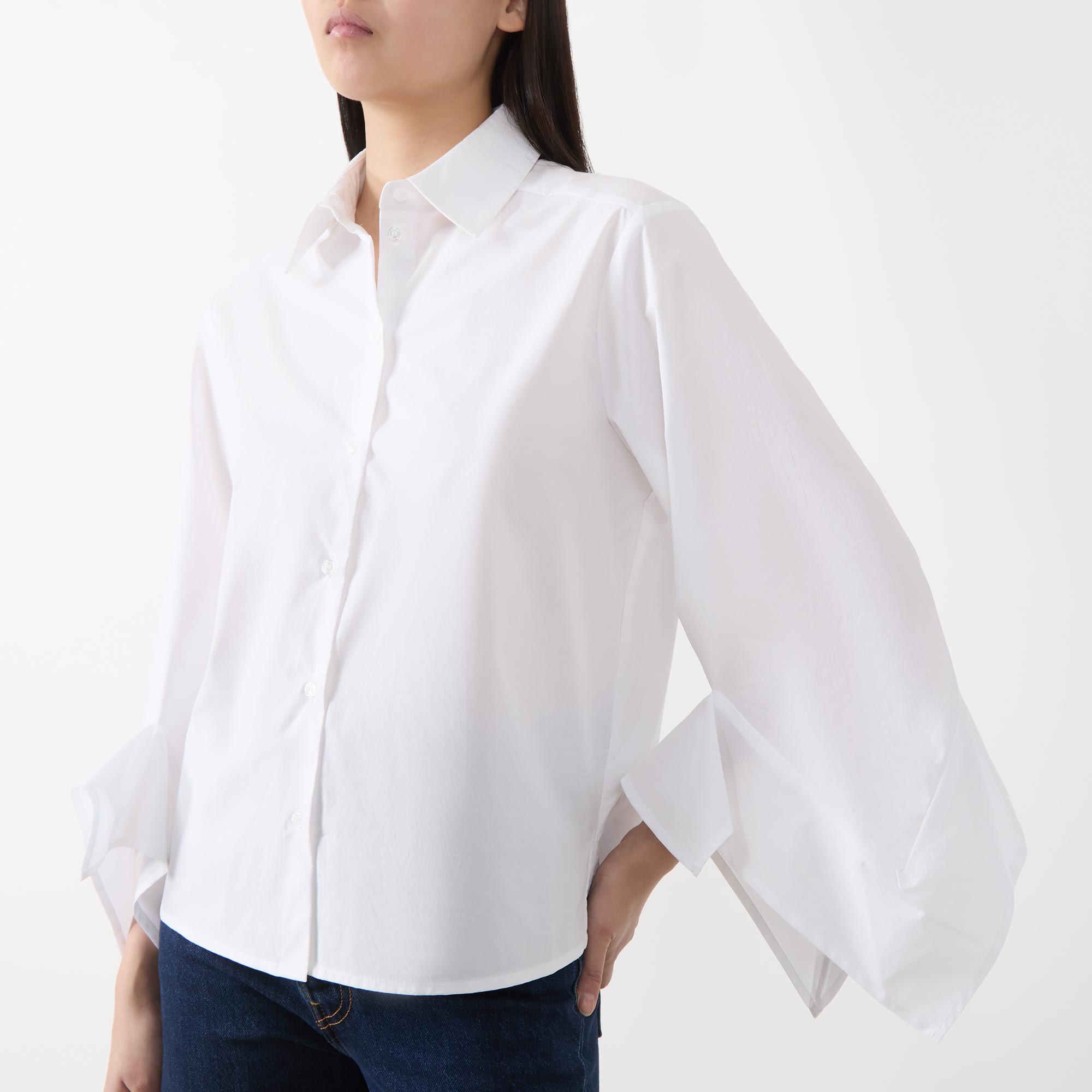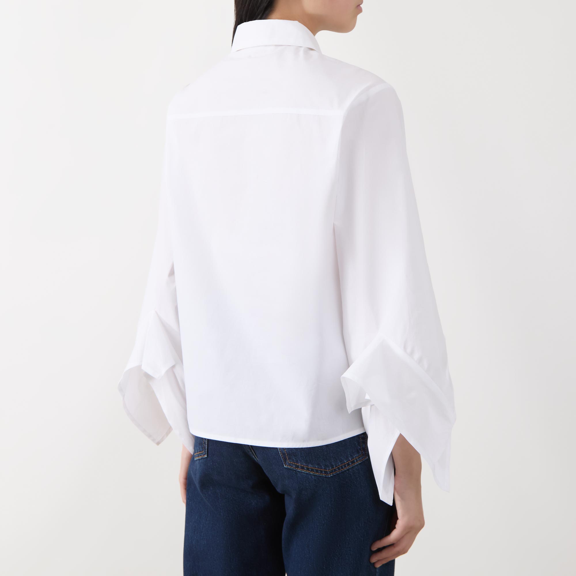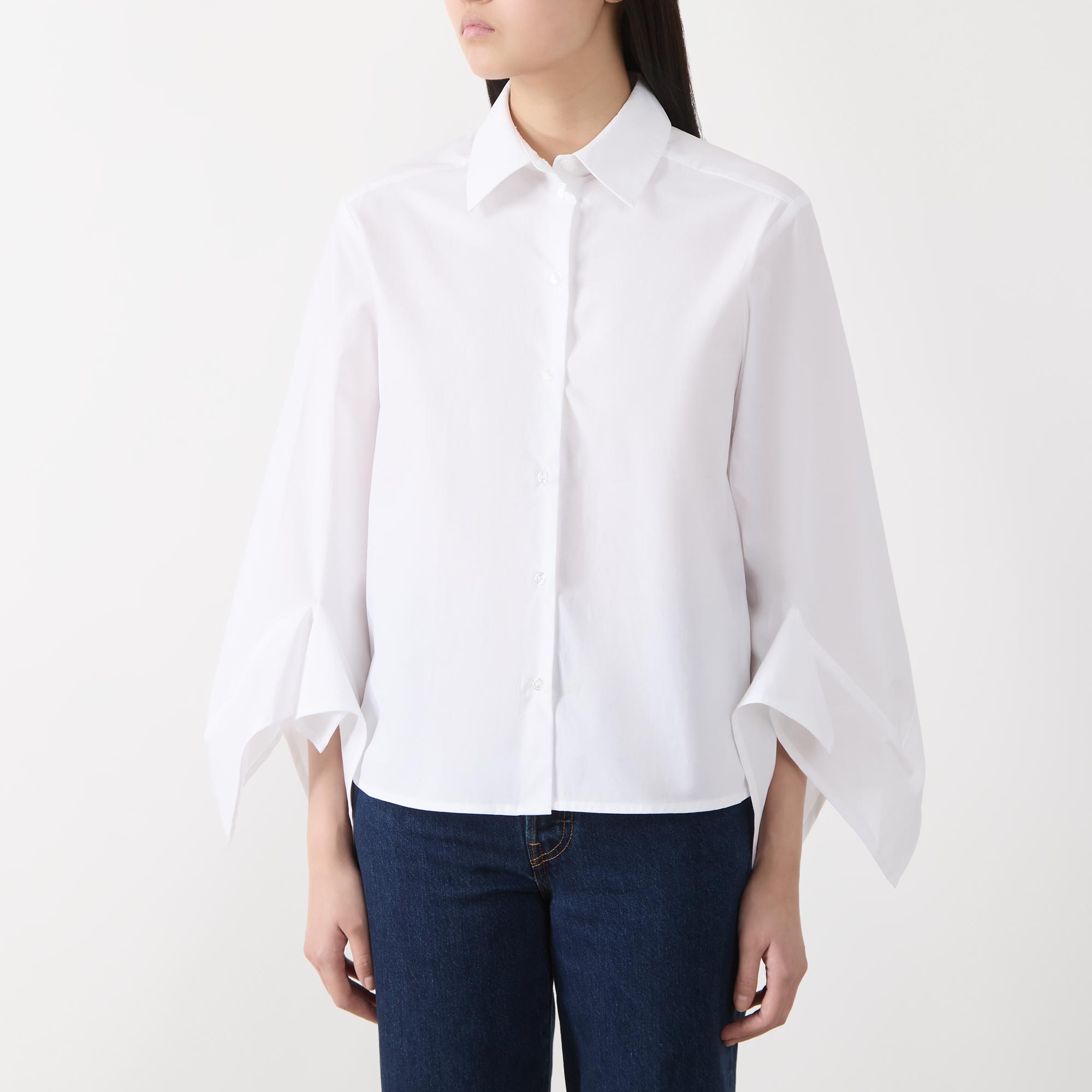 • Point collar, dropped shoulders, three quarter length asymmetric sleeves, front button fastening, curved hem, crisp finish