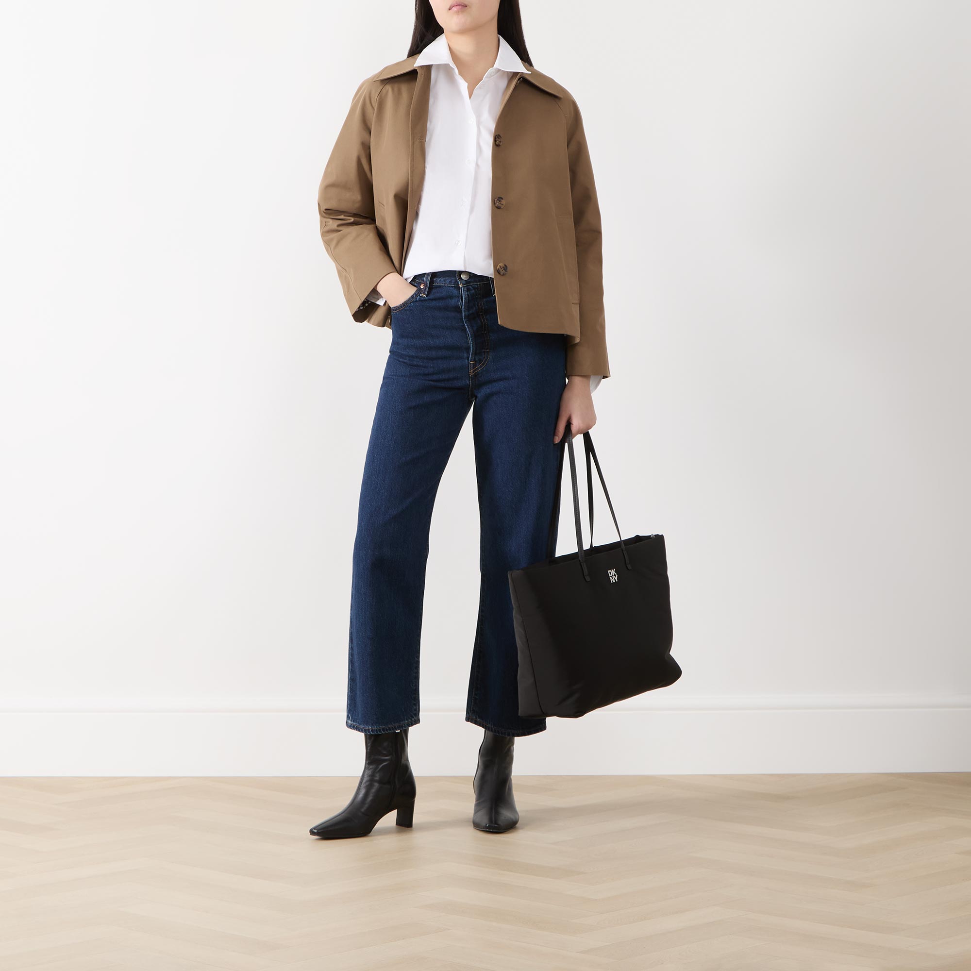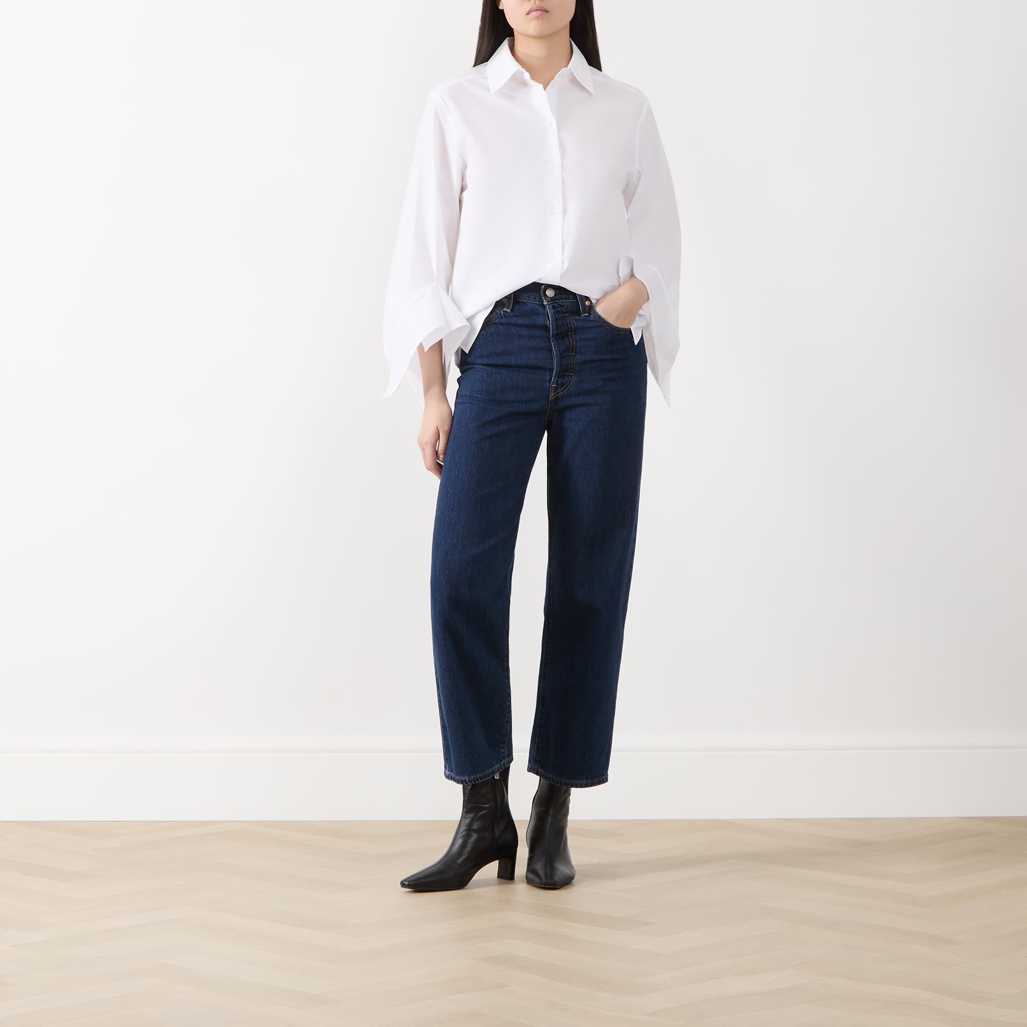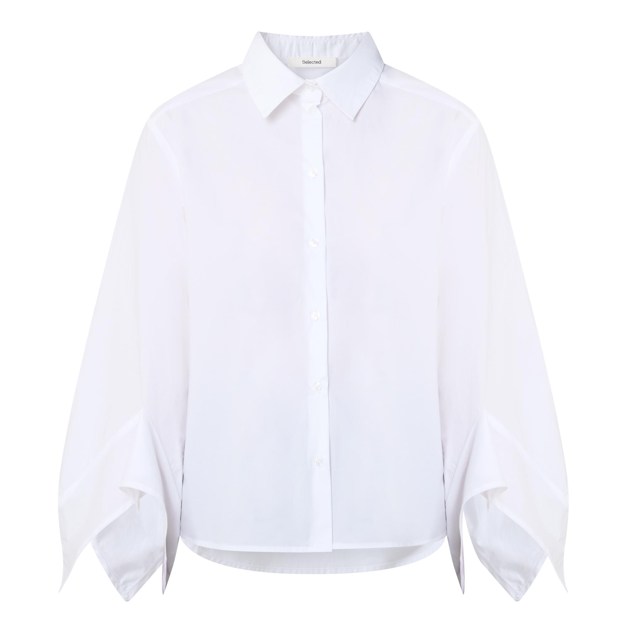 • Point collar, dropped shoulders, three quarter length asymmetric sleeves, front button fastening, curved hem, crisp finish