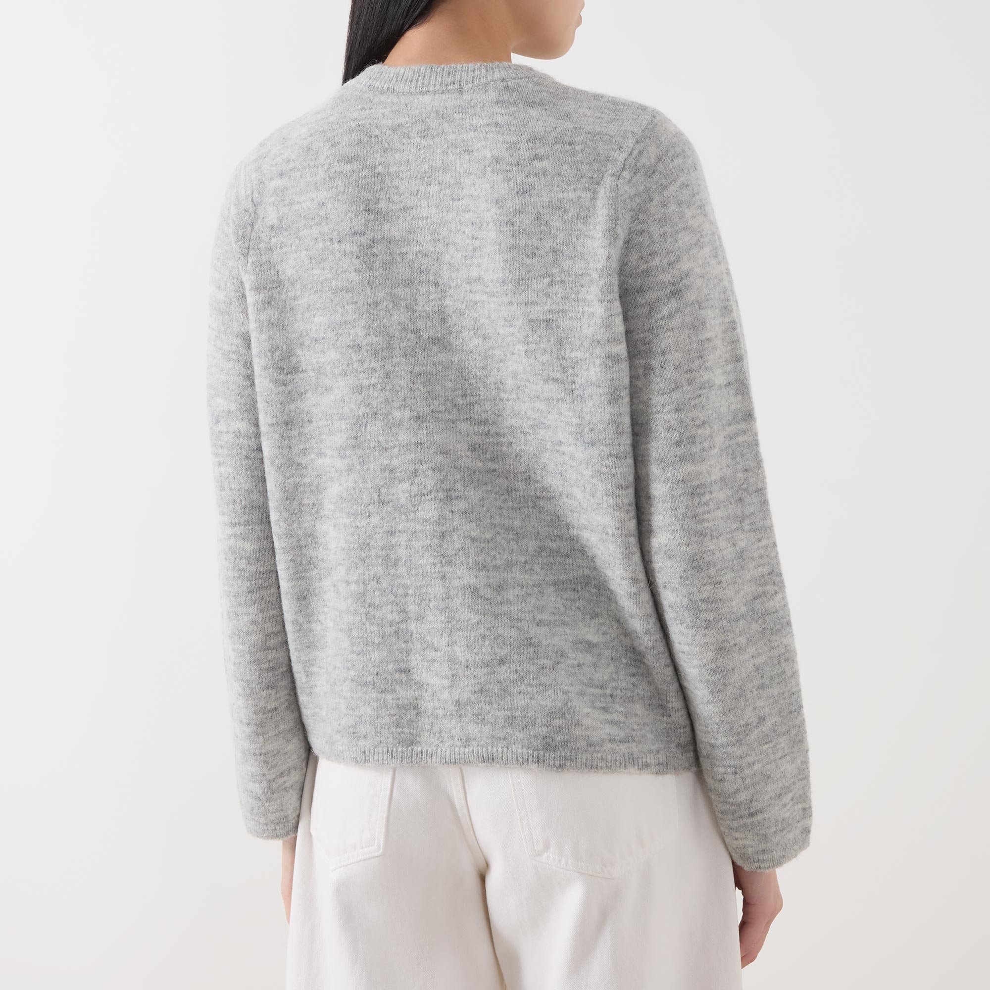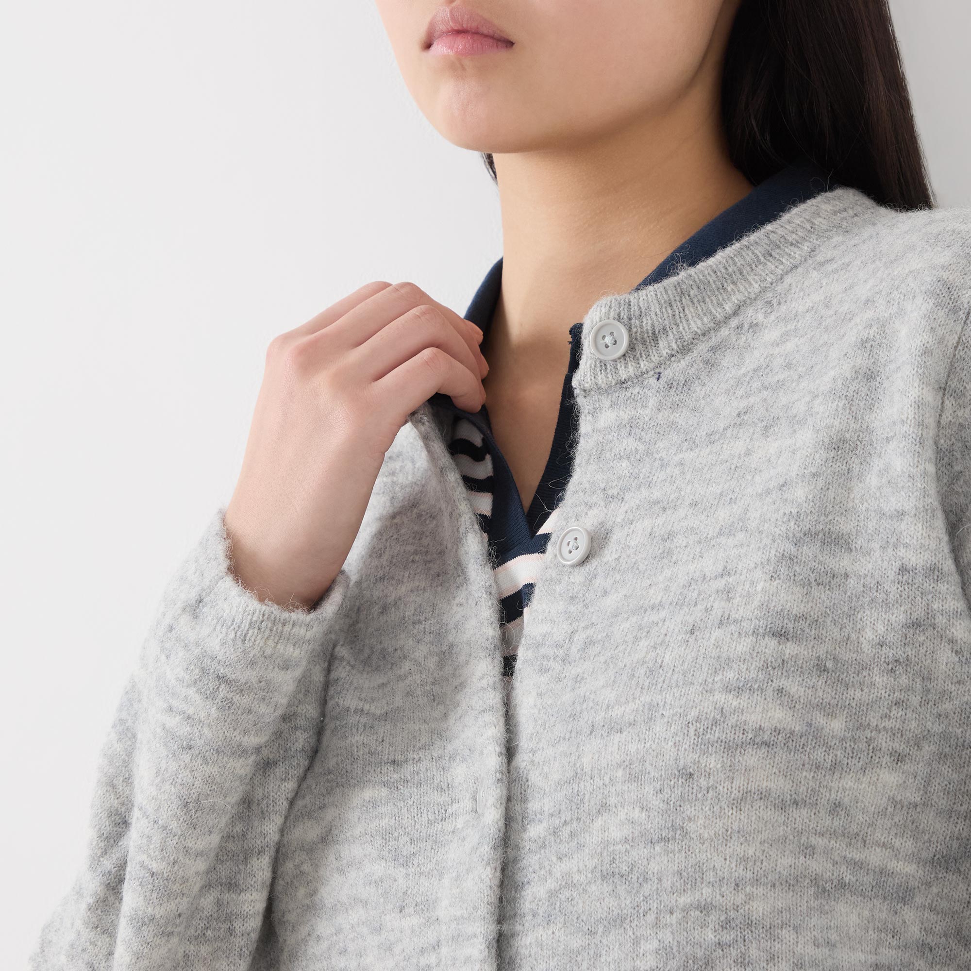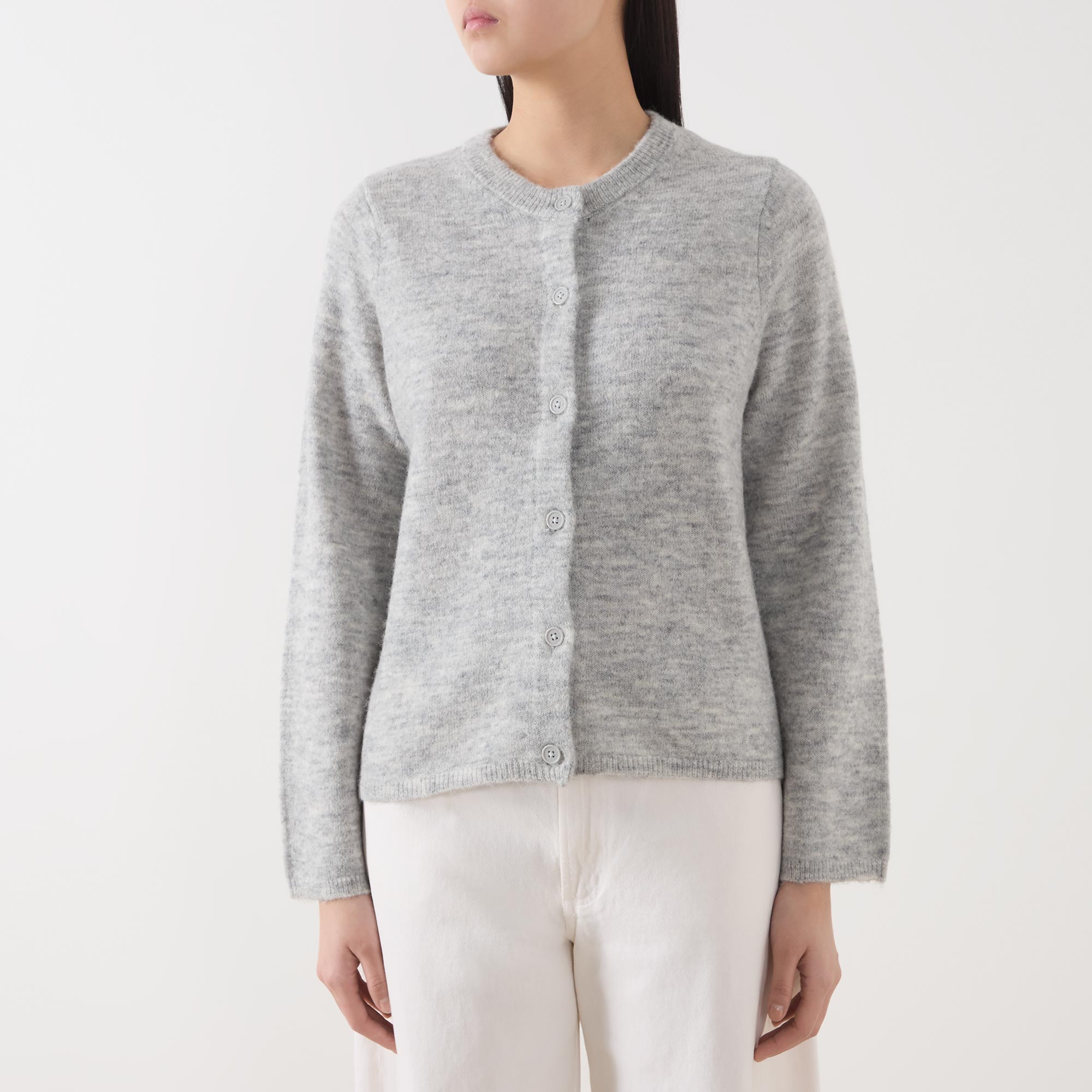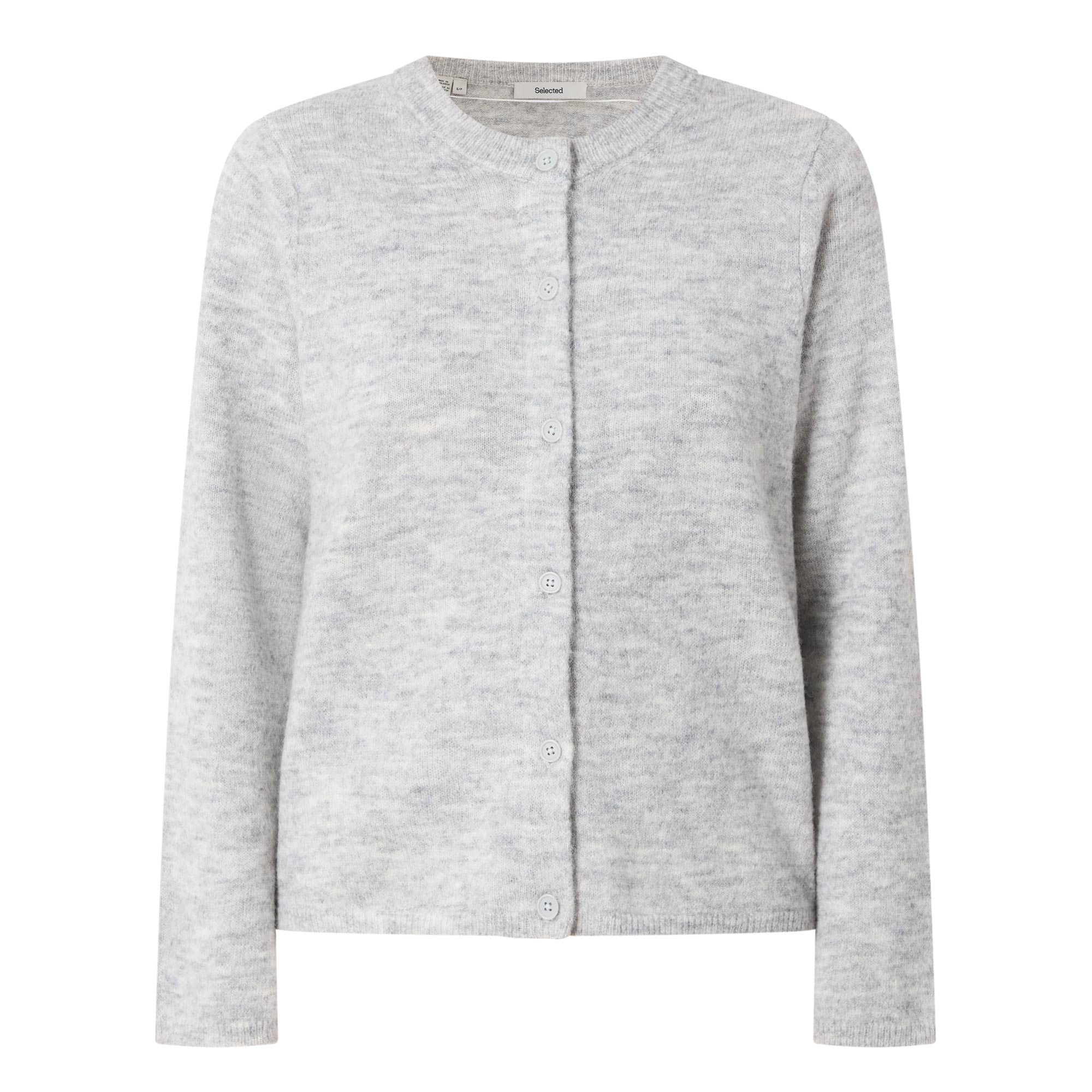 - Crew neck, long sleeves, front button fastening, straight hem, ribbed trims, knit construction, soft finish