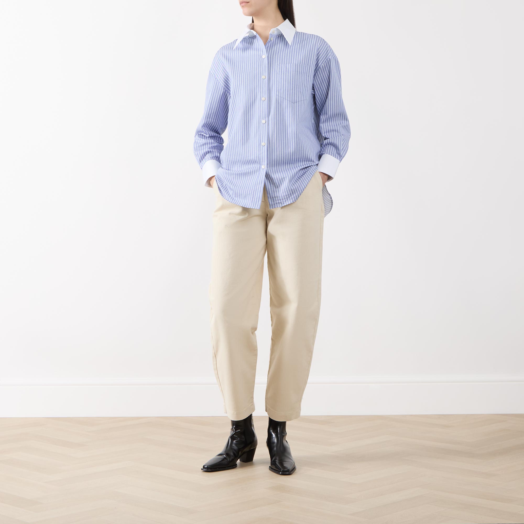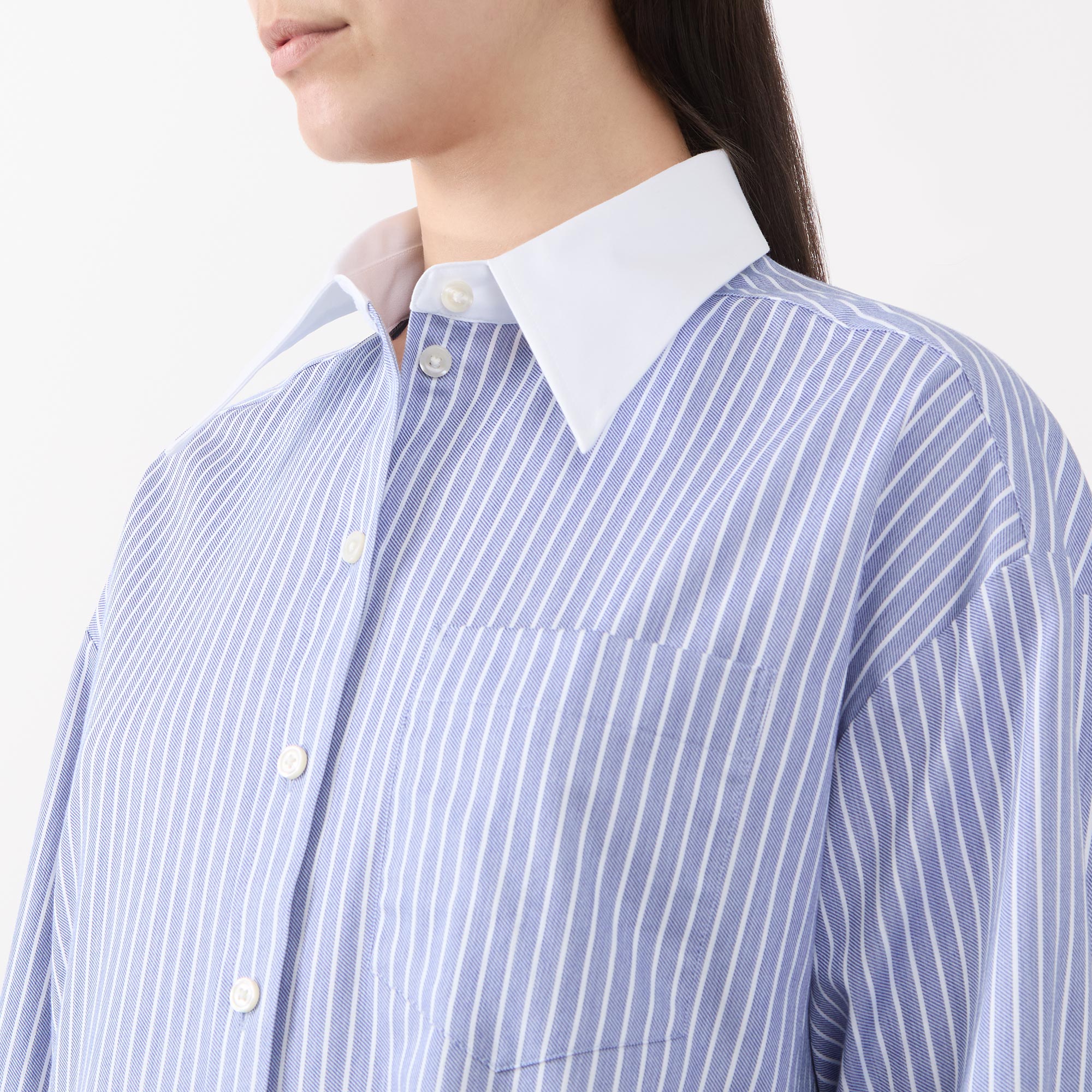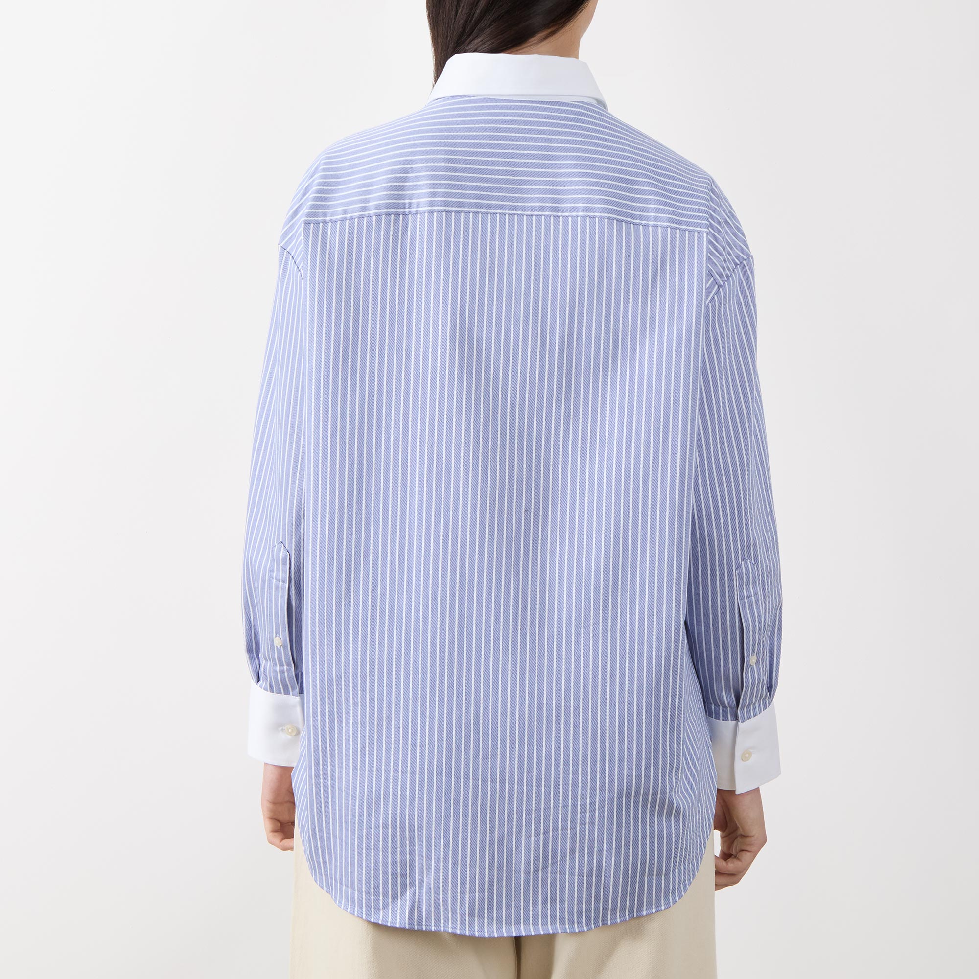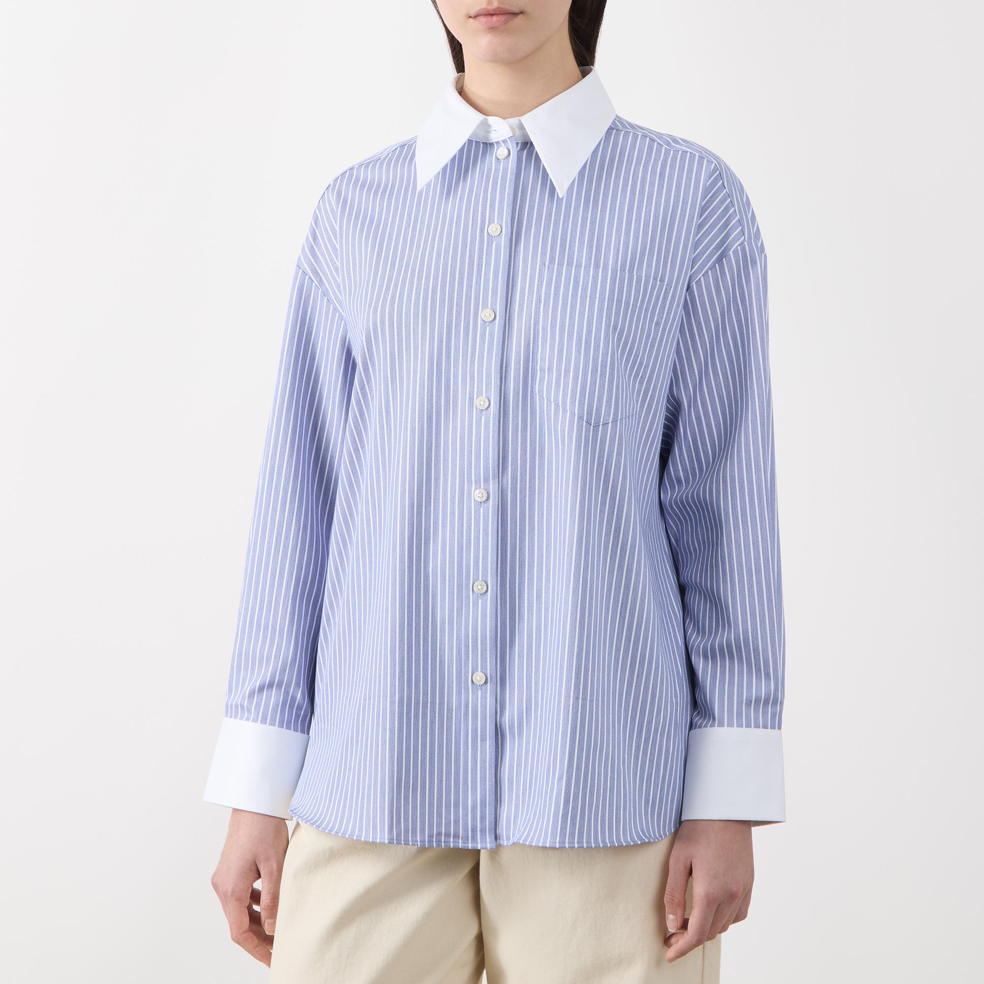 - Contrast shirt collar, contrast cuffs, striped, front button fastenings, dropped shoulders, chest patch pocket