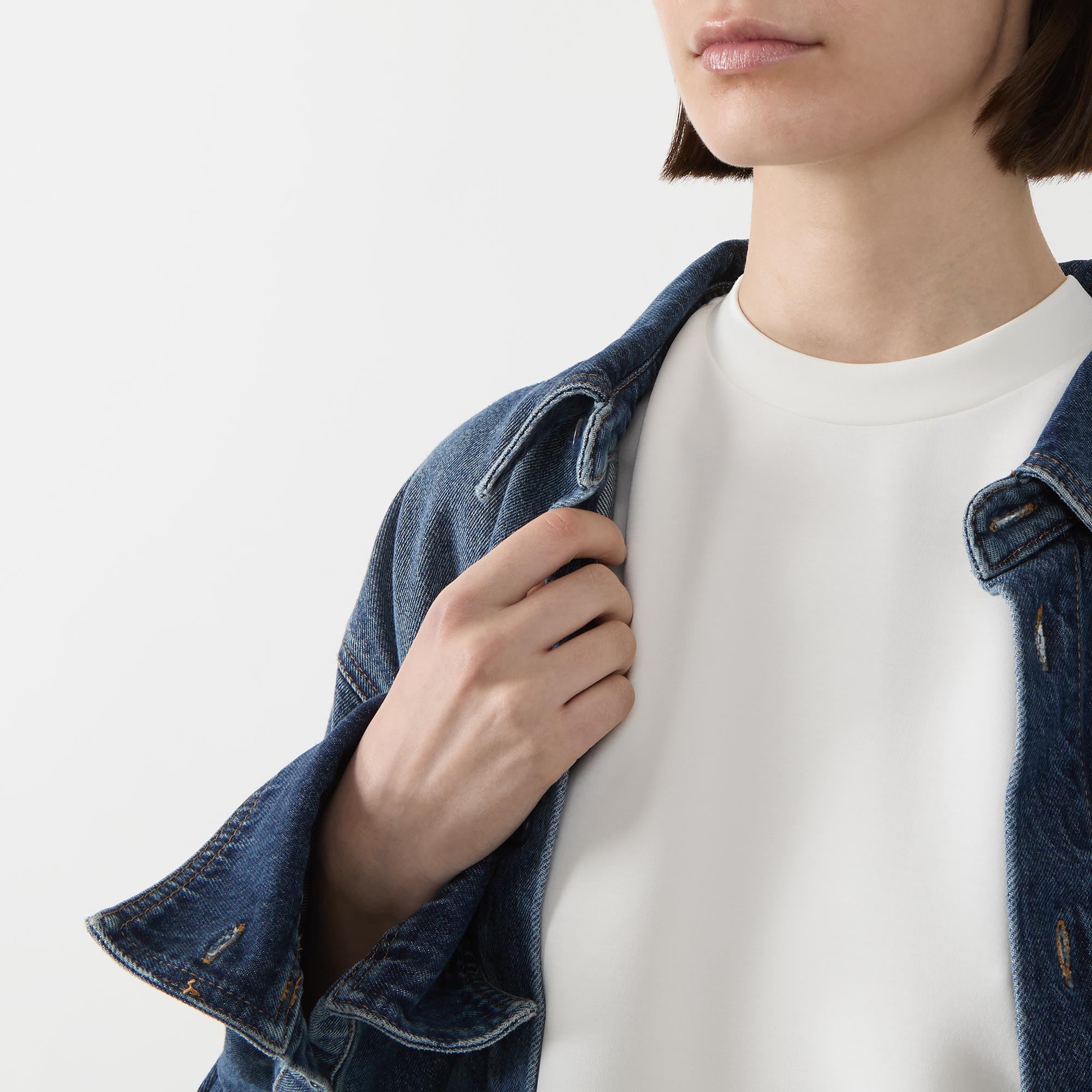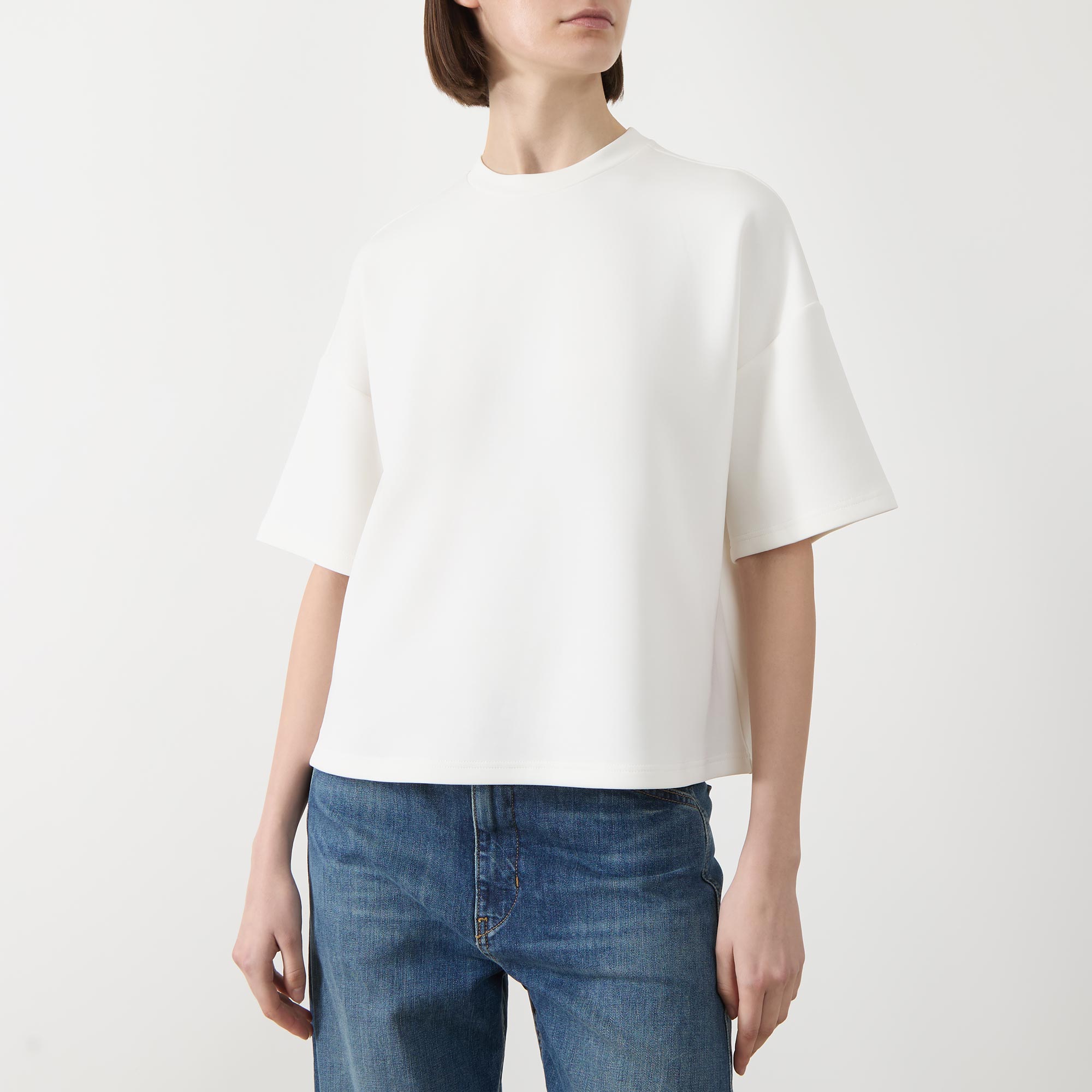 • Round neckline, short sleeves, dropped shoulders, straight hemline, solid style