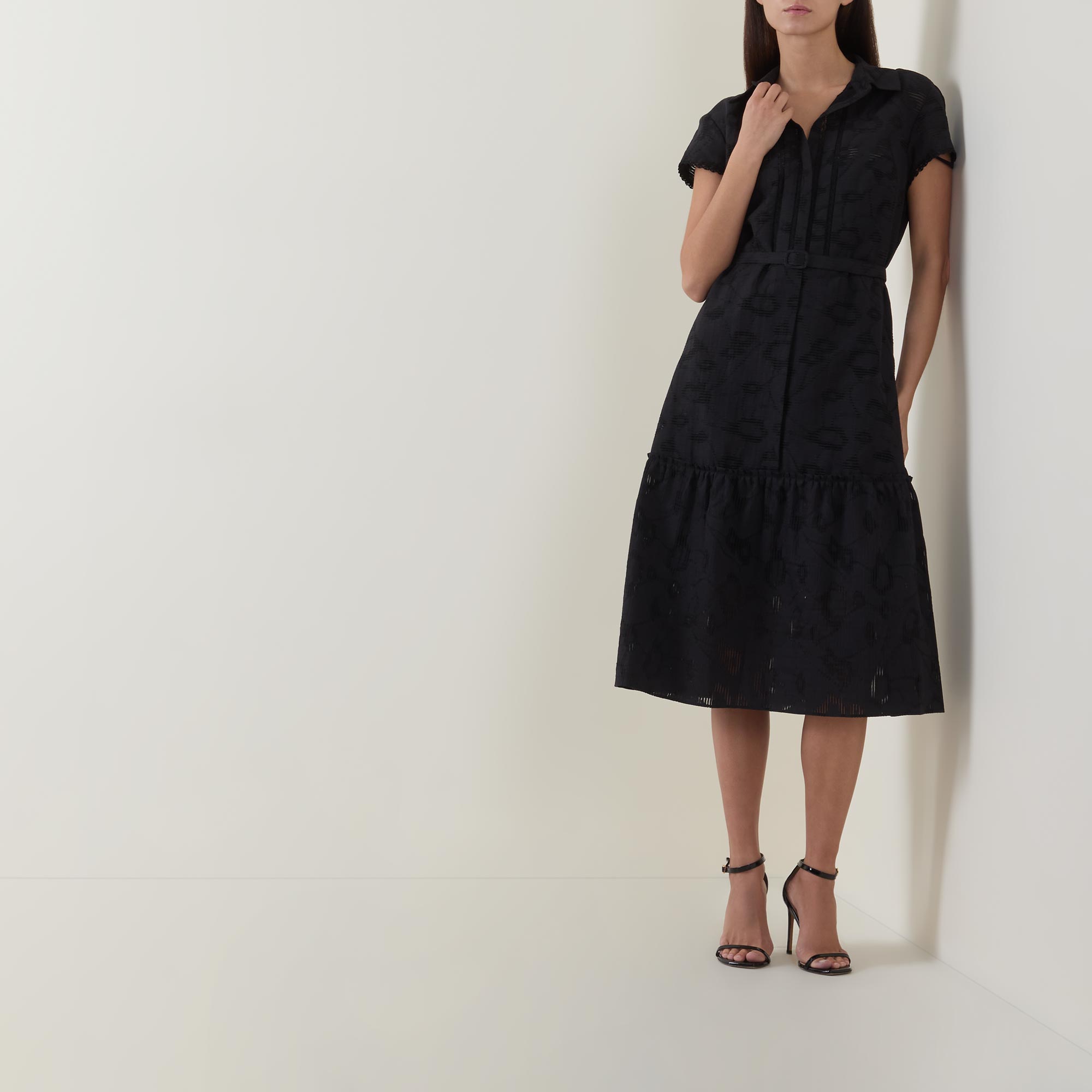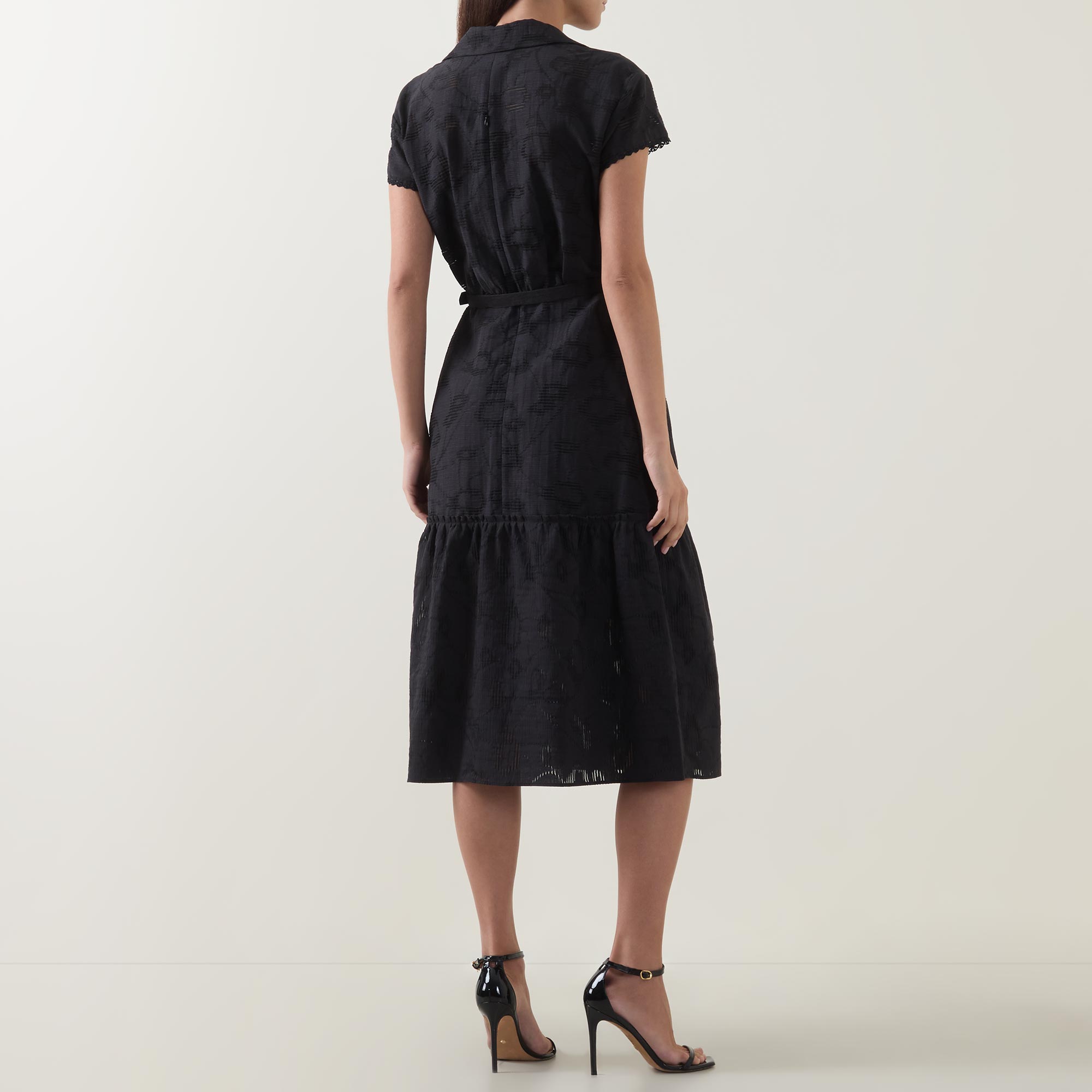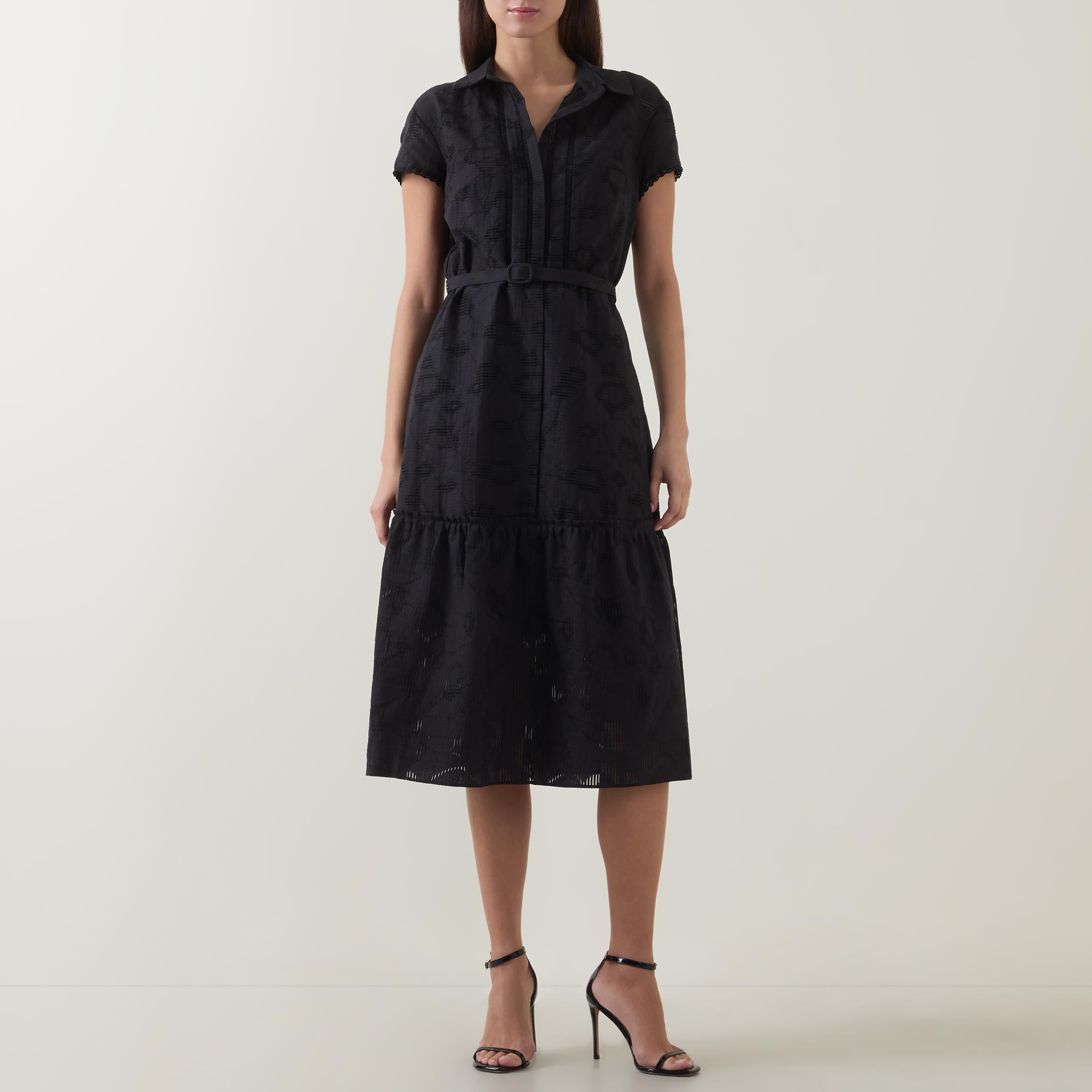 - Shirt collar, cap sleeves, scallop trim detailing, concealed front fastening, matching belt, tiered skirt, straight hem, lace design, lined, midi length