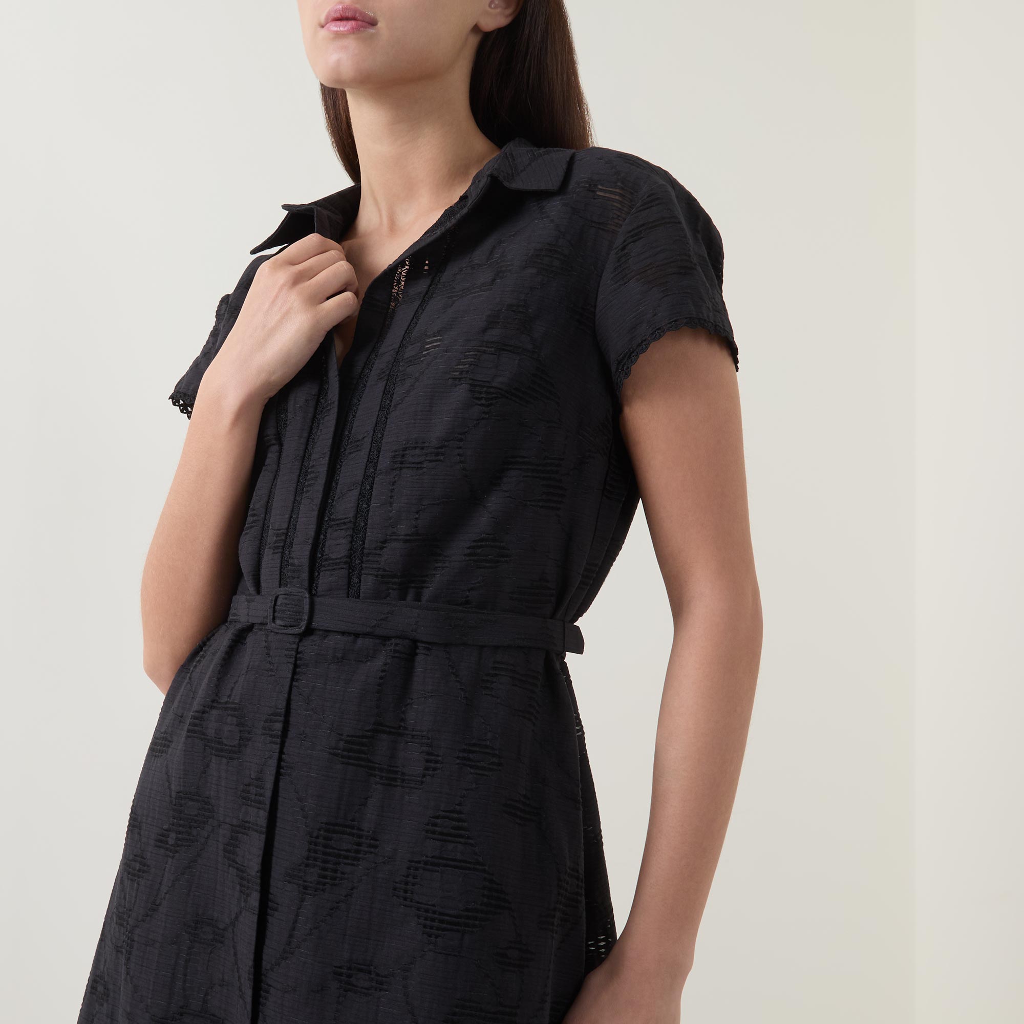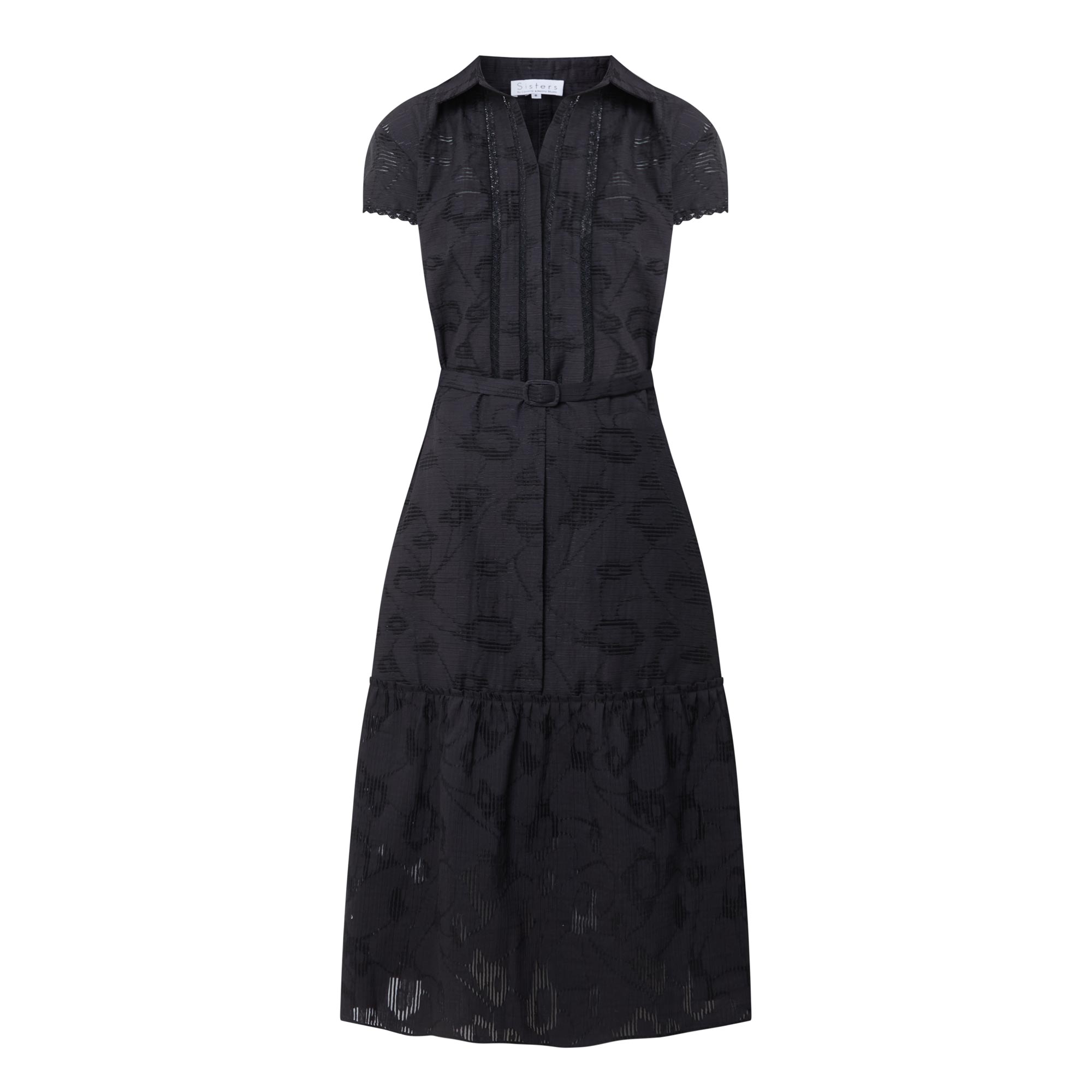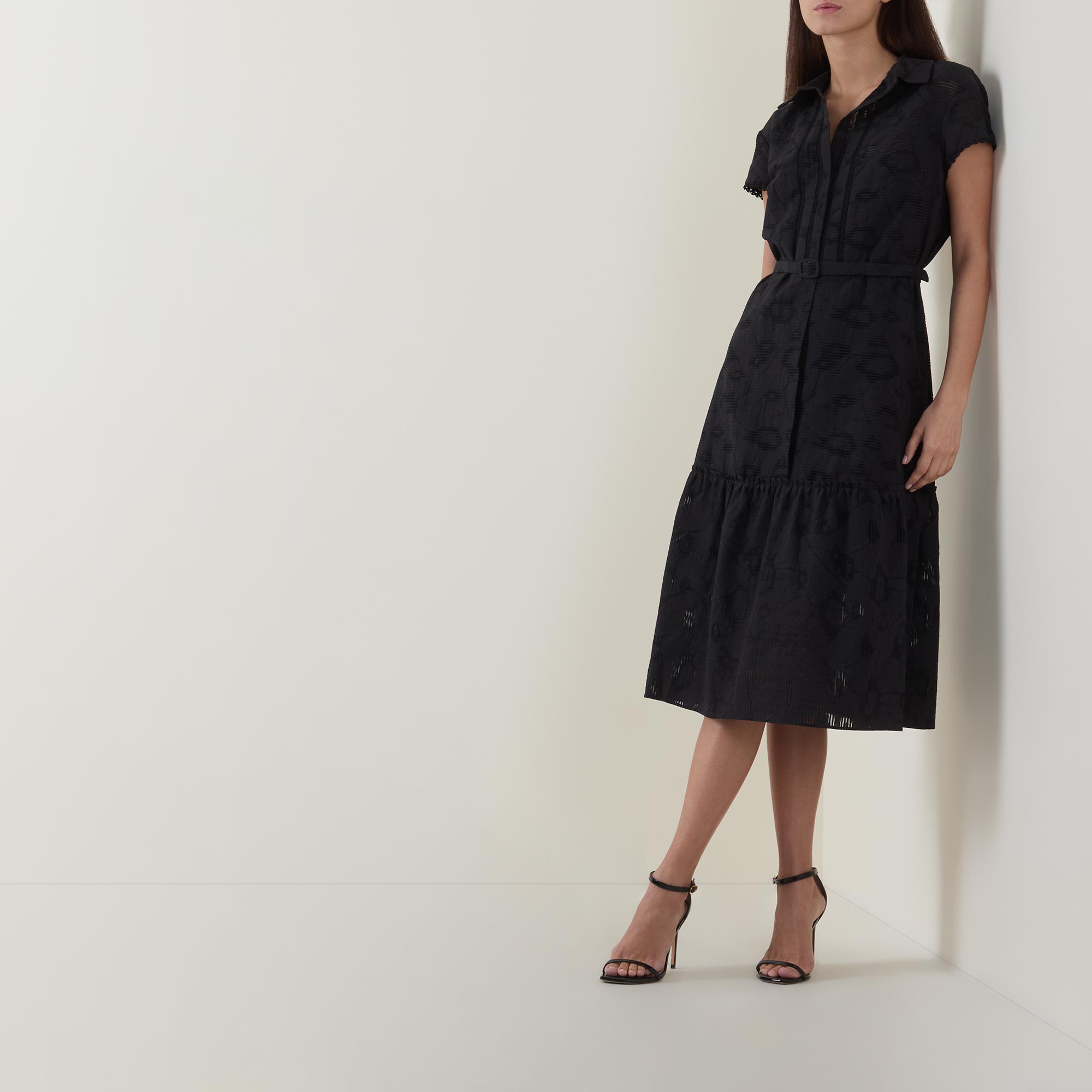 - Shirt collar, cap sleeves, scallop trim detailing, concealed front fastening, matching belt, tiered skirt, straight hem, lace design, lined, midi length
