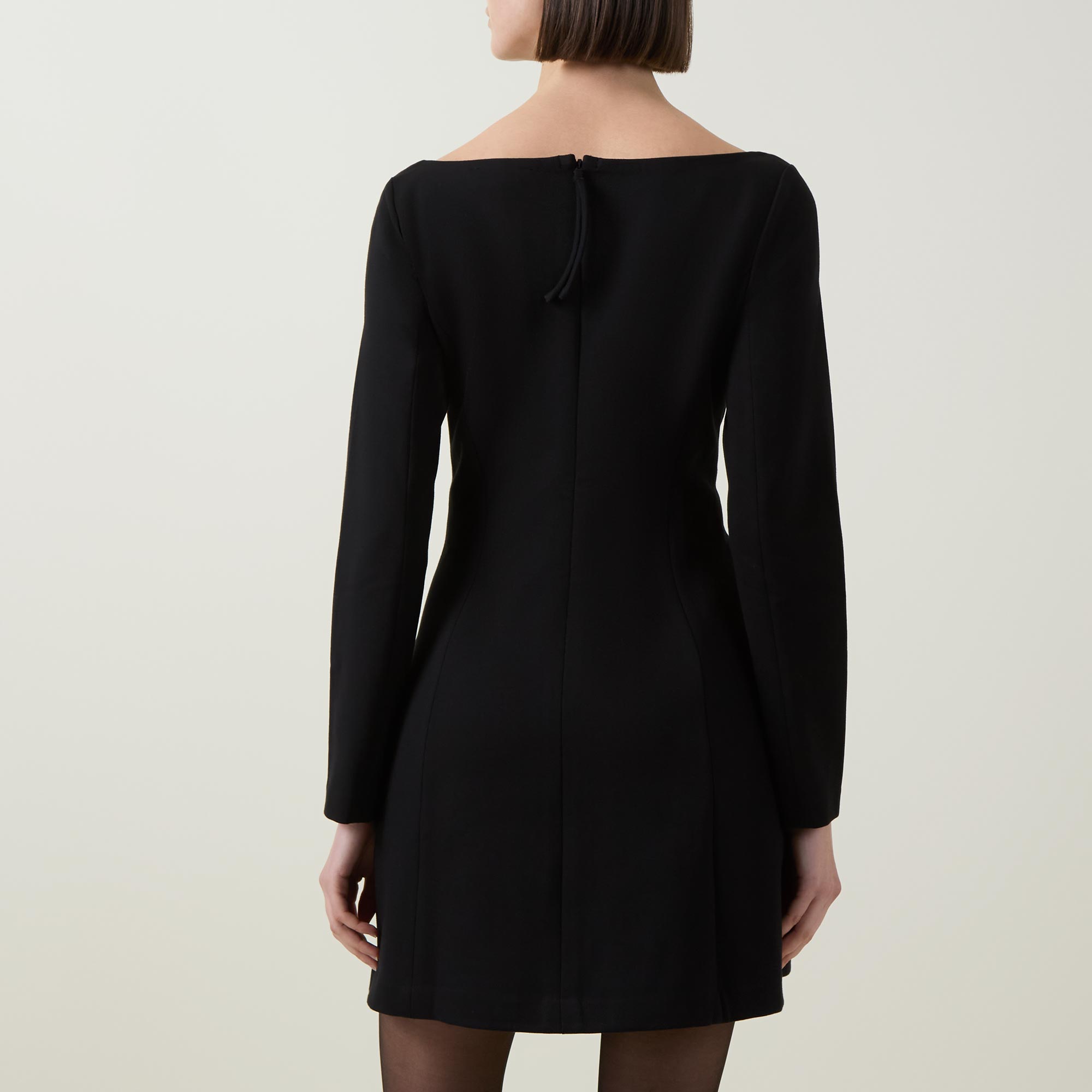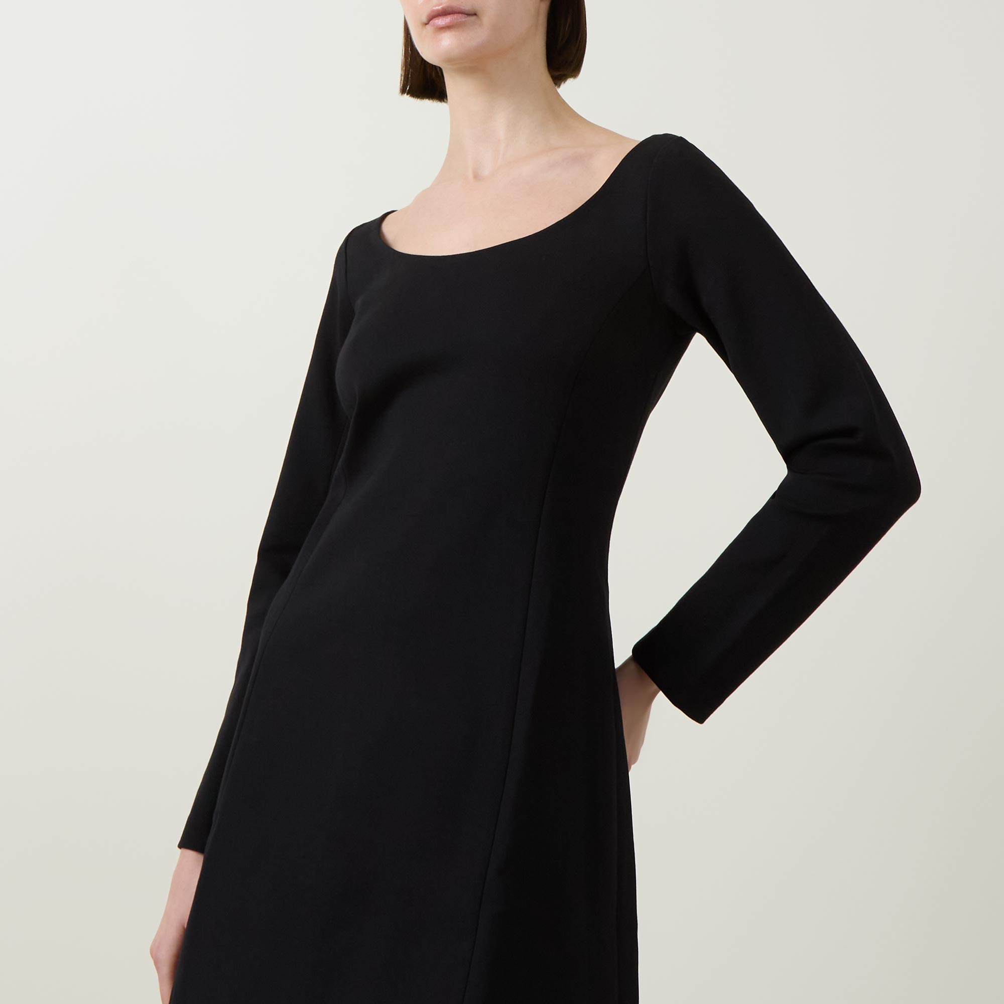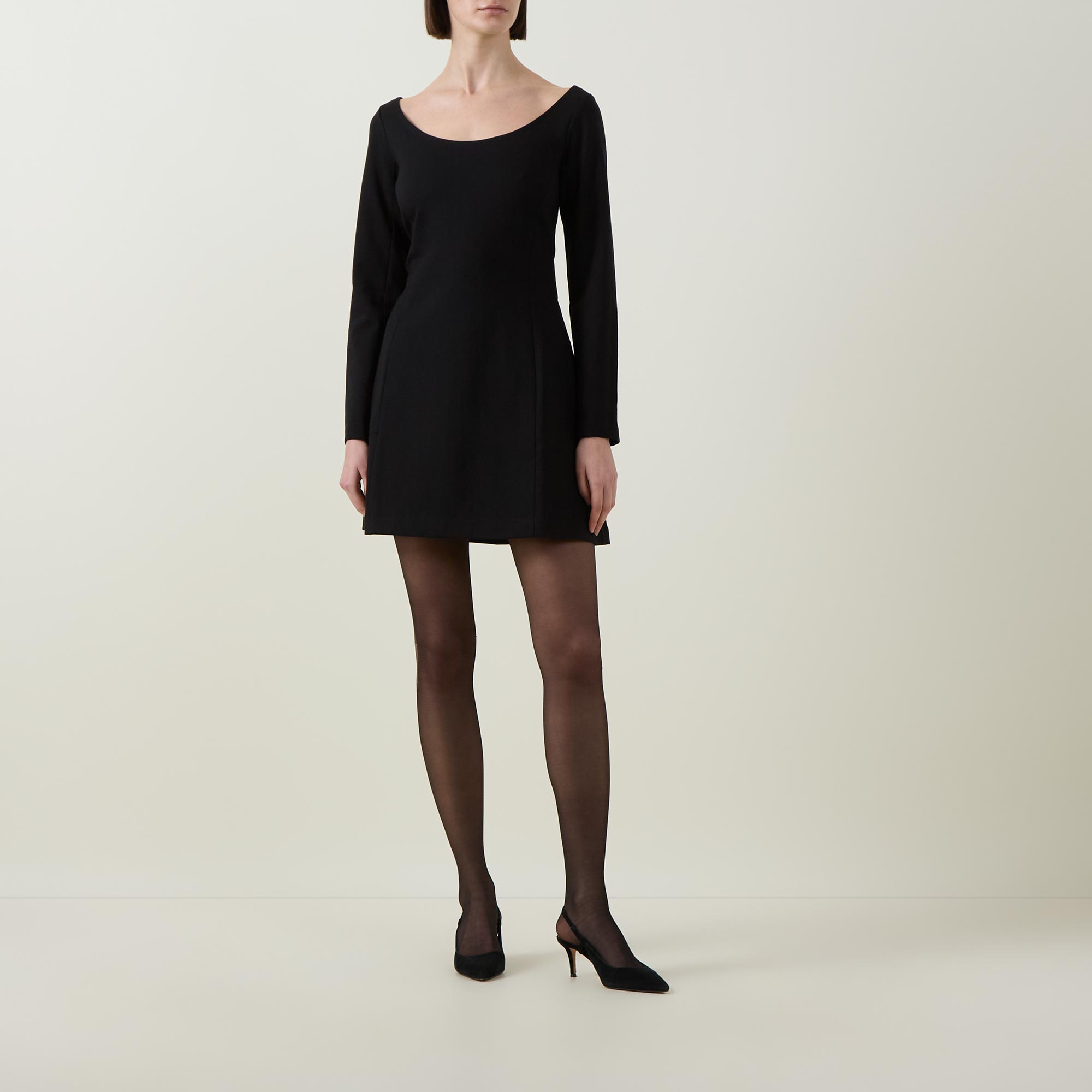 - Ballet neckline, long sleeves, fitted through the waist, flared skirt, A-line silhouette, mini length, smooth finish