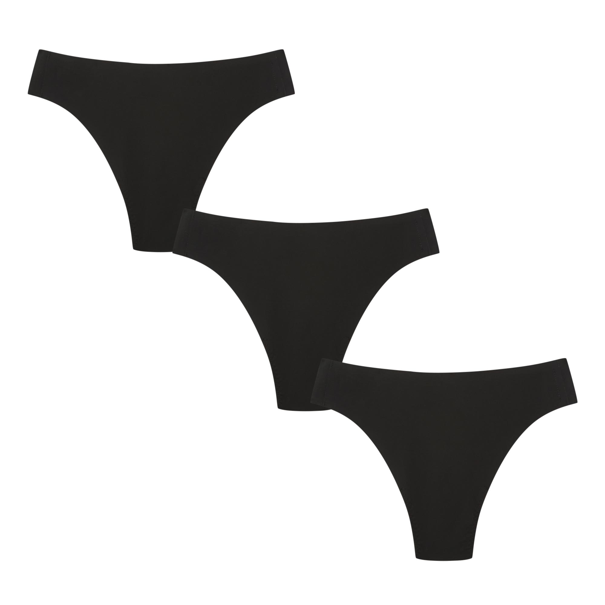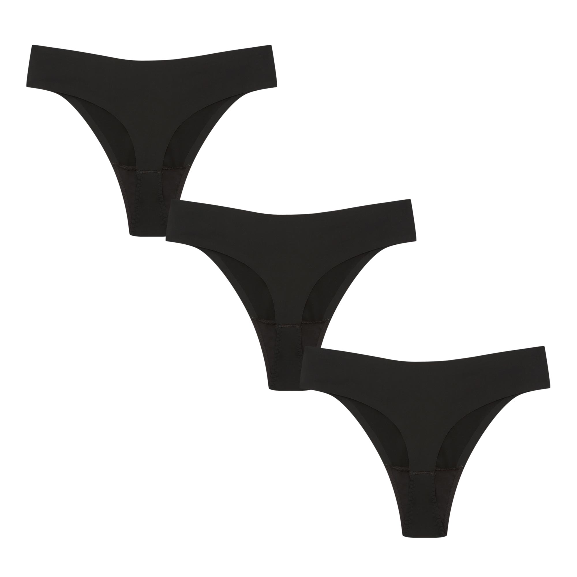 - Breathable, stretch-fused fabric, non-shaping, soft feel, elastic-free, no visible lines, quick-drying, cotton gusset, medium coverage front, thong back, three-pack set