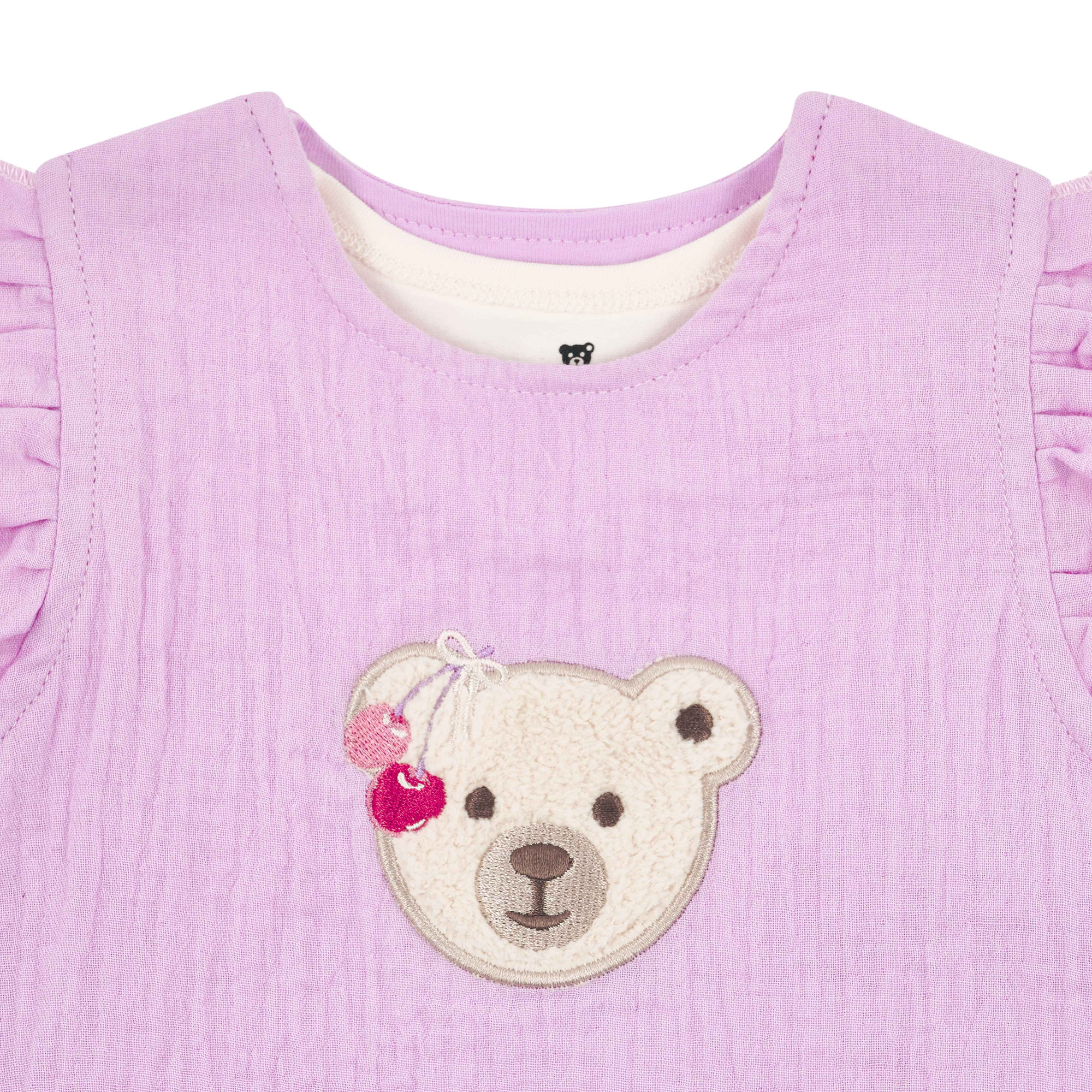 - Bear logo with cherry detail, round neck, sleeveless, ruffle trim to armholes, snap fasteners, elasticated leg cuffs