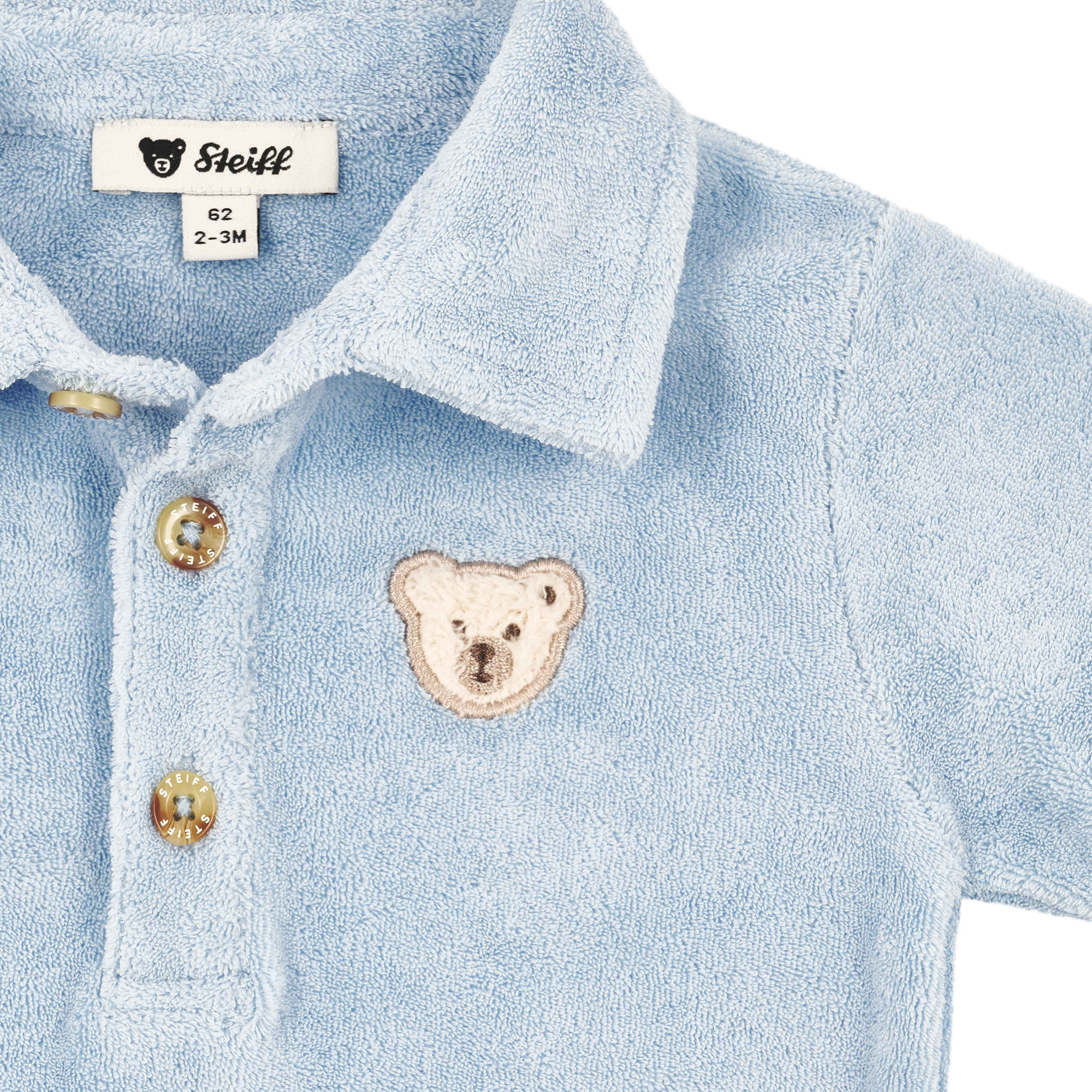- Terrycloth fabrication, polo collar with button placket, snap fasteners, short sleeves, bear logo motif