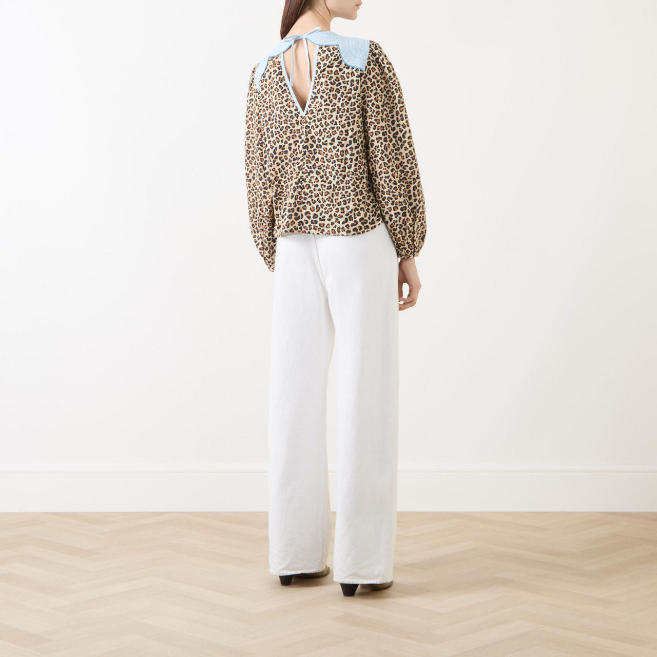 - Long billow sleeves, round neckline, contrasting embroidered panel, back tie-fastening closure with cut-out panel, all-over leopard pattern, smooth fabric