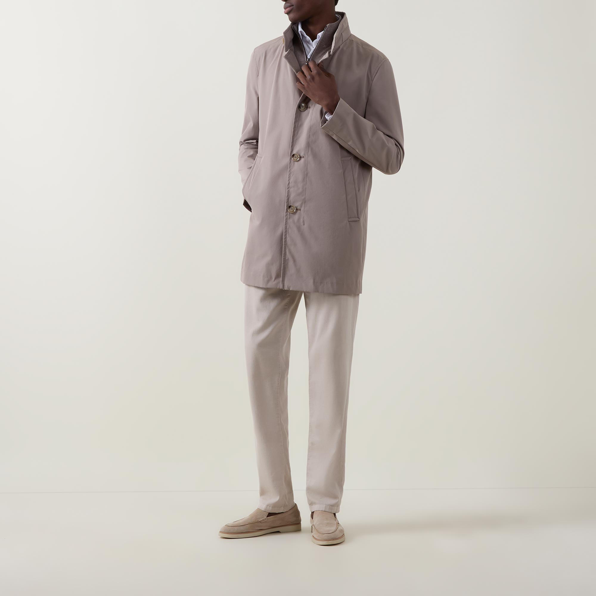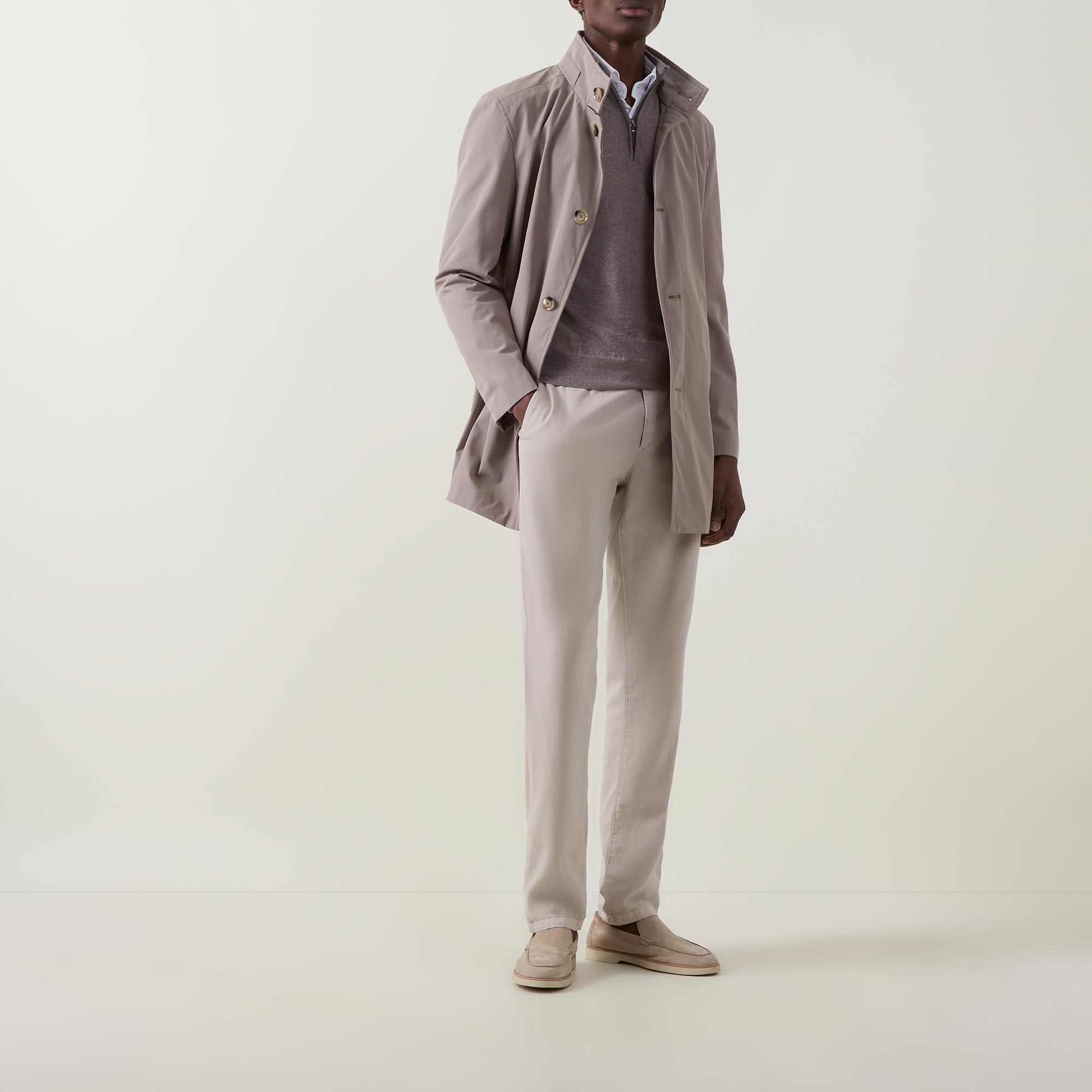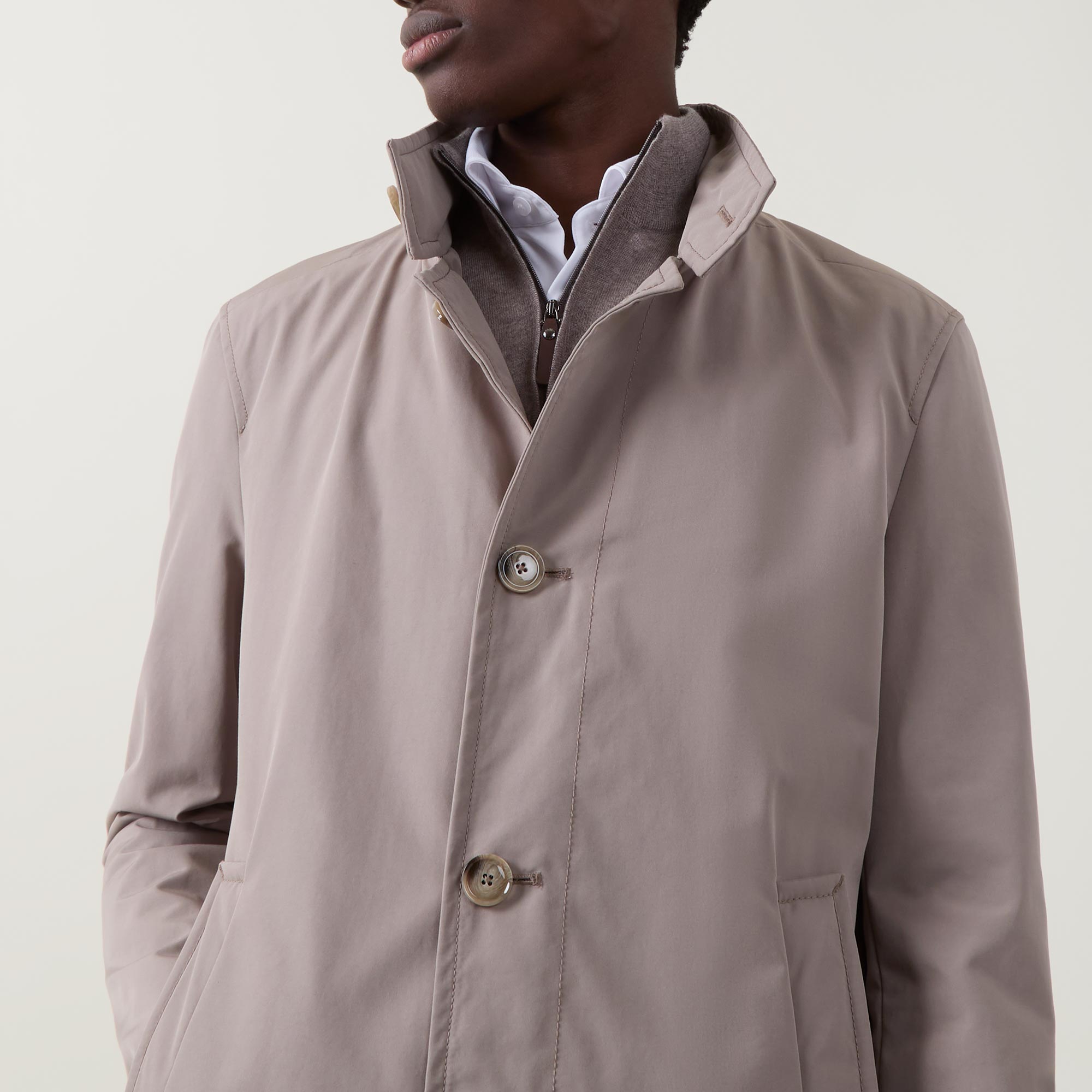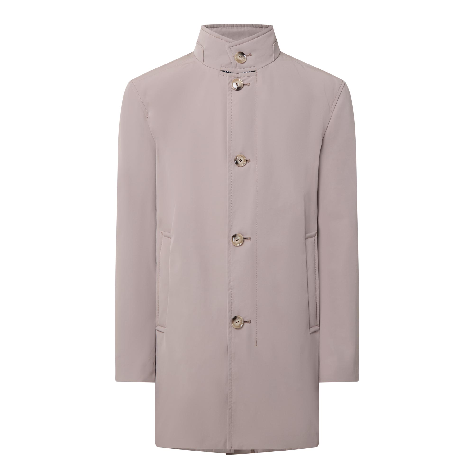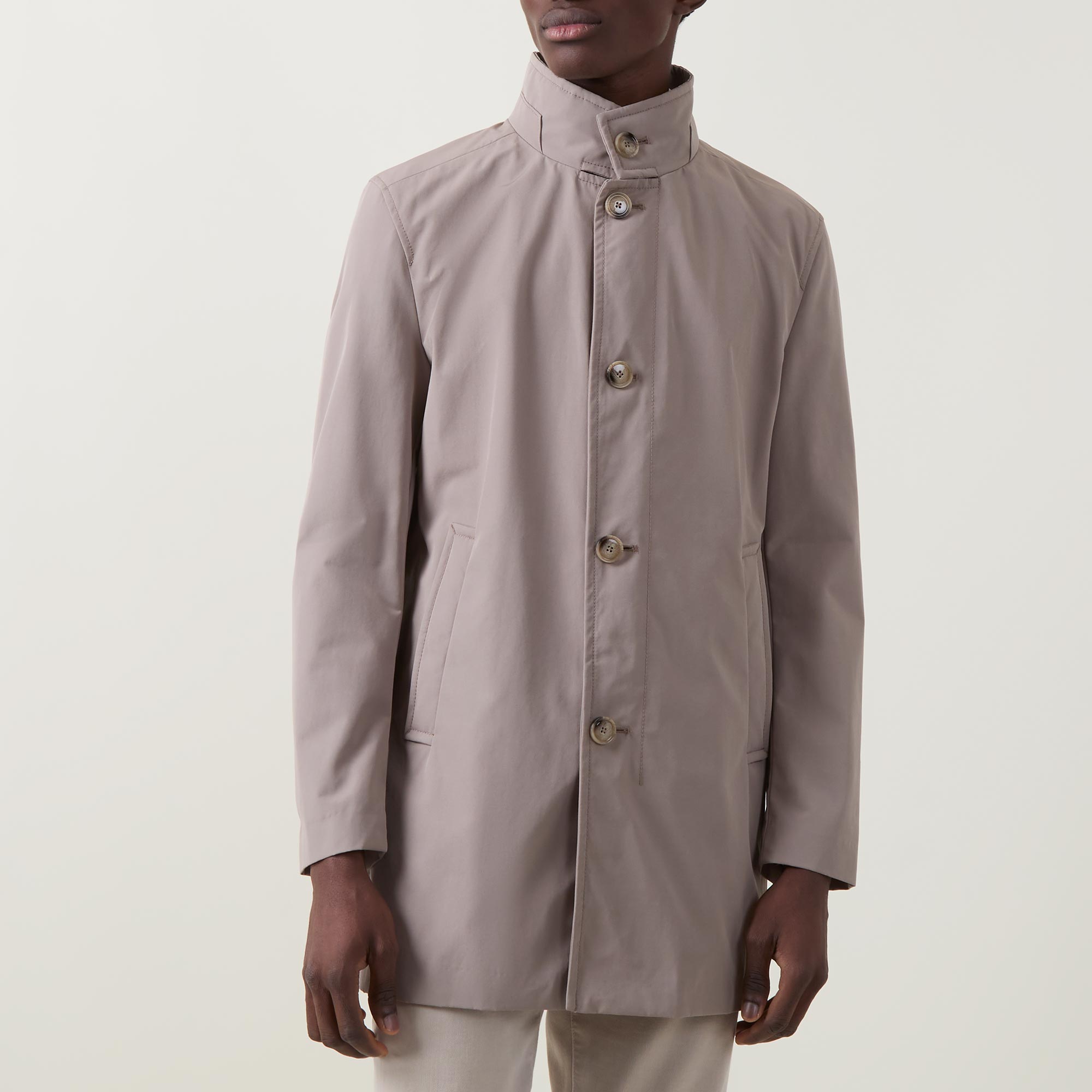 - Stand collar, long sleeves, front button fastening, two vertical welt pockets, straight hem, rear vent, logo detail at the back of the neck, lined, longline design