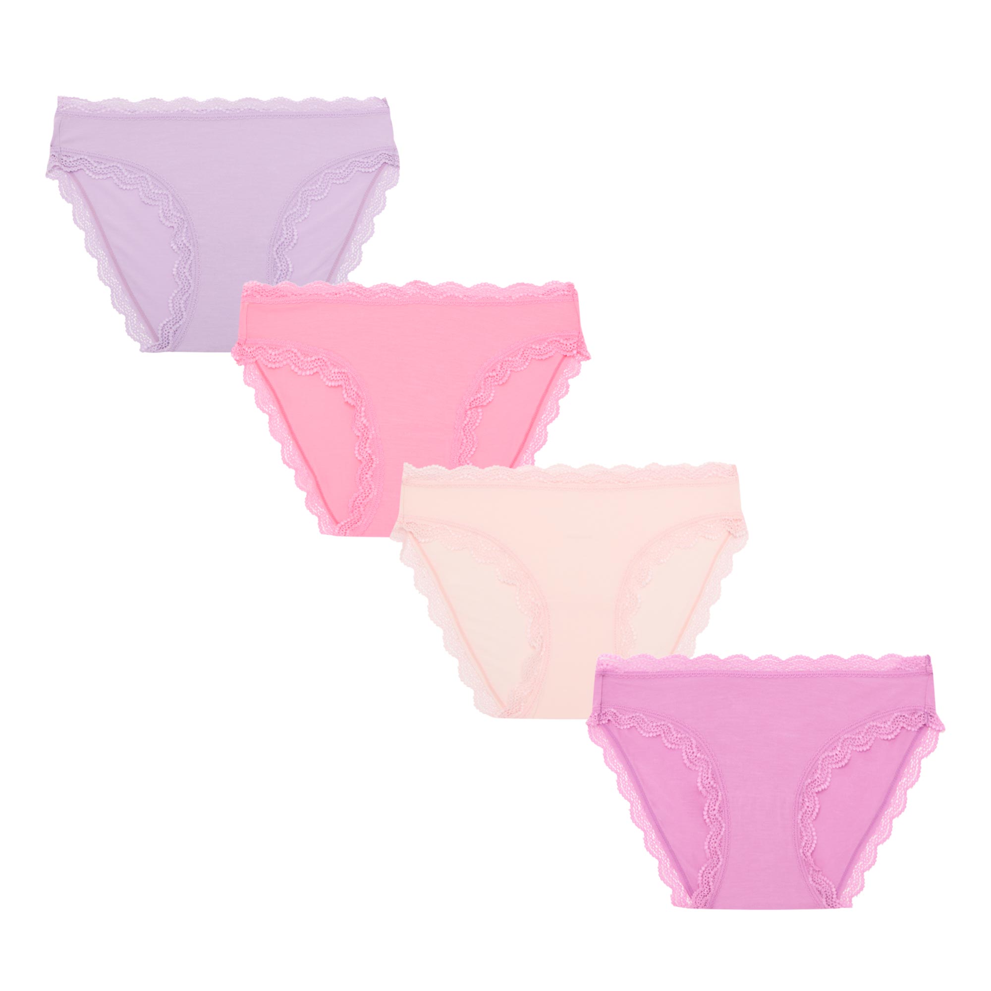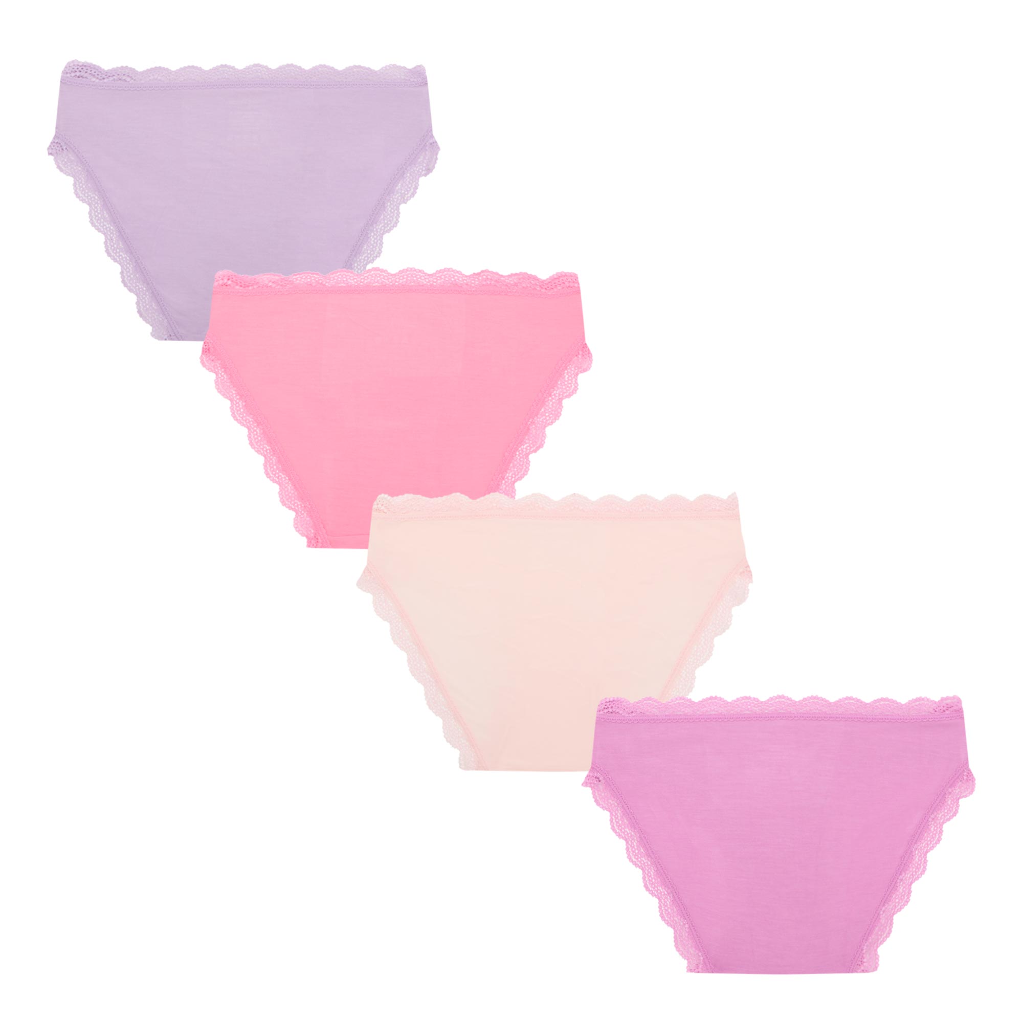 - Pack of four, assorted colours, lace trims, moderate coverage
