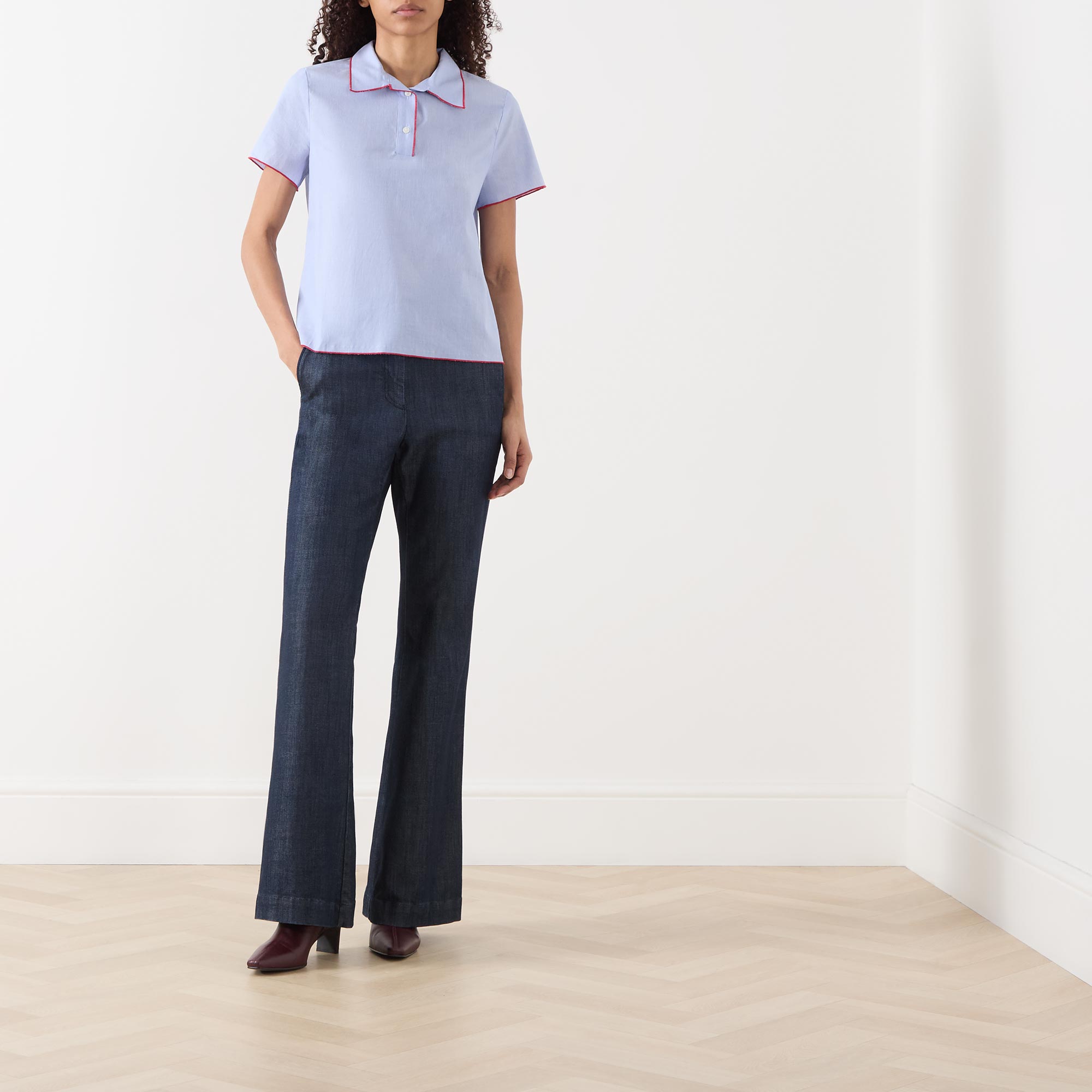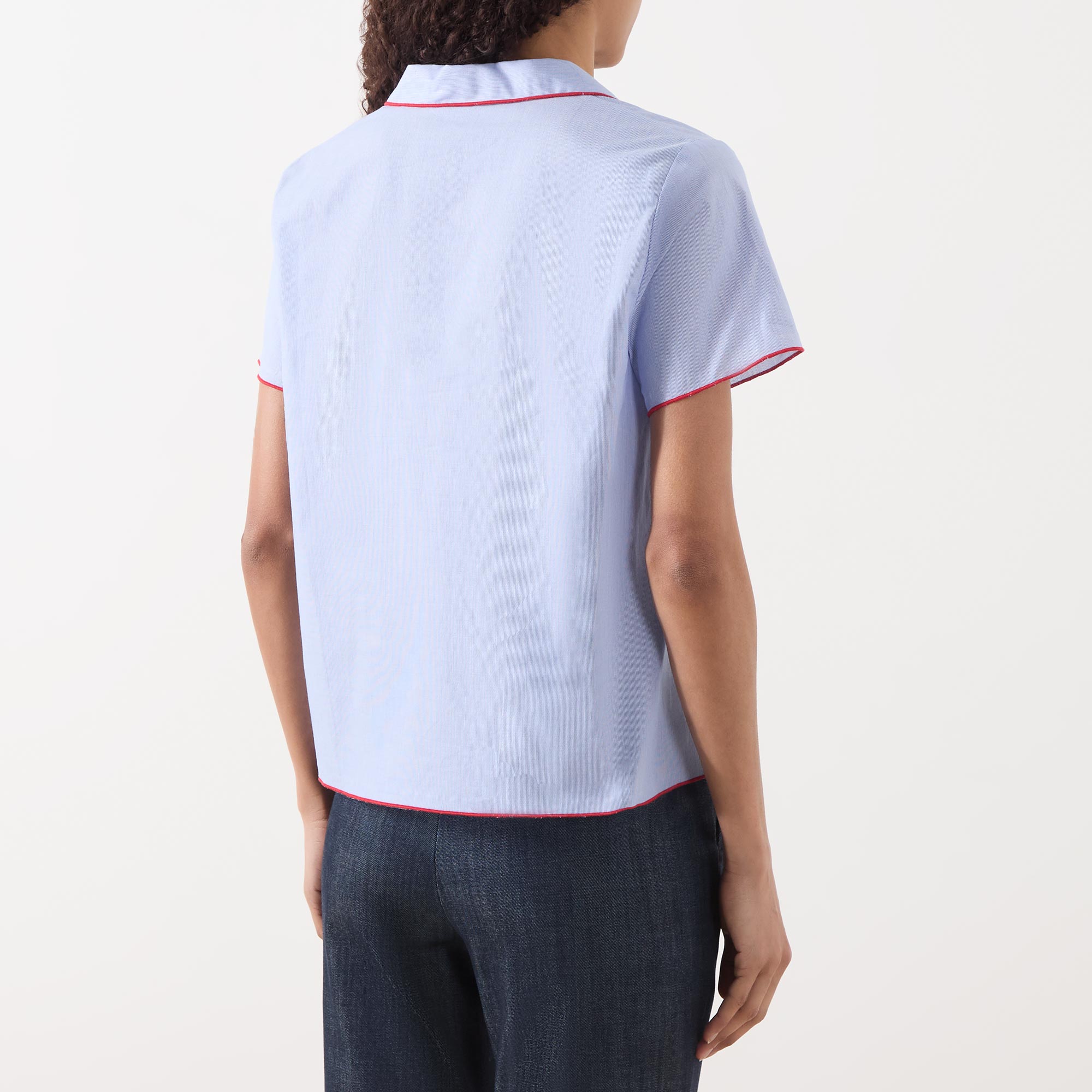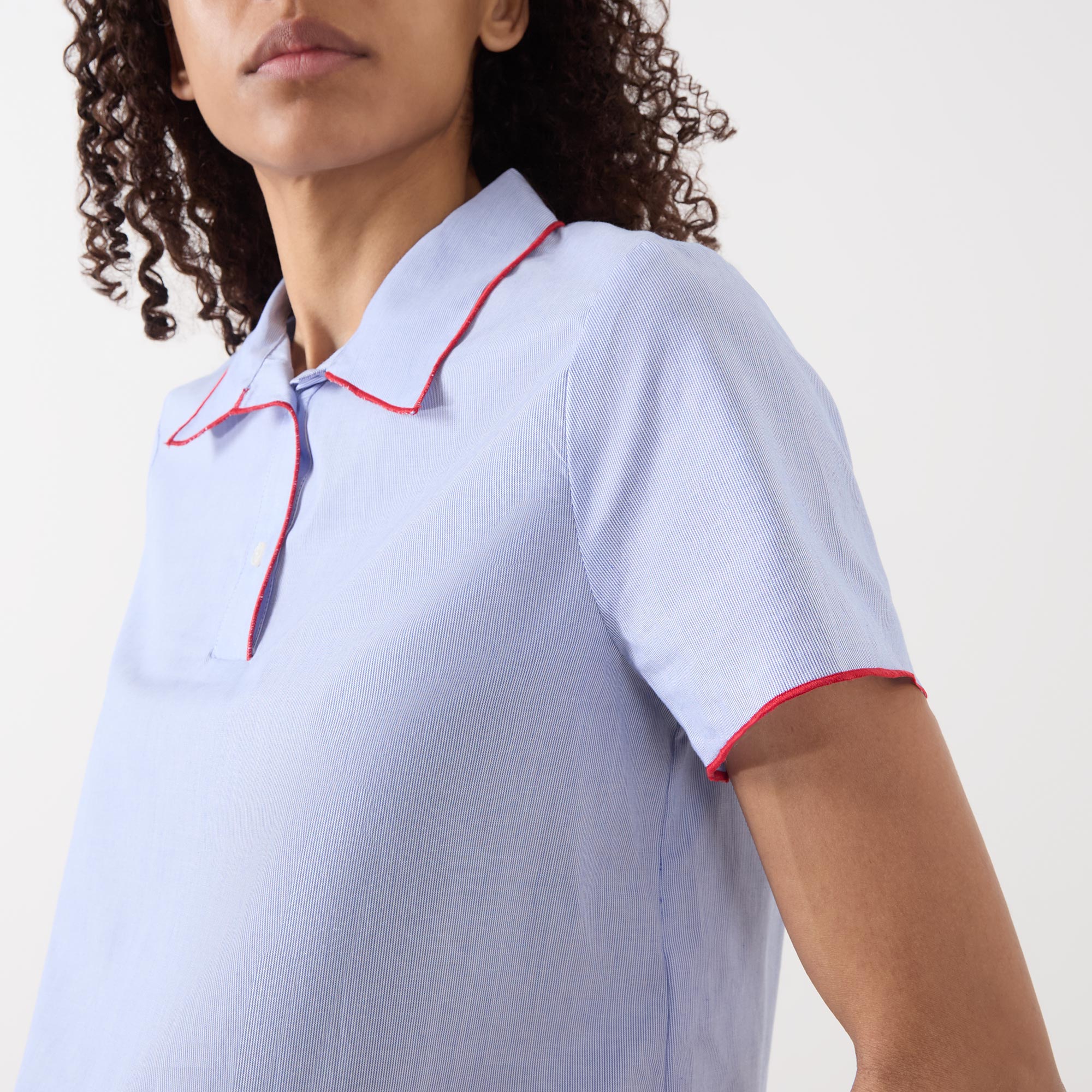 - Short sleeves, contrast trim, pointed collar, button fastenings