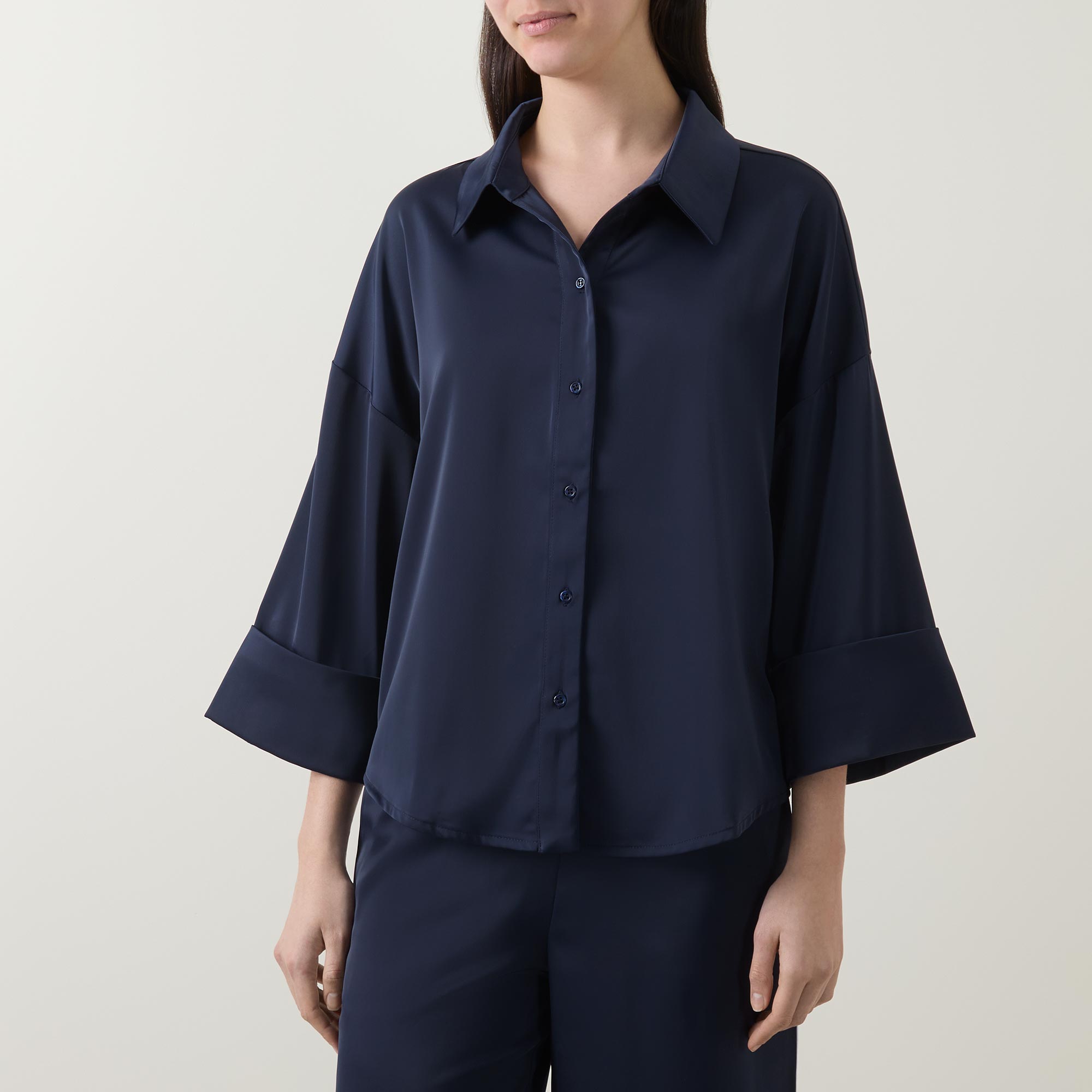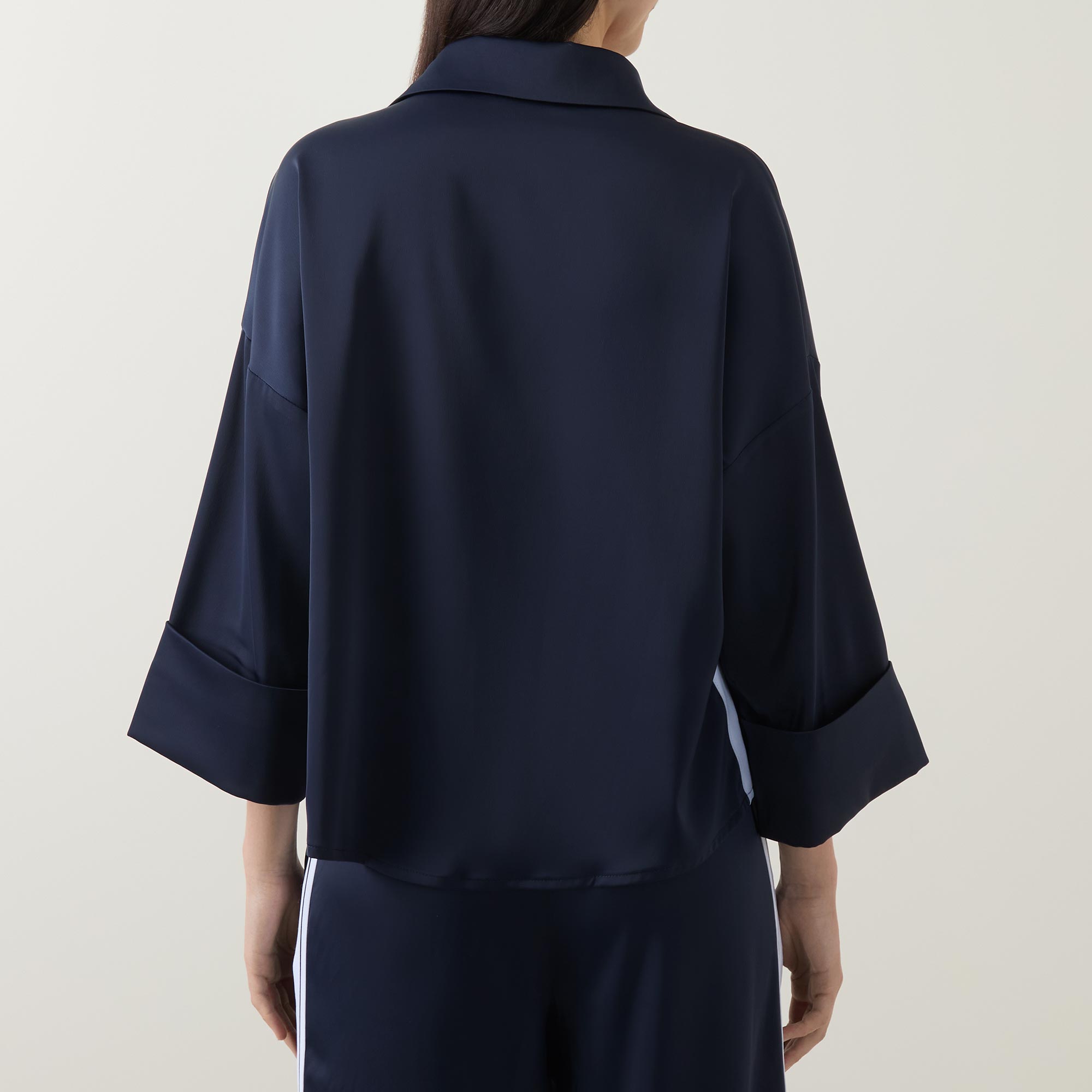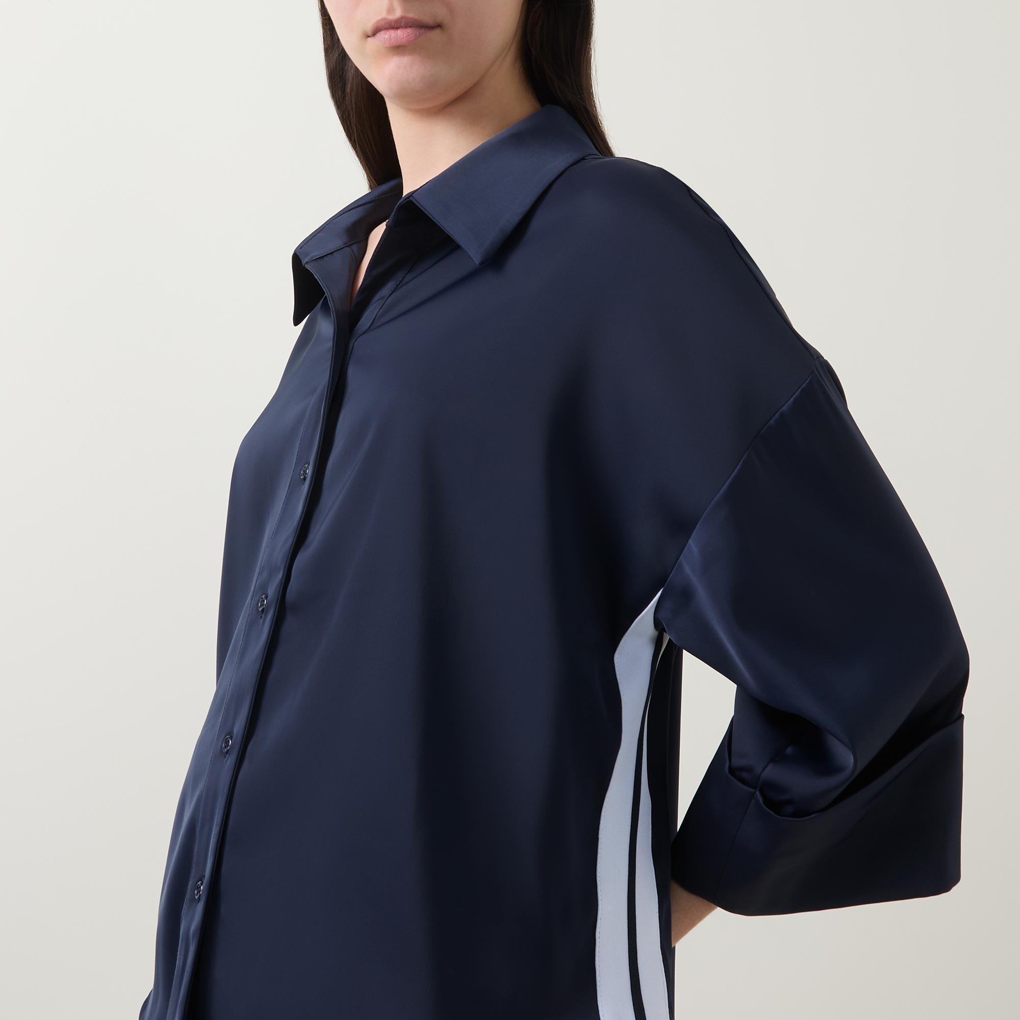 • Point collar, dropped shoulders, wide three quarter length sleeves, front button placket, contrast stripe detailing along the sides, curved hem, tonal stitching, sateen finish
