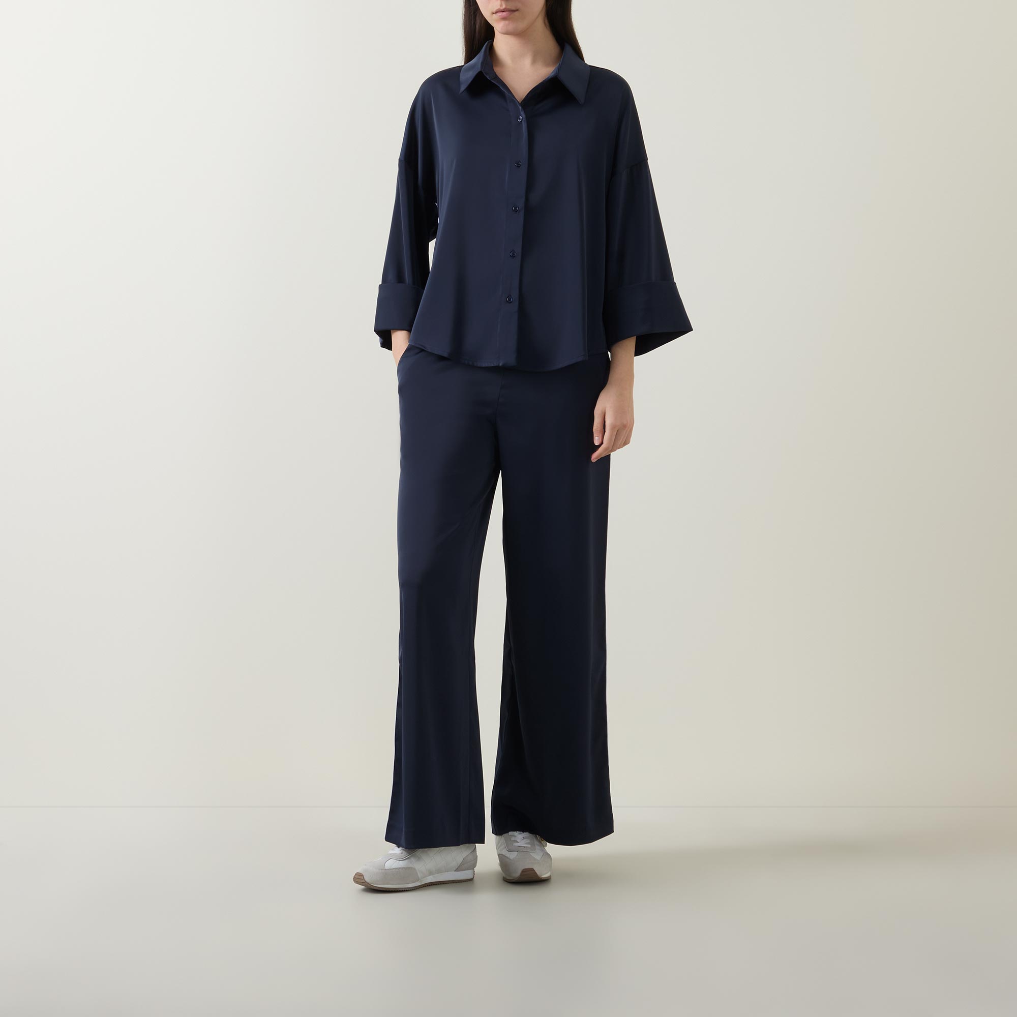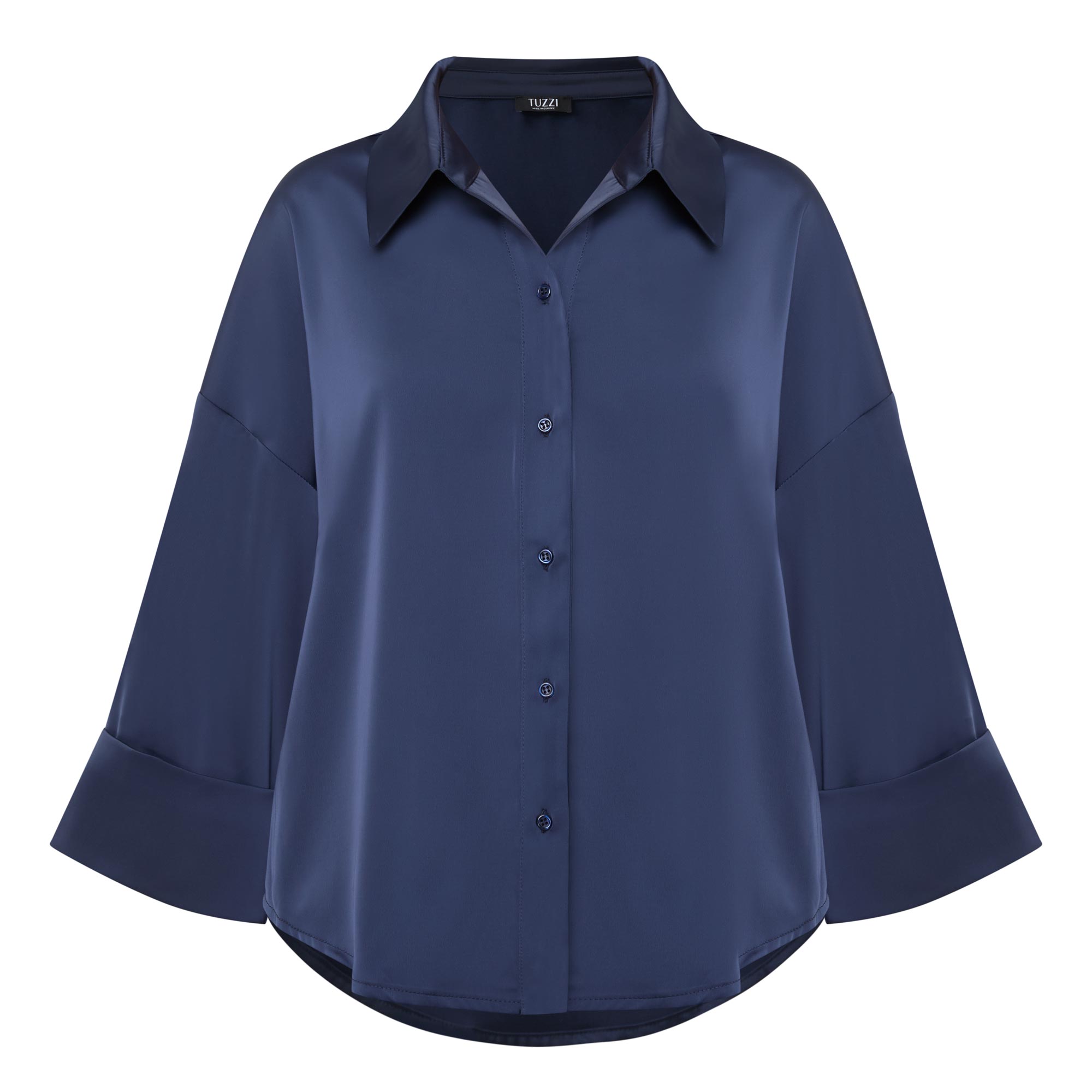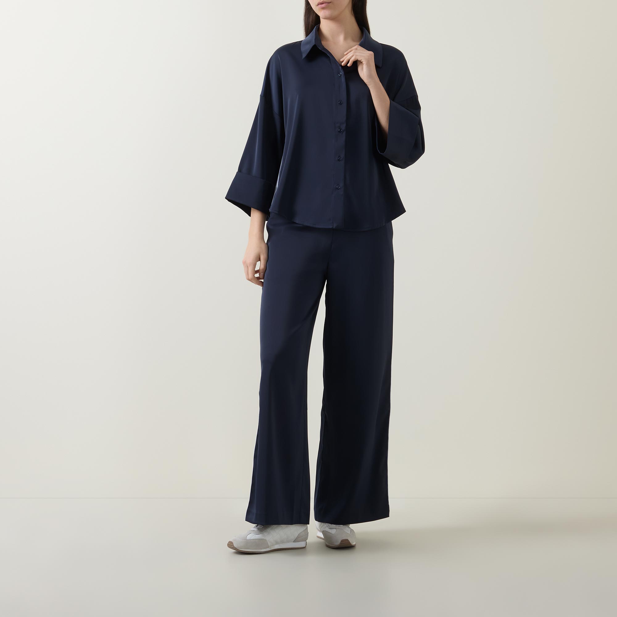 • Point collar, dropped shoulders, wide three quarter length sleeves, front button placket, contrast stripe detailing along the sides, curved hem, tonal stitching, sateen finish