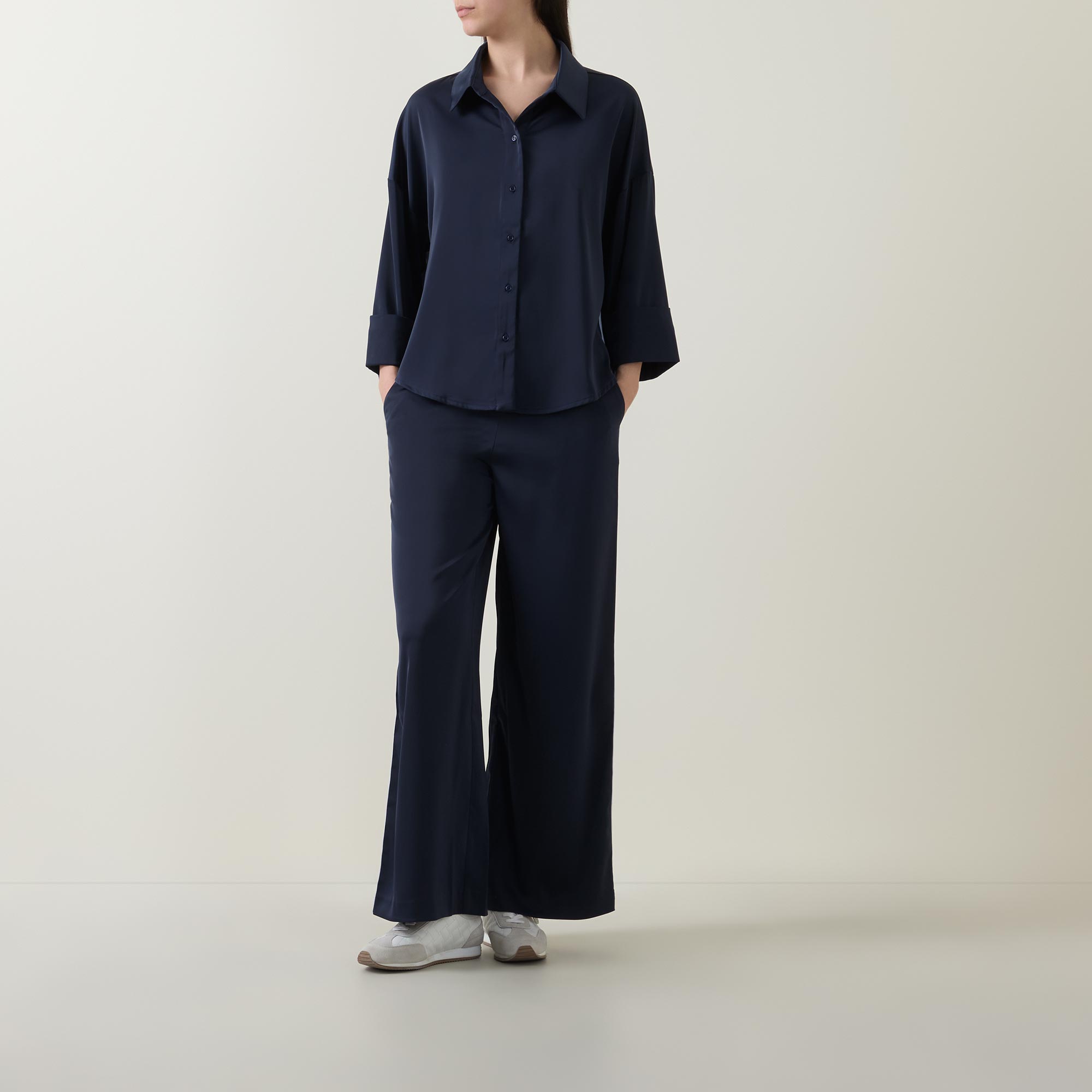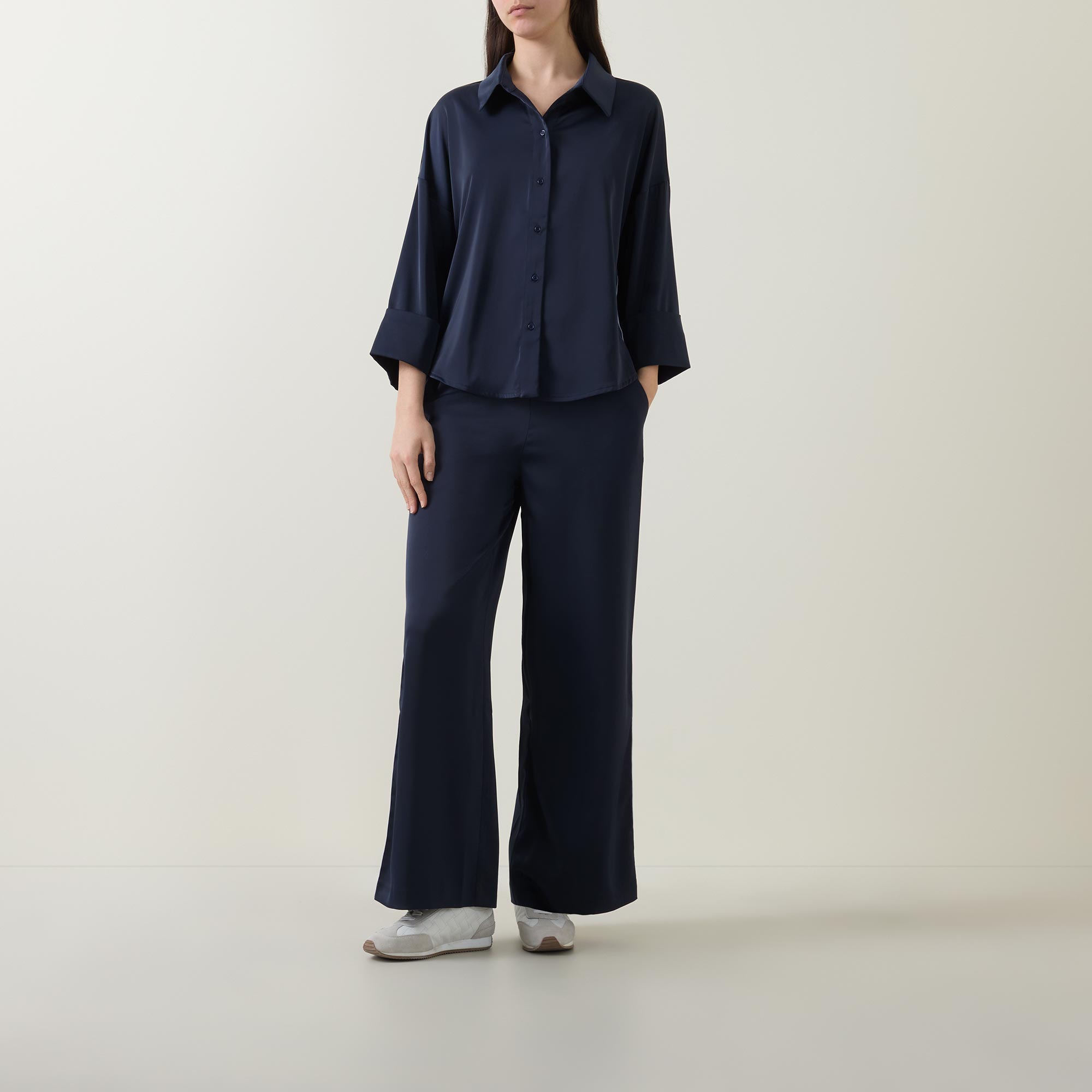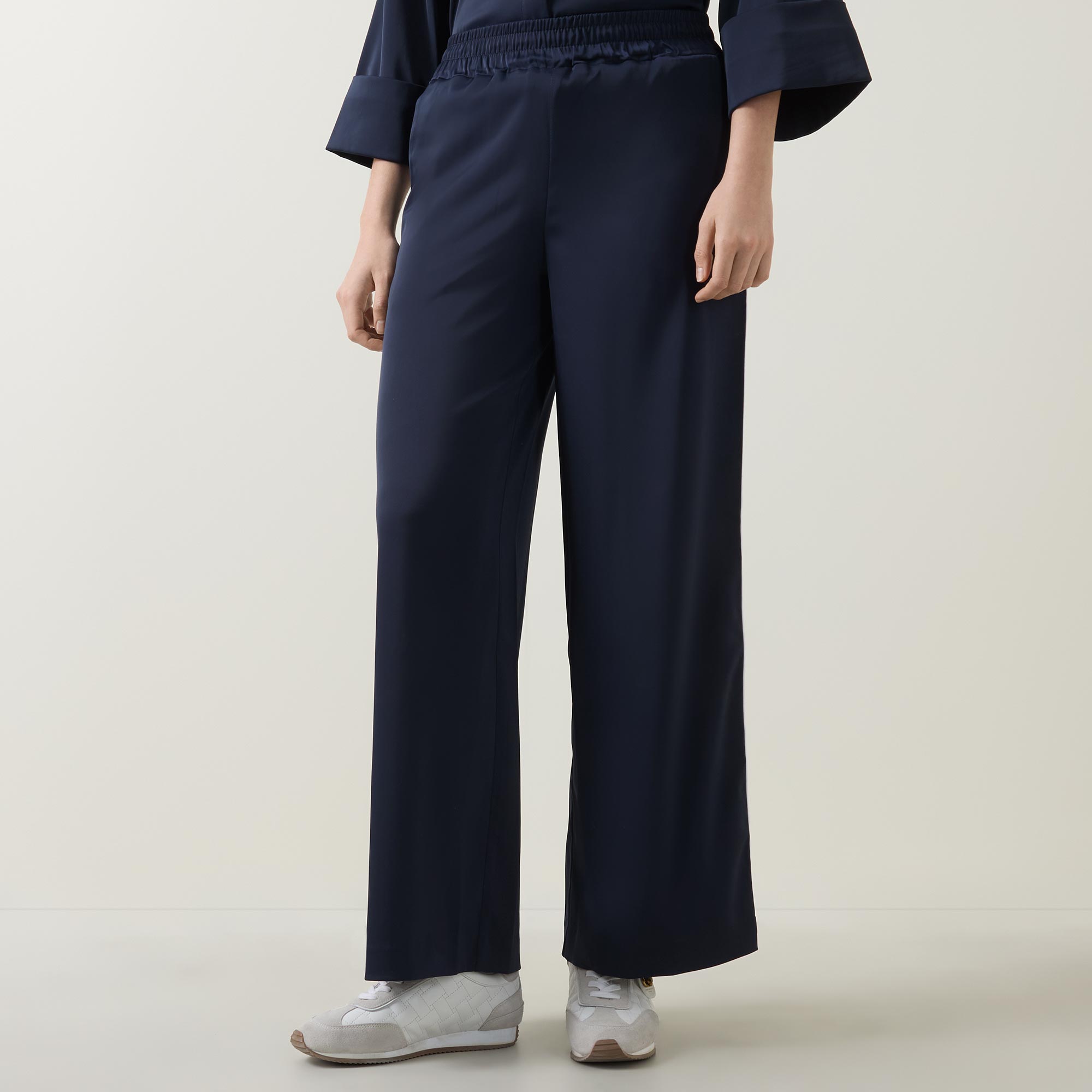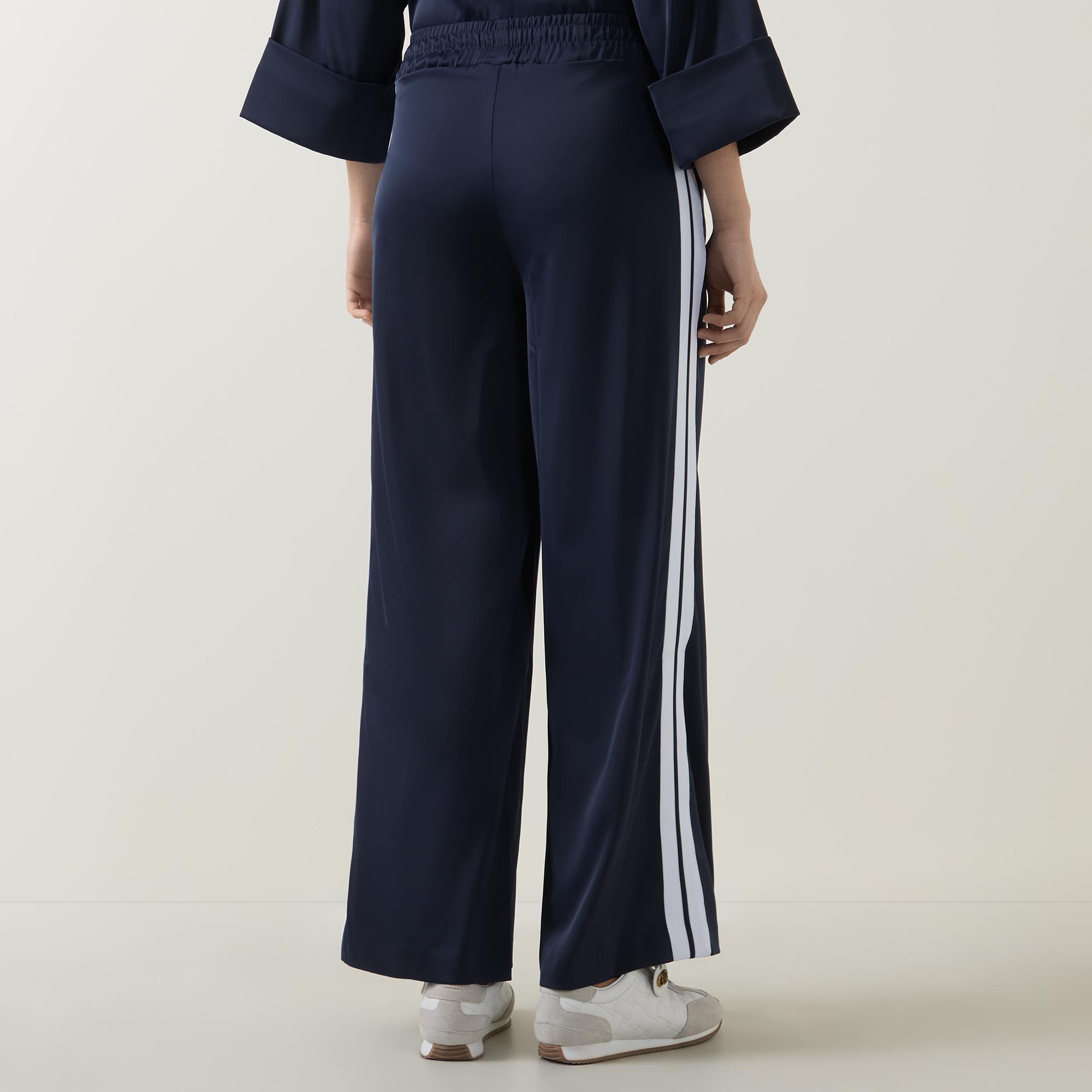 - Mid rise, wide leg, full length, covered elasticated waistband, two side entry pockets, clean hems, contrast stripe detailing along each leg, smooth finish
