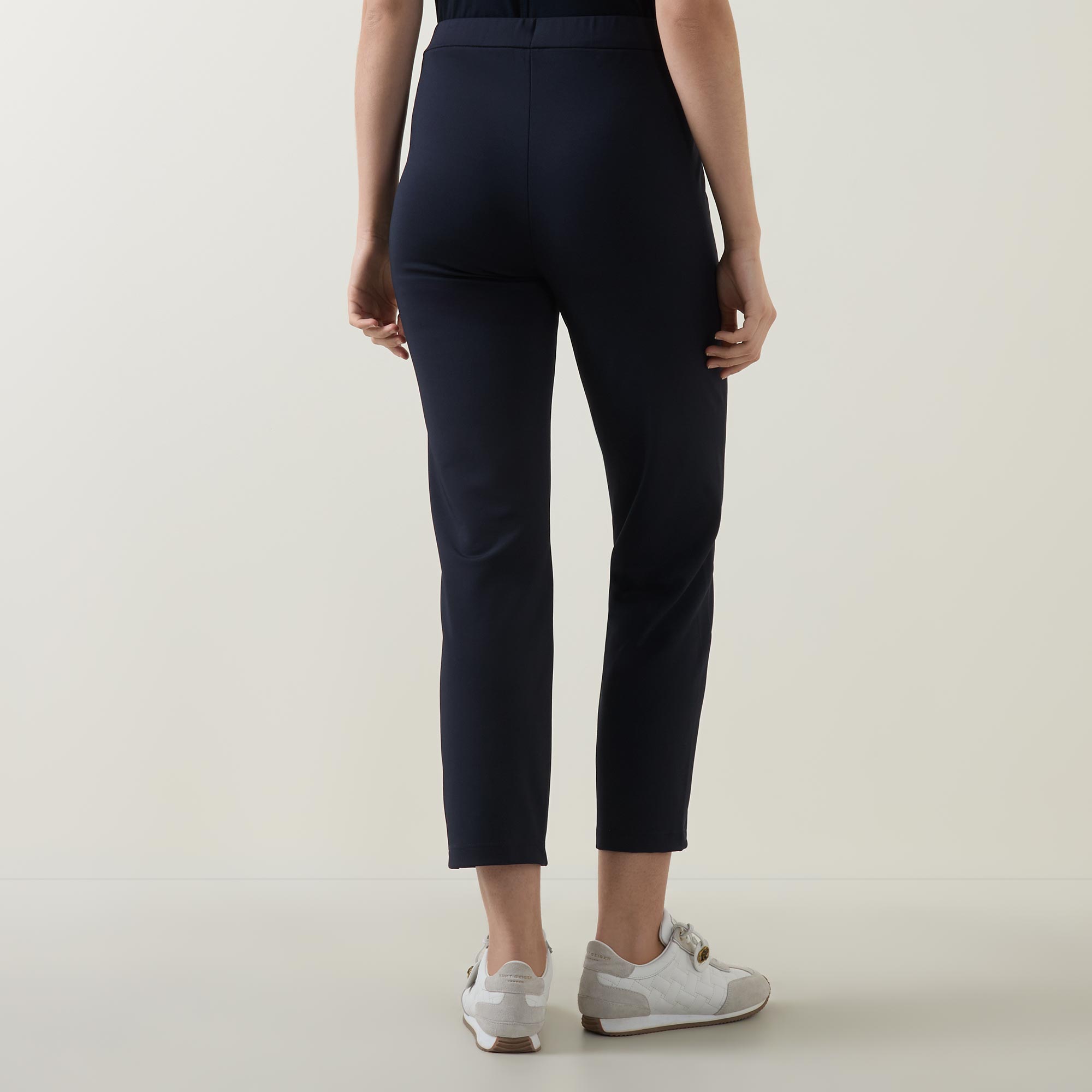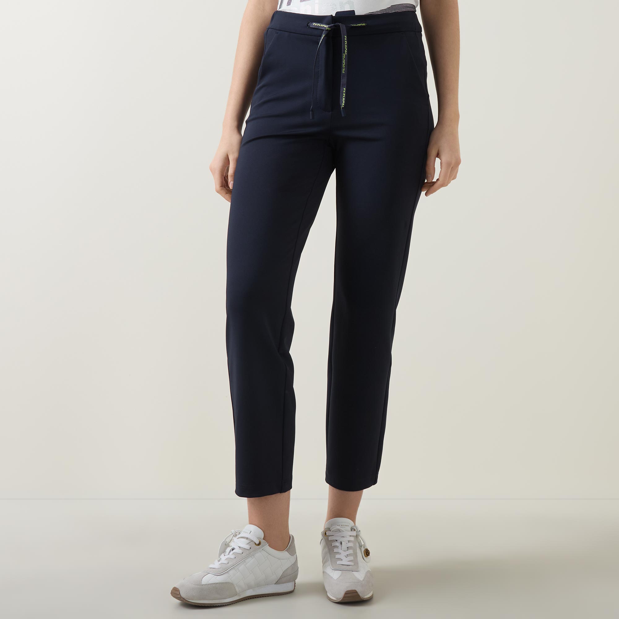 - Mid rise, slim leg, cropped length, covered waistband, concealed fly with hook and bar closure, additional drawstring fastening, two side entry pockets, clean hems, smooth finish