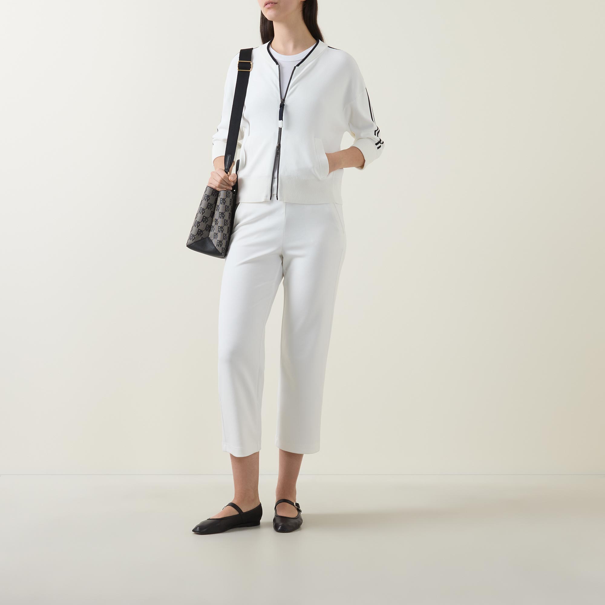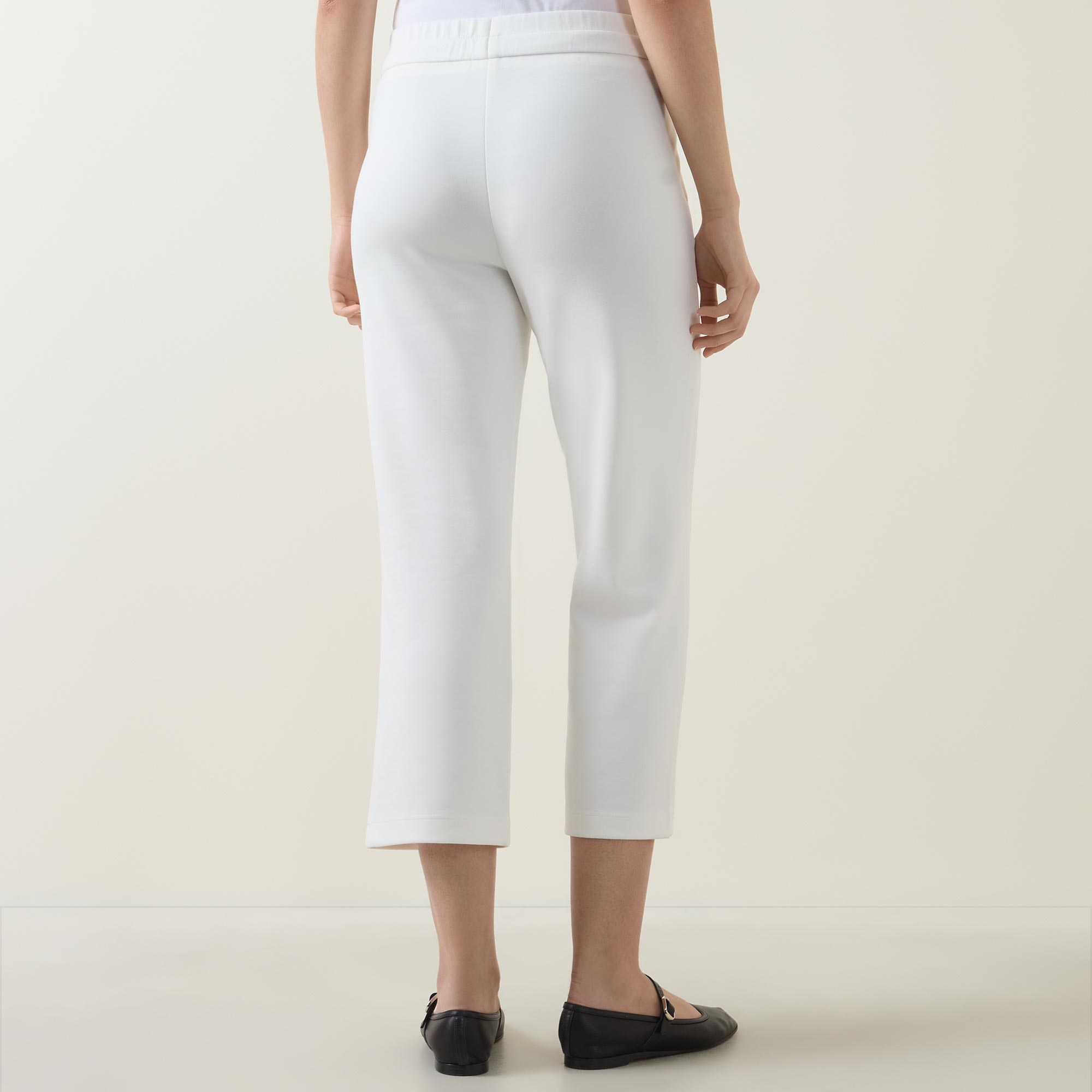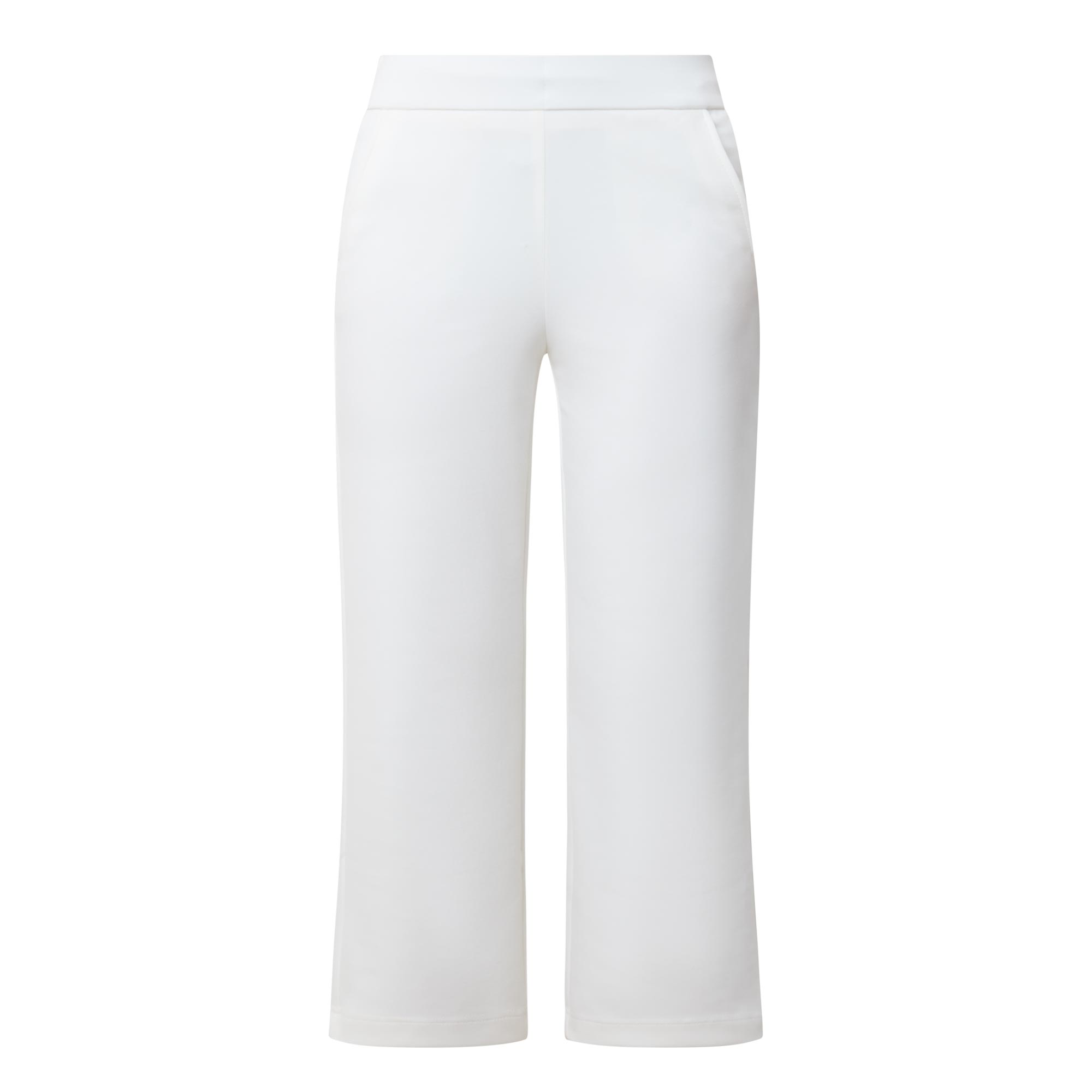 • Mid rise, slim leg, culotte silhouette, cropped length, wide elasticated waistband, two side entry pockets, clean hems, smooth finish