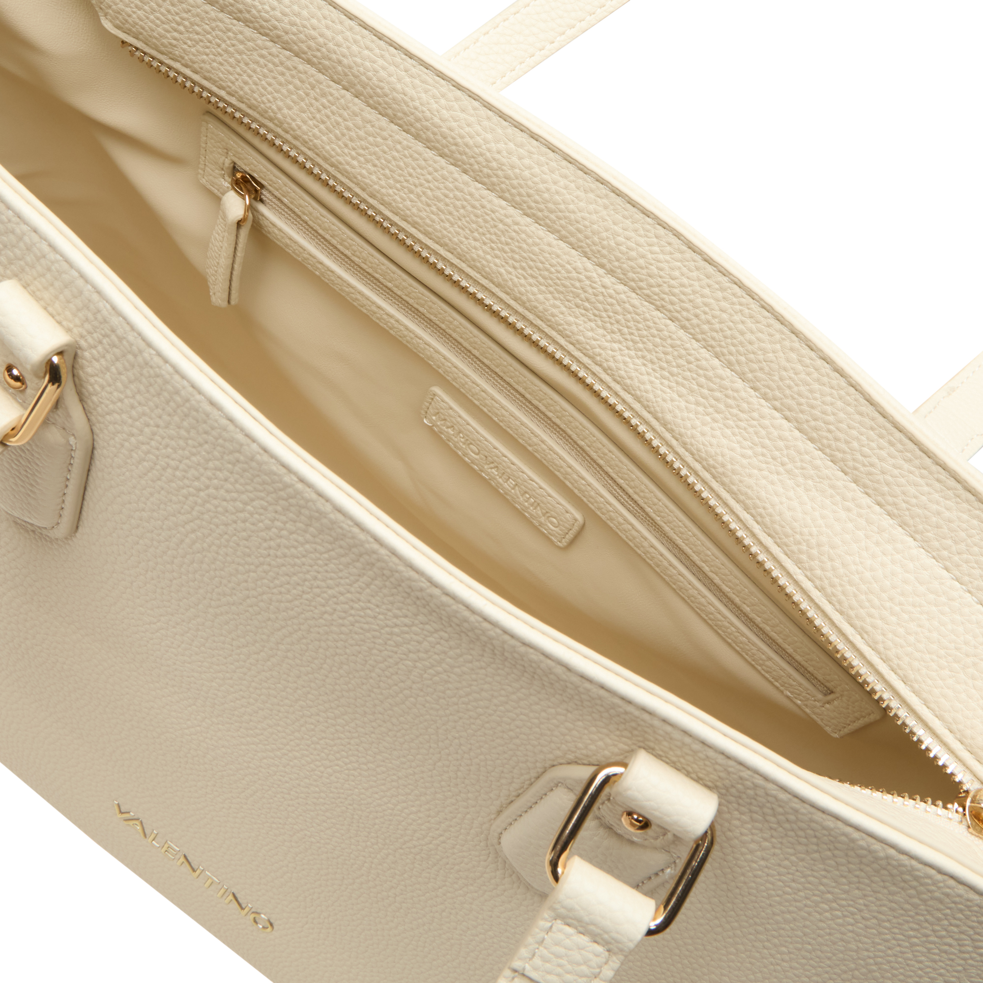 - Top handles, top zip fastening, structured silhouette, logo lettering, gold-tone hardware, textured finish