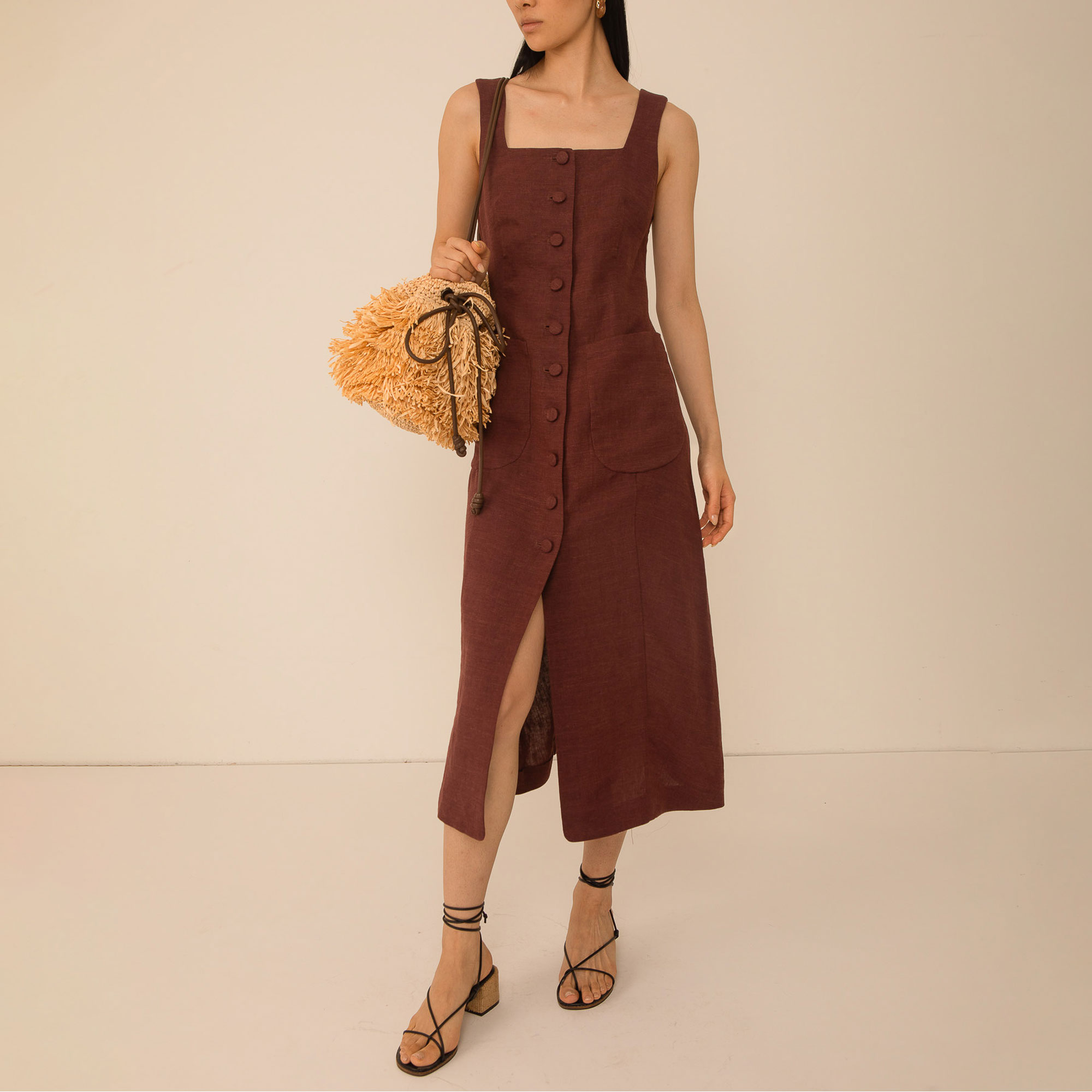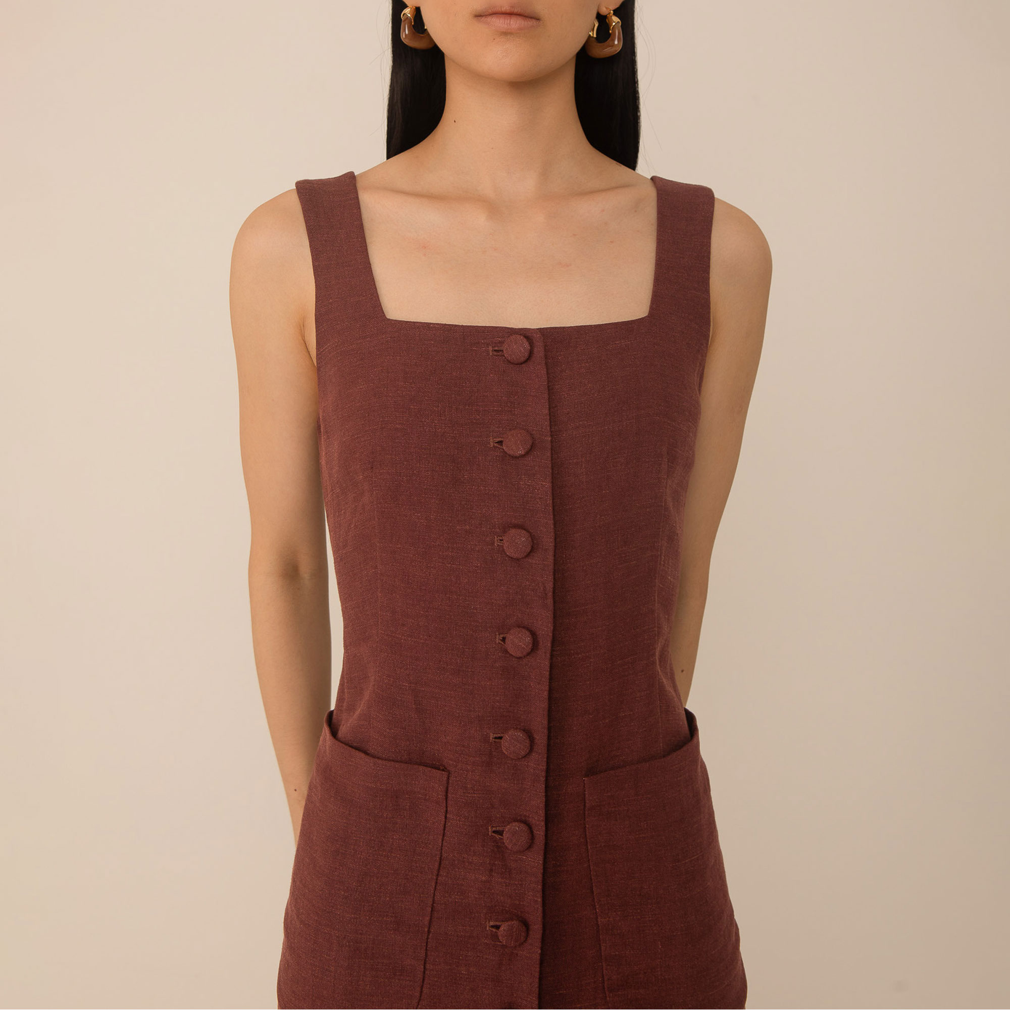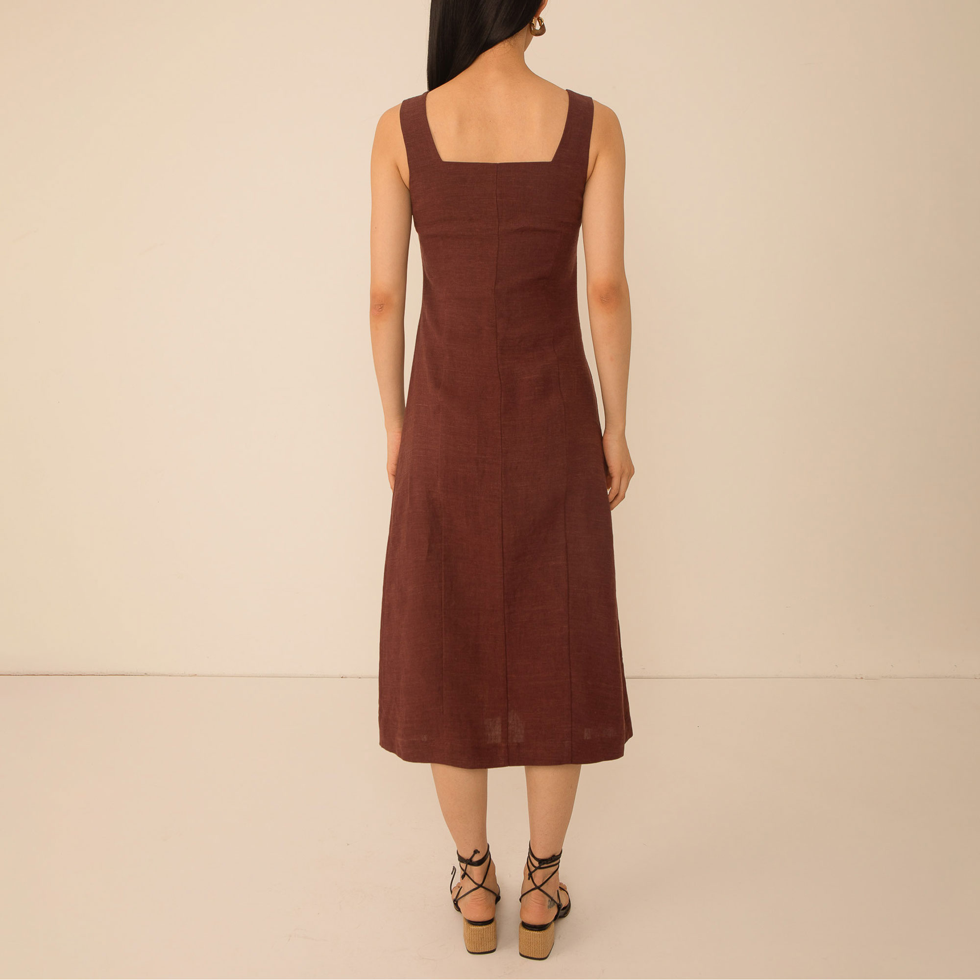 • Sleeveless, square neckline, button fastenings, midi length